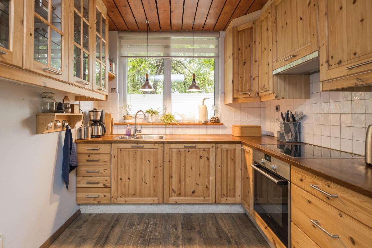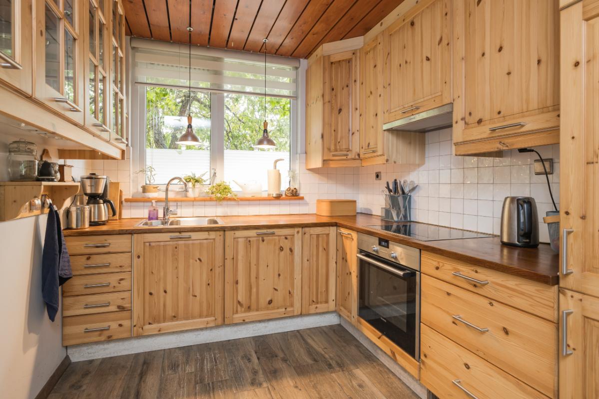 Ground Floor Layout Entrance hall with meter cupboard (5 groups + cooking group) and toilet in a light color scheme, equipped with a wall-mounted toilet and small sink. The spacious garden-facing living room features an attractive solid oak parquet floor, a practical under-stairs cupboard, and plenty of daylight thanks to the side window overlooking the adjacent green area. At the front is the semi-open L-shaped kitchen in a warm wood tone, fitted with various built-in appliances: ceramic hob, extractor hood, combi-oven, refrigerator, dishwasher, and plinth heating.