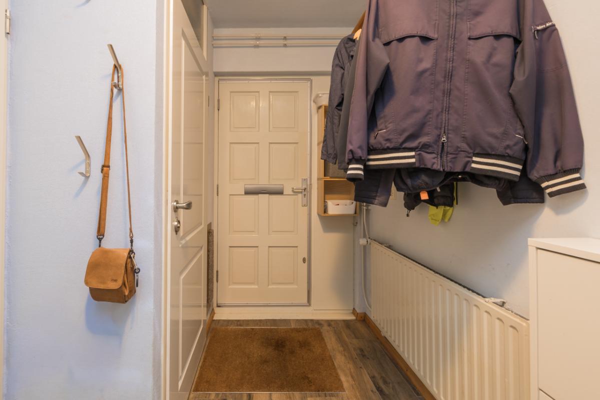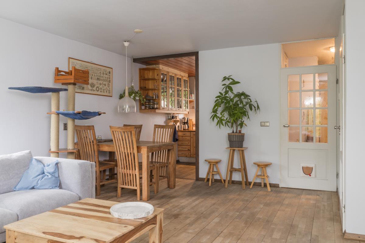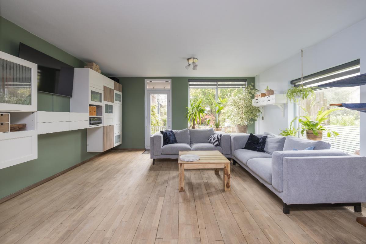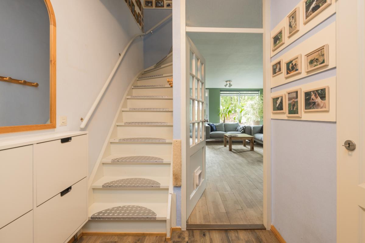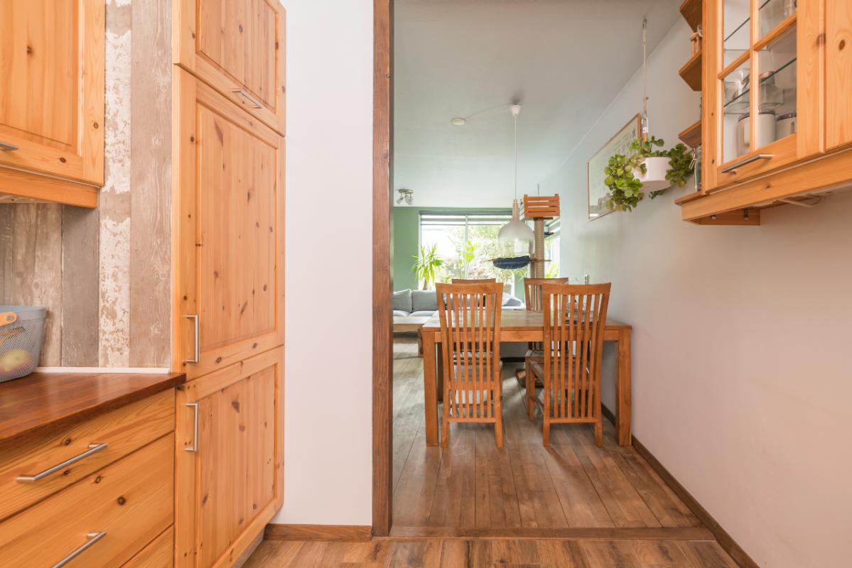 Indeling begane grond Entree, hal met meterkast (5 groepen + kookgroep) en toiletruimte in lichte kleurstelling met zwevend closet en fonteintje. De ruime, tuingerichte woonkamer is voorzien van een sfeervolle massief eikenhouten parketvloer, een praktische trapkast en geniet van veel daglicht dankzij het extra zijraam met uitzicht op het naastgelegen plantsoen. Aan de voorzijde bevindt zich de half open keuken in L-opstelling, uitgevoerd in een warme houtkleur en uitgerust met diverse inbouwapparatuur: keramische kookplaat, afzuigkap, combi-oven, koelkast, vaatwasser en plintverwarming.