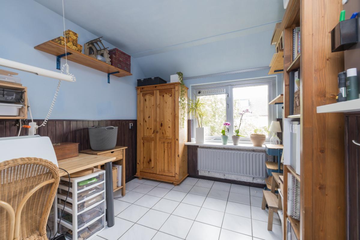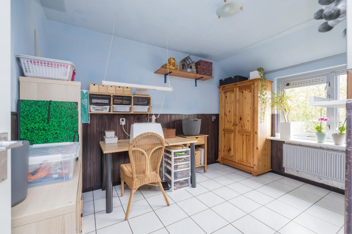 Garden The property features a well-kept front garden with decorative paving and green borders. The side garden provides access to the spacious northeast-facing backyard, with a depth of 14.75 meters and a width of 6.17 meters. On one side, the garden is separated by a brick wall, and there is an attached stone shed (5 m²). At the rear of the garden stands a wooden cabin (available for takeover) and access via a rear entrance. Thanks to the adjacent green area and the lawn at the side of the house, you can enjoy a wonderfully open and green feeling.