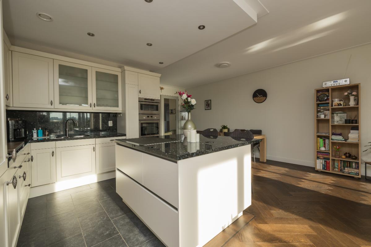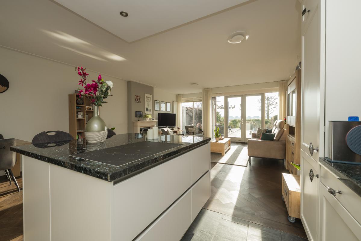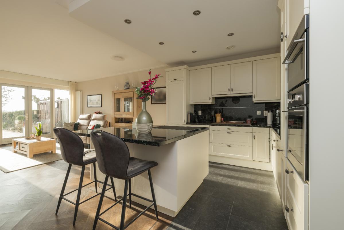 Aan de andere zijde van de woonkamer bevindt zich de ruime woon-eetkeuken. De keuken, in L-opstelling met eiland, is uitgevoerd in landelijke stijl met lichte kasten en lades en een donker granieten werkblad. Het eiland heeft een bargedeelte dat zowel bergruimte als een gezellige zitplek biedt. De keuken is voorzien van diverse inbouwapparatuur, waaronder kookplaat, afzuigkap, Quooker/heetwaterkraan, koel-/vriescombinatie, vaatwasser, oven en combi-oven.