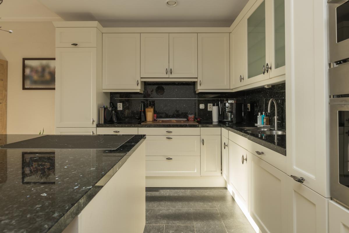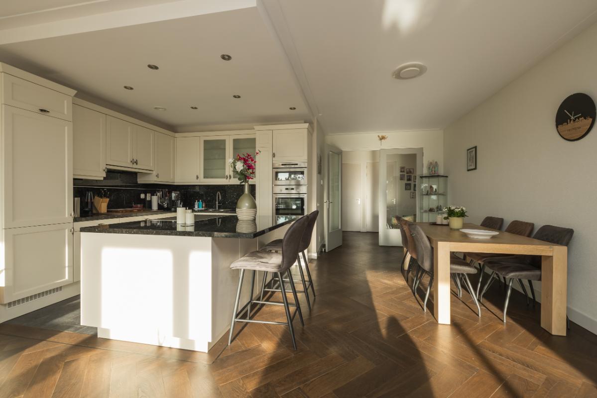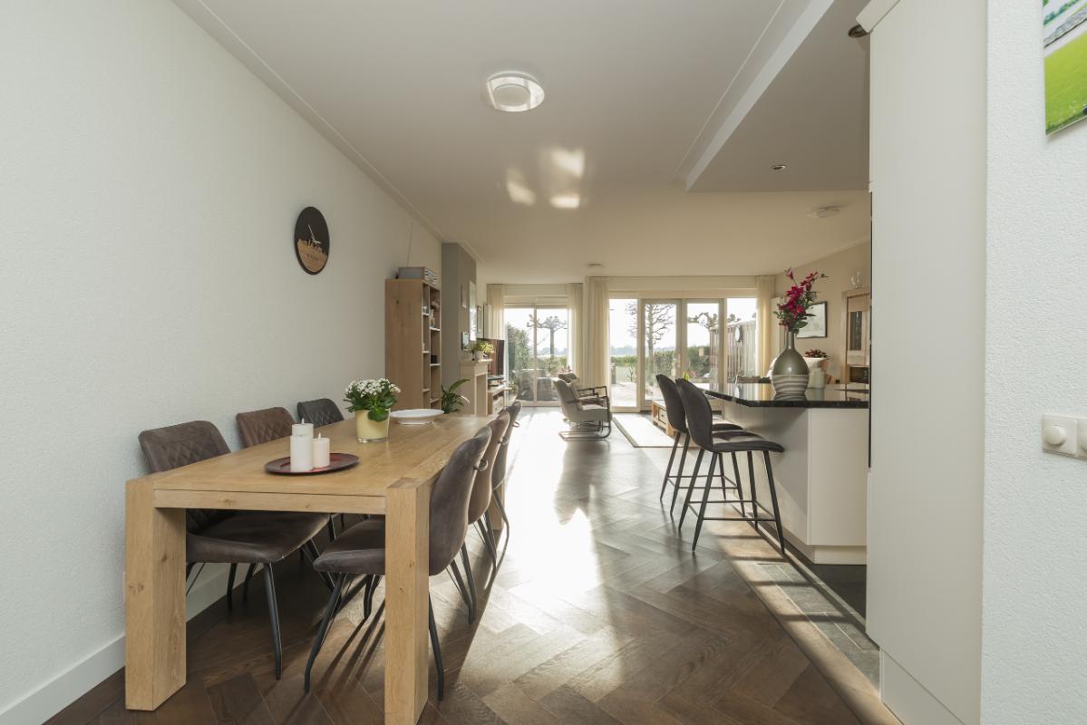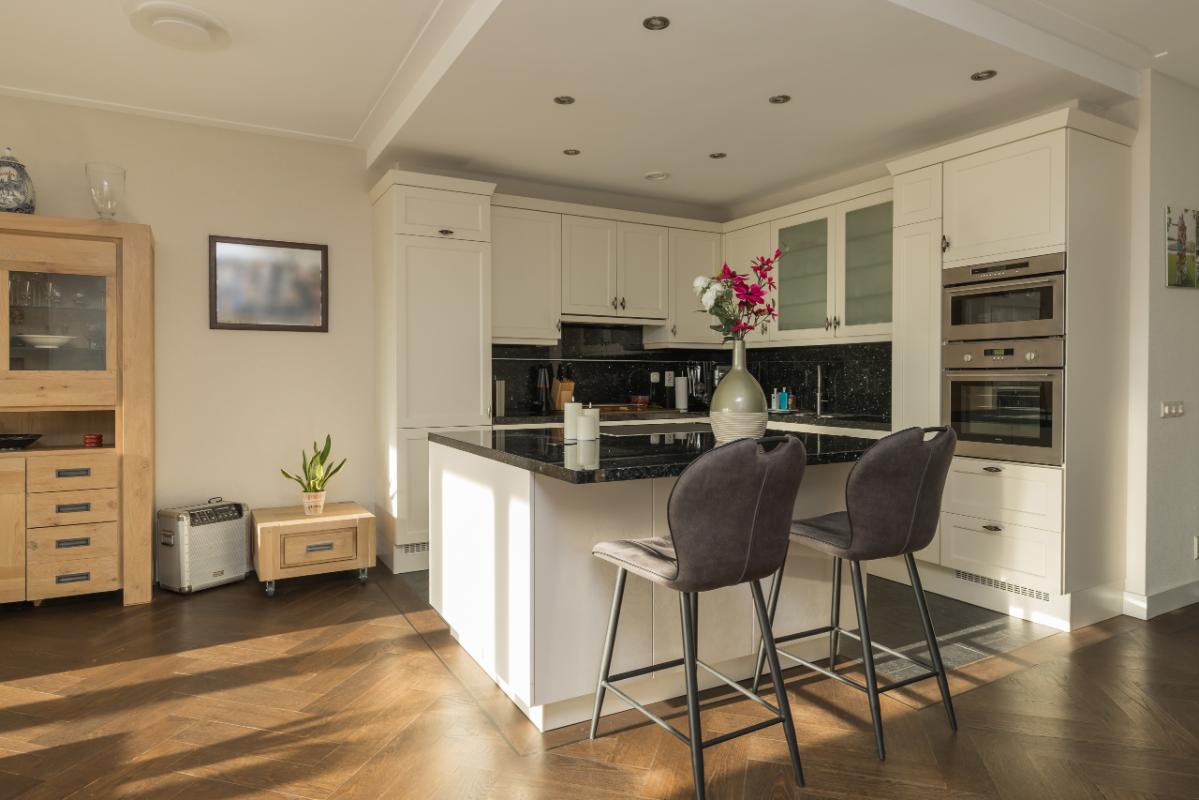 Aan de andere zijde van de woonkamer bevindt zich de ruime woon-eetkeuken. De keuken, in L-opstelling met eiland, is uitgevoerd in landelijke stijl met lichte kasten en lades en een donker granieten werkblad. Het eiland heeft een bargedeelte dat zowel bergruimte als een gezellige zitplek biedt. De keuken is voorzien van diverse inbouwapparatuur, waaronder kookplaat, afzuigkap, Quooker/heetwaterkraan, koel-/vriescombinatie, vaatwasser, oven en combi-oven.