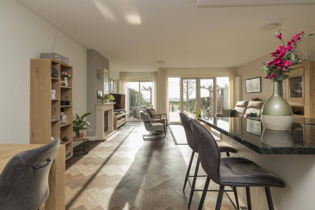 The spacious living room is accessible through double doors and offers a cozy sitting area on the garden side with an attractive fireplace surround and electric heater. Through the French doors, you step directly into the backyard, where you can enjoy views of the garden and the fields beyond. On the other side of the living room is the spacious open-plan kitchen with dining area. The kitchen, arranged in an L-shape with an island, is designed in a country style with light cabinets and drawers and a dark granite countertop. The island features a bar section that provides both storage space and a cozy seating area. The kitchen is equipped with various built-in appliances, including a cooktop, extractor hood, Quooker (instant hot water tap), fridge-freezer combination, dishwasher, oven, and combination microwave oven. The living room and hallway are finished with oak herringbone parquet flooring, contributing to the warm and stylish appearance of the apartment.