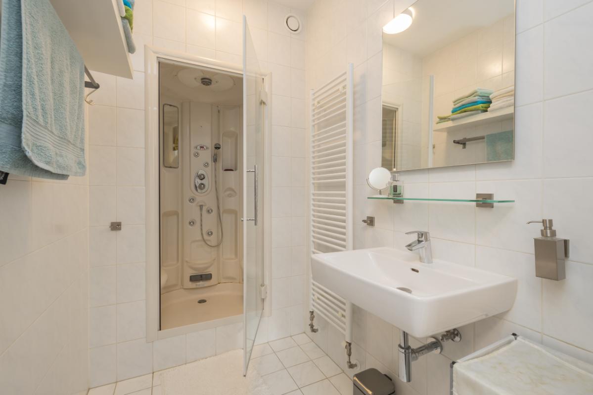 Layout – Ground Floor Apartment The apartment features a spacious entrance hall with video intercom, utility meter cupboard, and a toilet in light color tones with wall-mounted toilet and washbasin. From the hall, you can access the three bedrooms, all located at the front of the building. The master bedroom has an en-suite bathroom with bathtub, walk-in shower, vanity unit with cabinet, and a second toilet. The second bathroom at the front is equipped with a shower cabin and washbasin. There is also a separate laundry/boiler room with connections for washing appliances and the central heating combi boiler (Remeha, 2024).