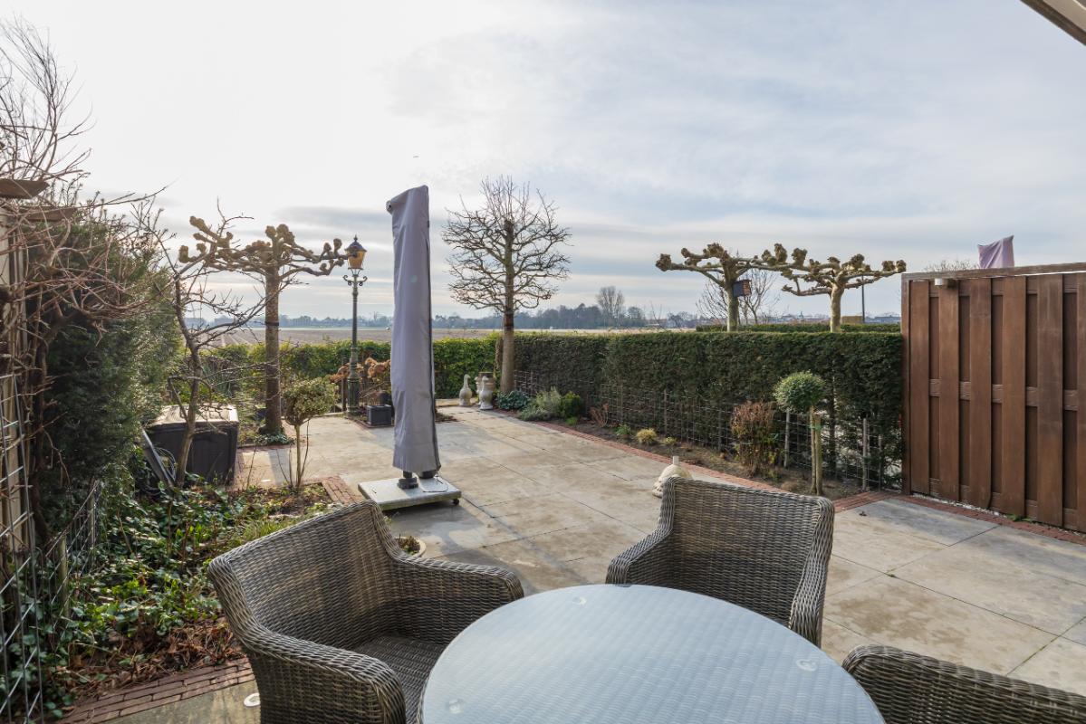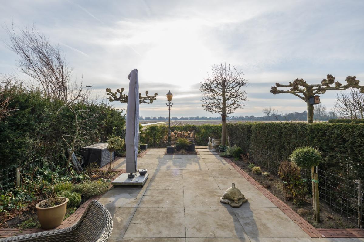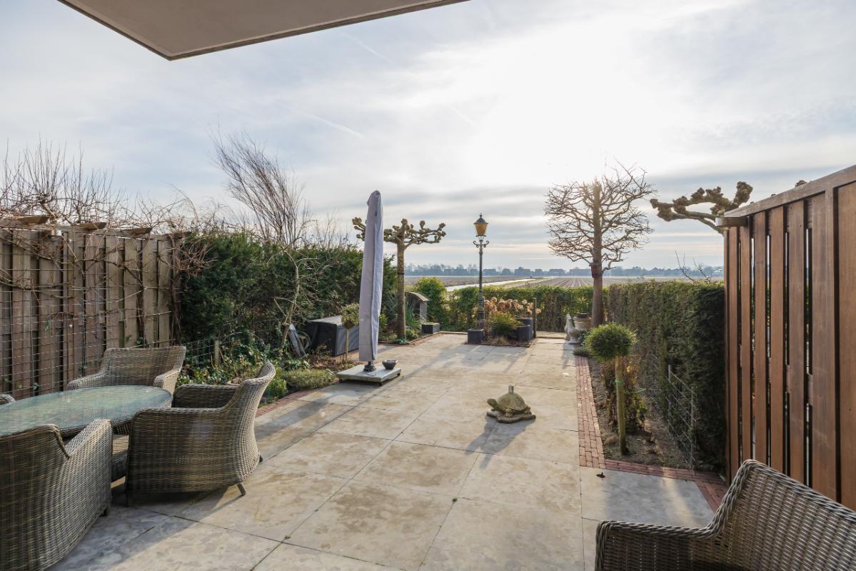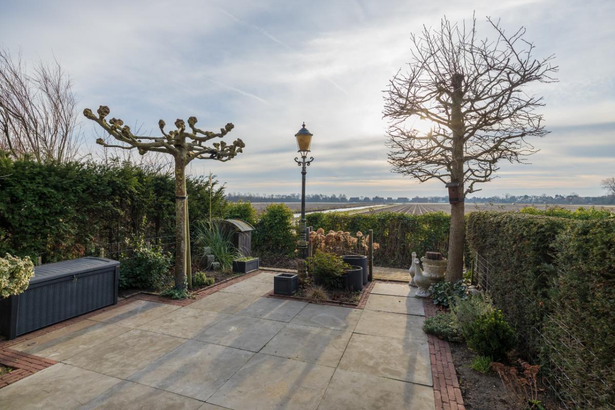 Garden The attractively landscaped backyard is approximately 11.60 meters deep and 5.85 meters wide and faces southwest, allowing you to fully enjoy the sun. The garden is stylishly designed with gray natural stone tiles, traditional clay pavers, and green borders, offering both sun and shade thanks to the electrically operated awning. At the rear of the garden, there is a terrace by the water, ideal for enjoying the rural setting and the magnificent wide views over the bulb fields.
