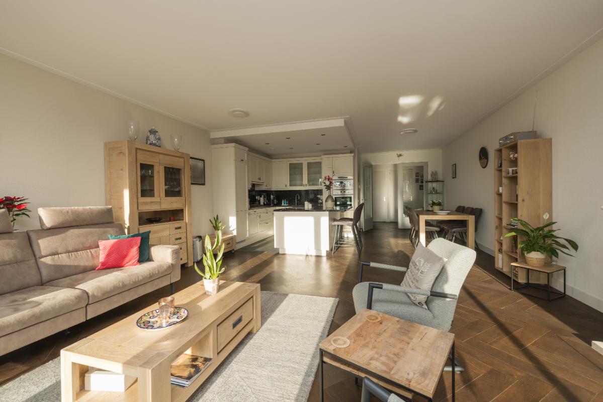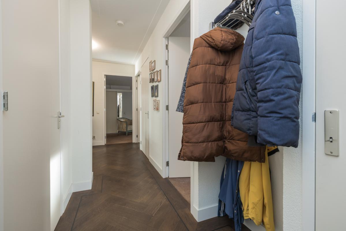 De woonkamer en hal zijn afgewerkt met een eikenhouten visgraatparketvloer, wat bijdraagt aan een warme en stijlvolle uitstraling van het appartement.