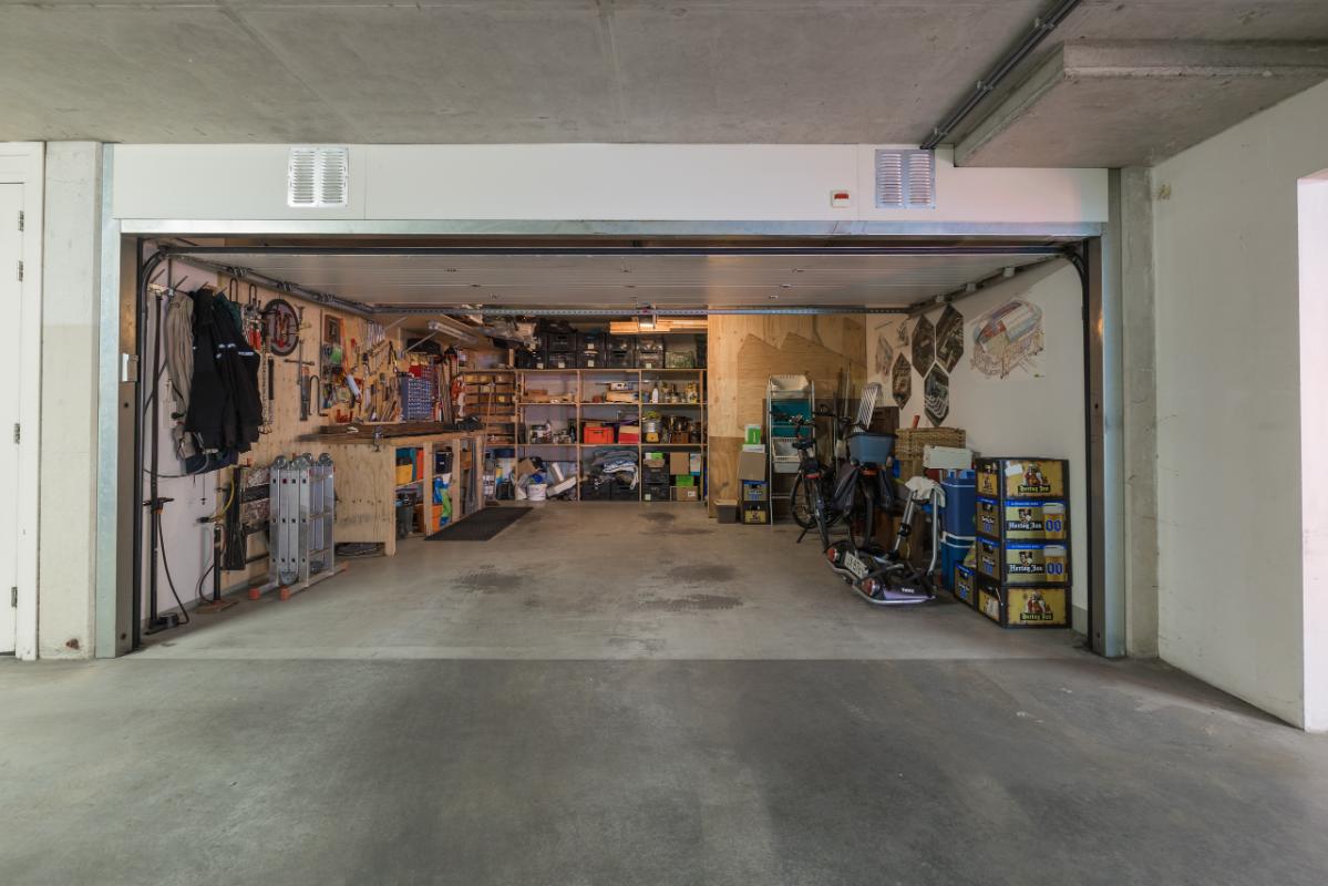 Garage en berging De parkeerkelder biedt een ruime dubbele garage (ca. 6,0 x 5,22 m) met elektrische roldeur, ideaal voor twee auto’s of extra opslag. Daarnaast is er een aparte berging (ca. 4,20 x 2,88 m), perfect voor fietsen, klusprojecten of als hobbyruimte.