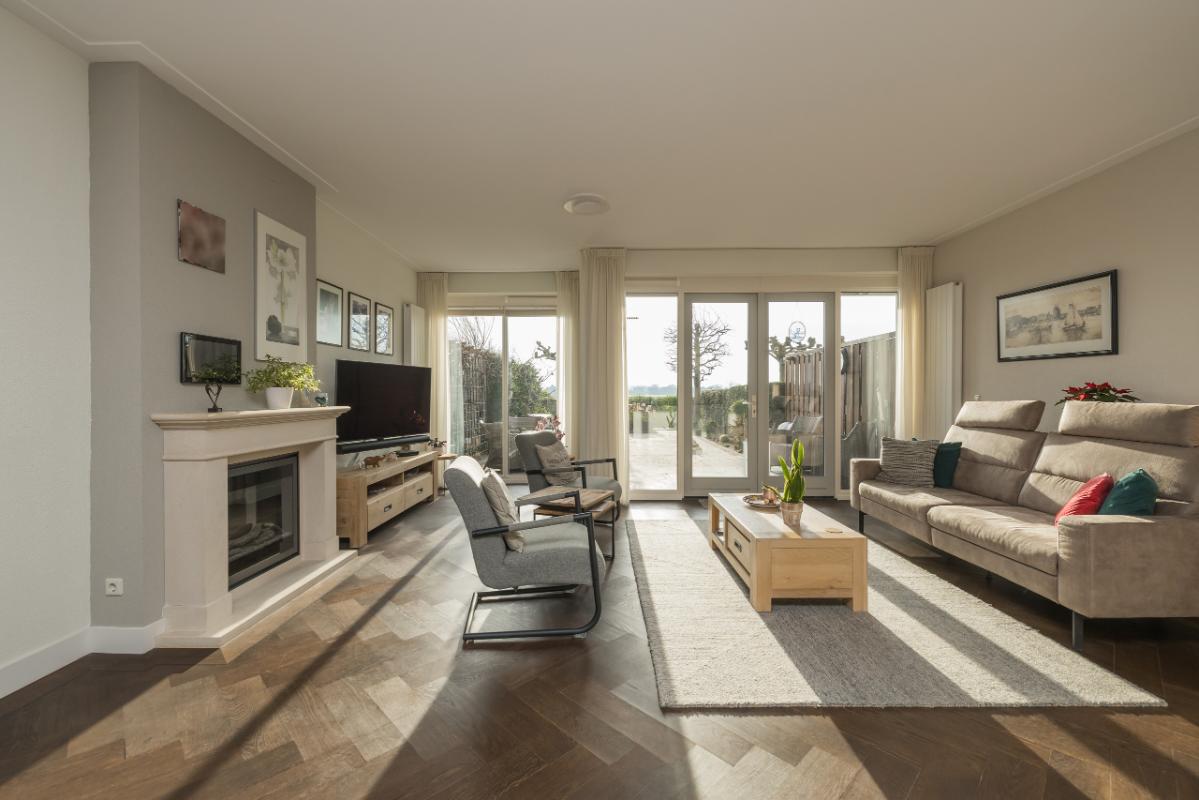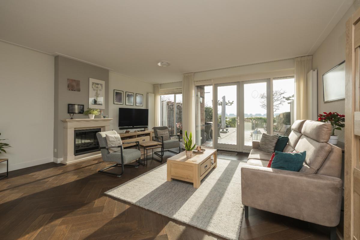 De ruime living is toegankelijk via dubbele deuren en biedt aan de tuinkant een gezellige zithoek met sfeervolle schouw en elektrische kachel. Via de openslaande deuren loopt u direct de achtertuin in, waar u geniet van uitzicht over de tuin en de achterliggende landerijen.