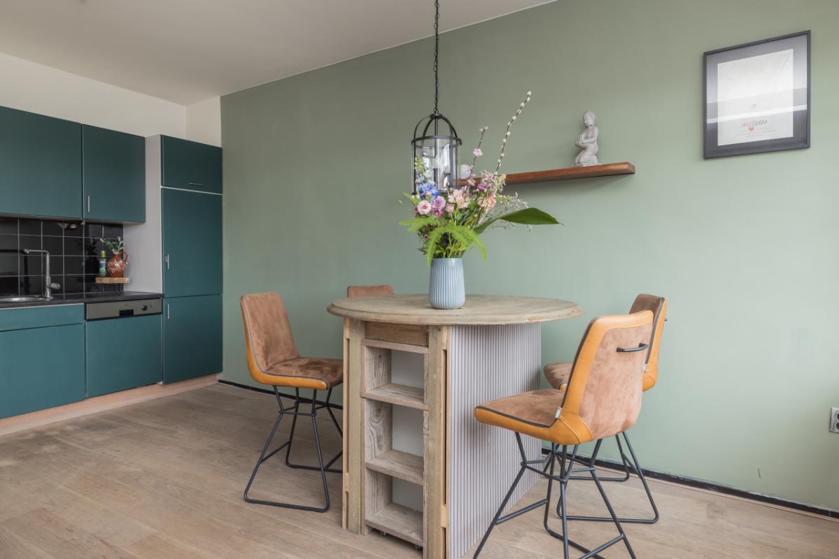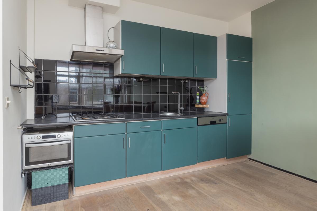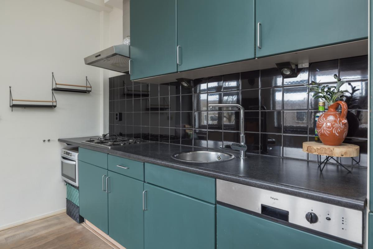 De open keuken sluit naadloos aan op de woonkamer en is uitgevoerd in een stoere zwart/petrol kleurstelling. De keuken is compleet uitgerust met een 4-pits gaskookplaat, afzuigkap, vaatwasser en koel/vriescombinatie.