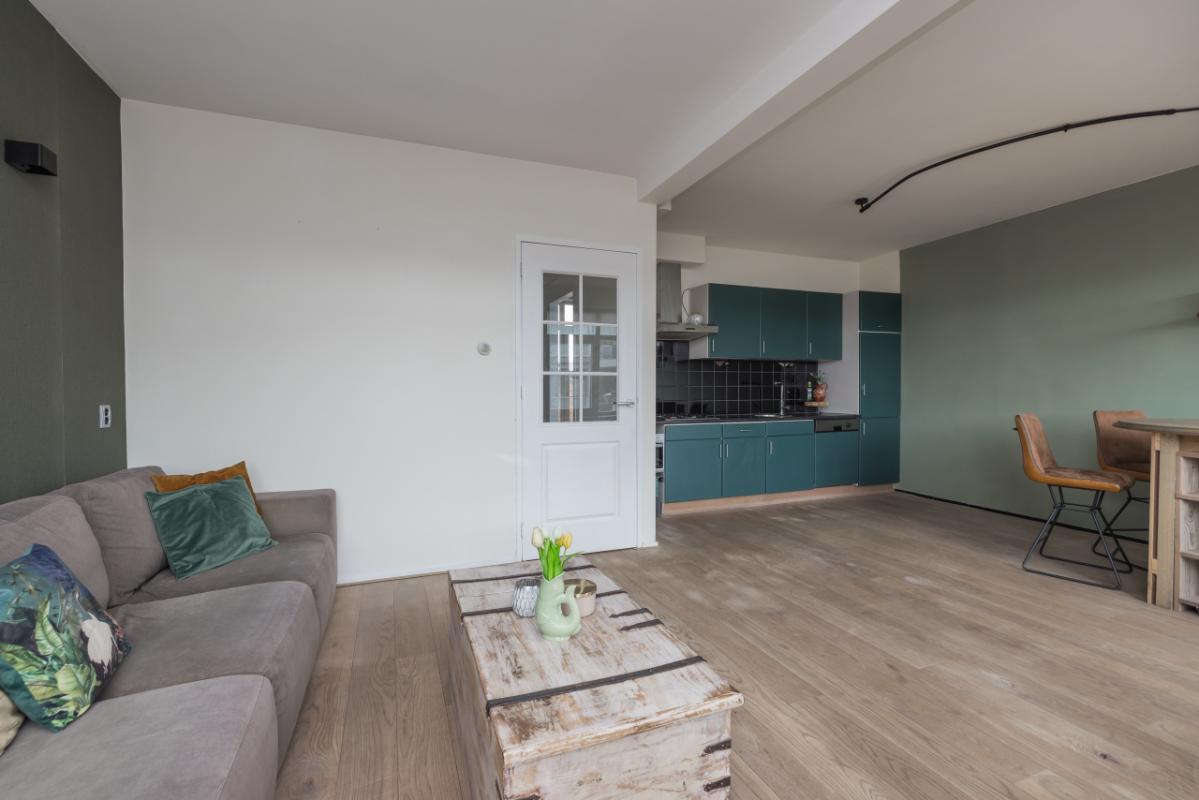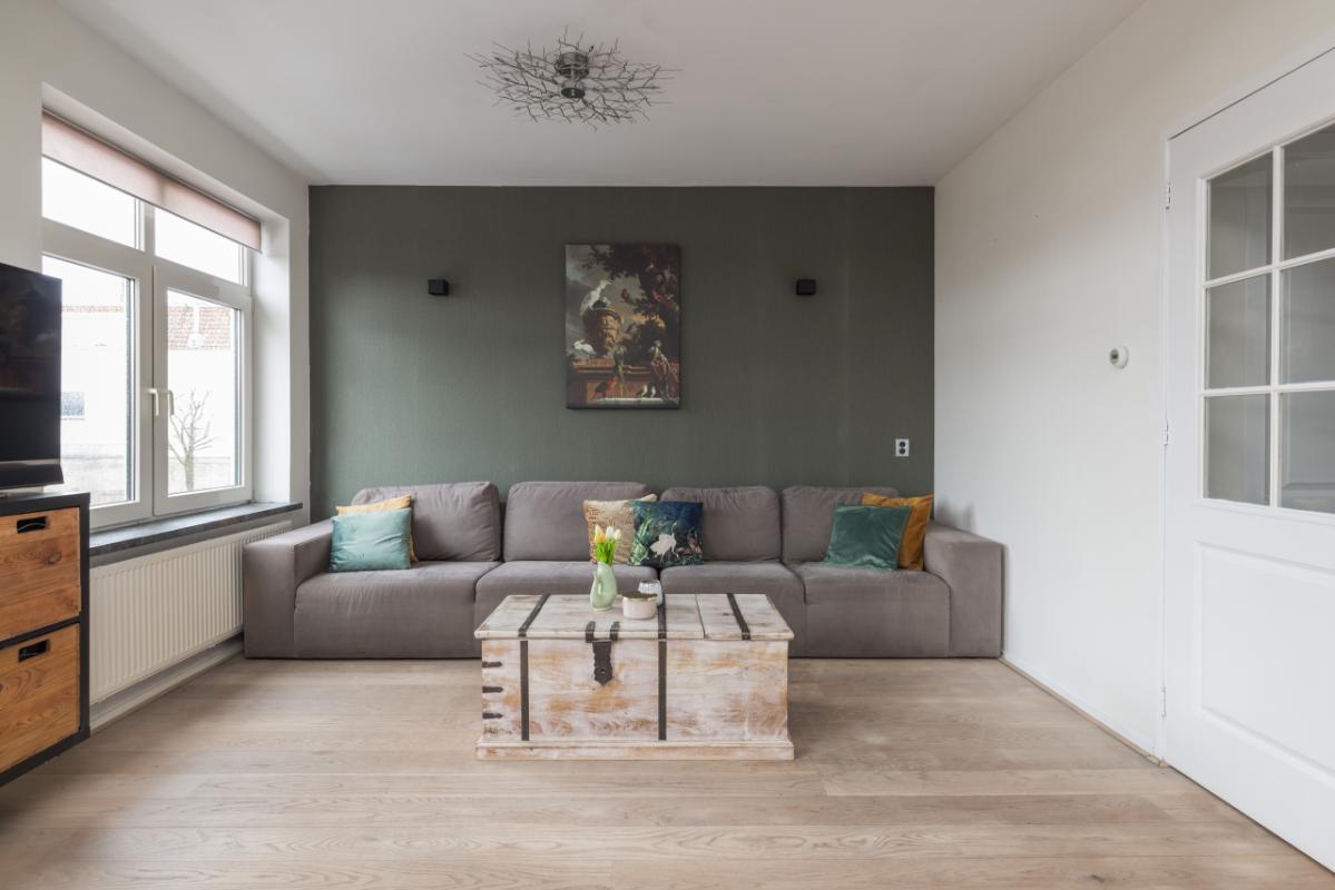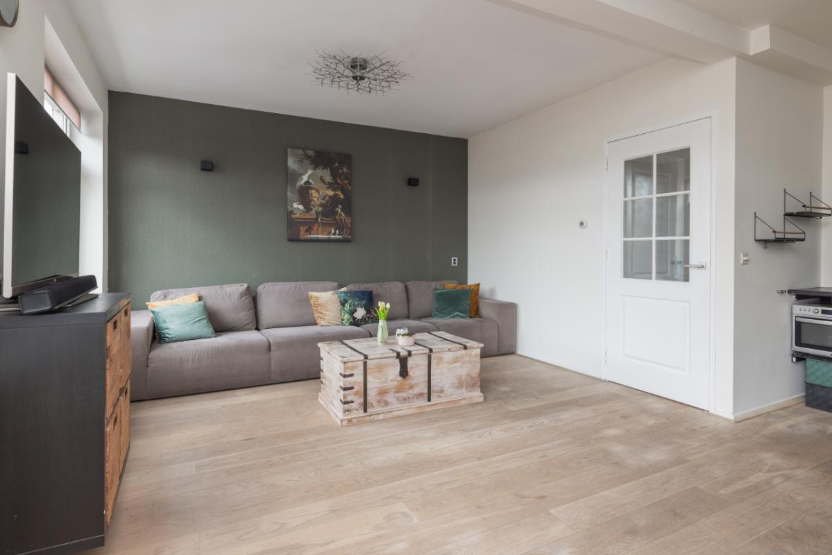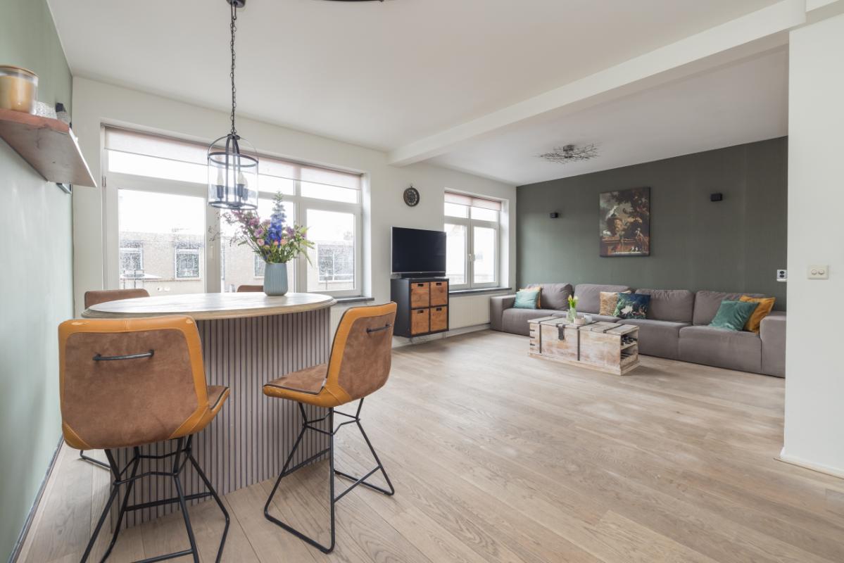 De lichte woonkamer bevindt zich aan de voorzijde van de woning en biedt dankzij de ruime raampartijen een levendig uitzicht over de gezellige winkelstraat.