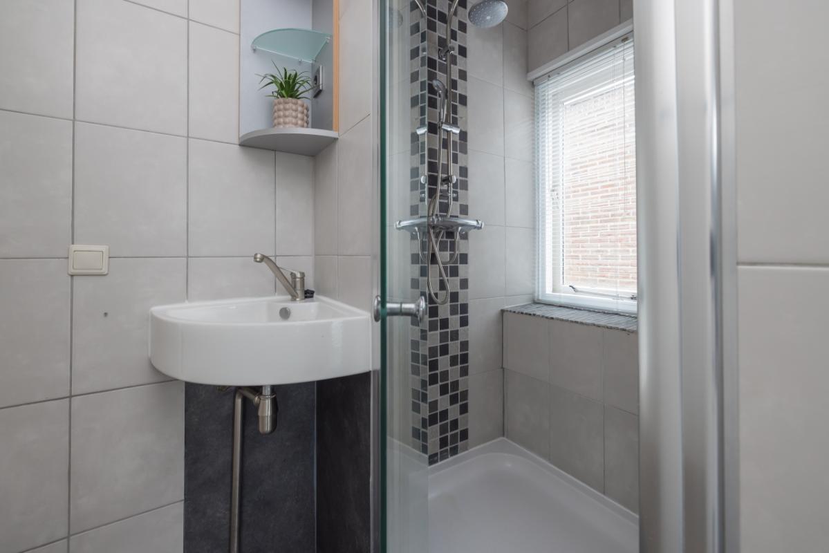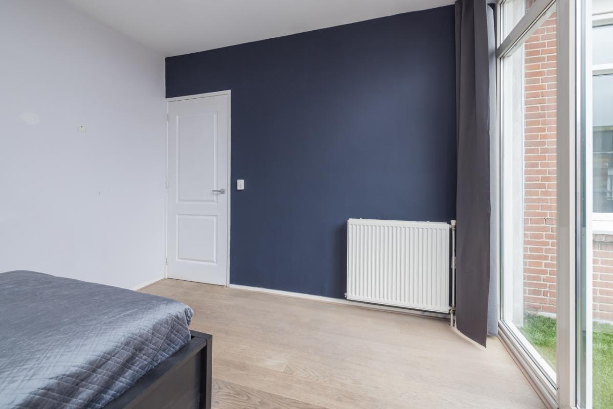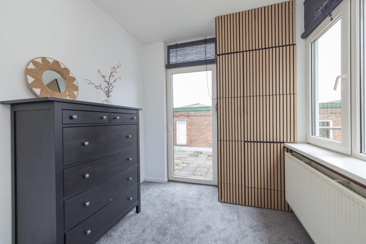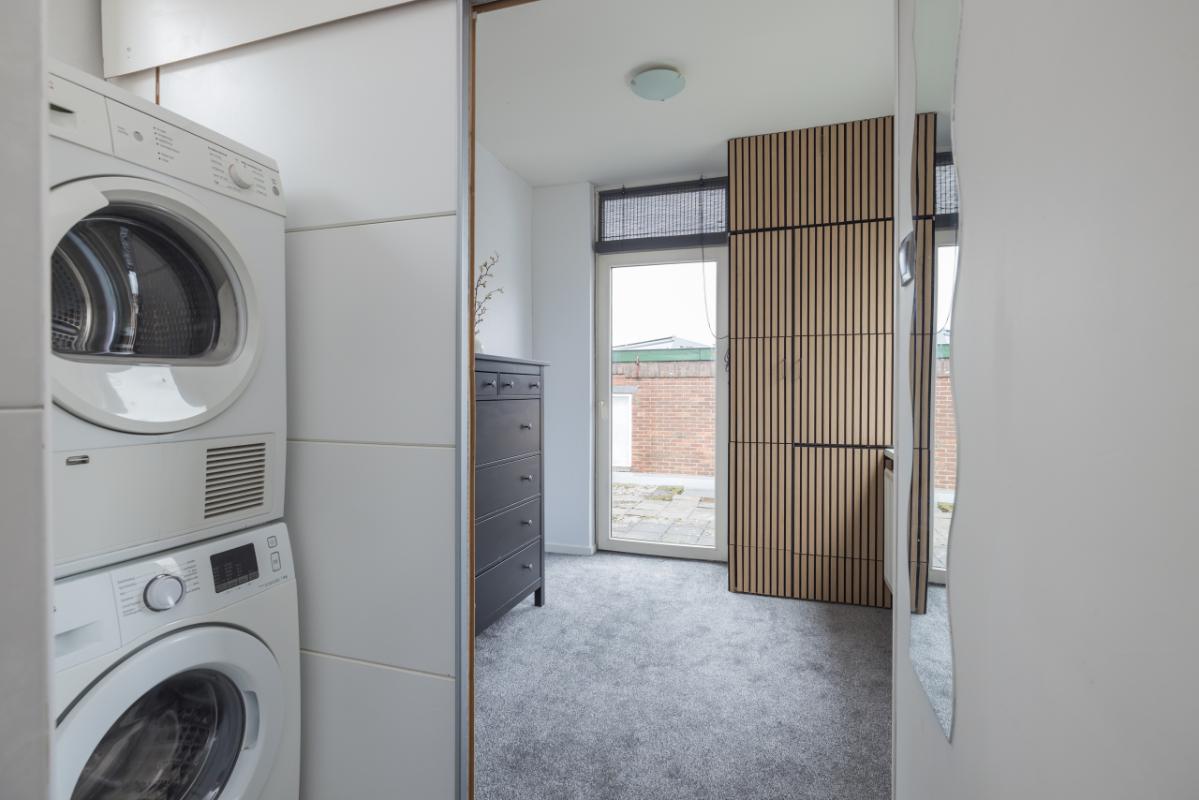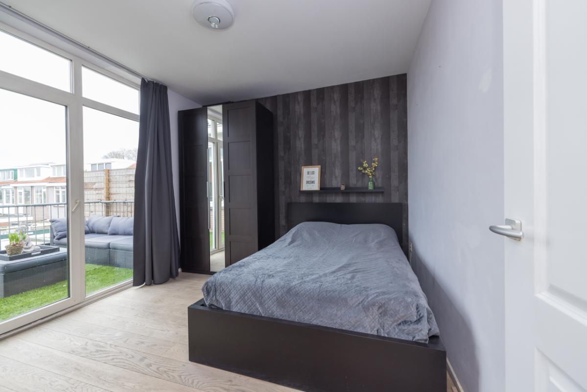 Aan de achterzijde van de woning bevindt zich een fijne slaap- of studeerkamer met een deur naar buiten (dit gedeelte van het dak mag overigens niet gebruikt worden als dakterras). De meterkast is netjes weggewerkt in een vaste kast.