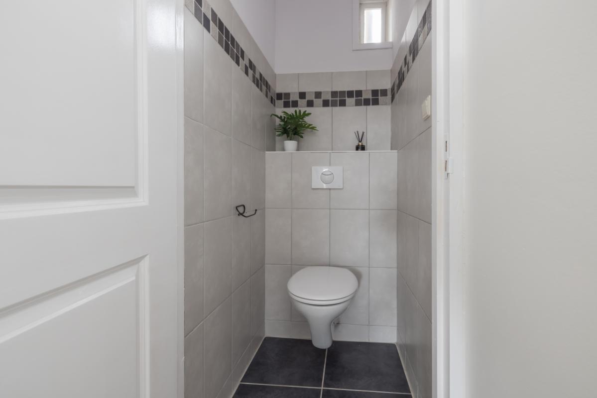 1e Etage: Je komt binnen in de centrale hal voorzien van intercominstallatie en aparte toiletruimte. Dit moderne toilet is stijlvol uitgevoerd in grijs/antraciet kleurstelling en voorzien van een wandcloset. Om de hoek bevindt zich de douchegelegenheid, wastafel en aansluitingen voor de wasmachine en droger.