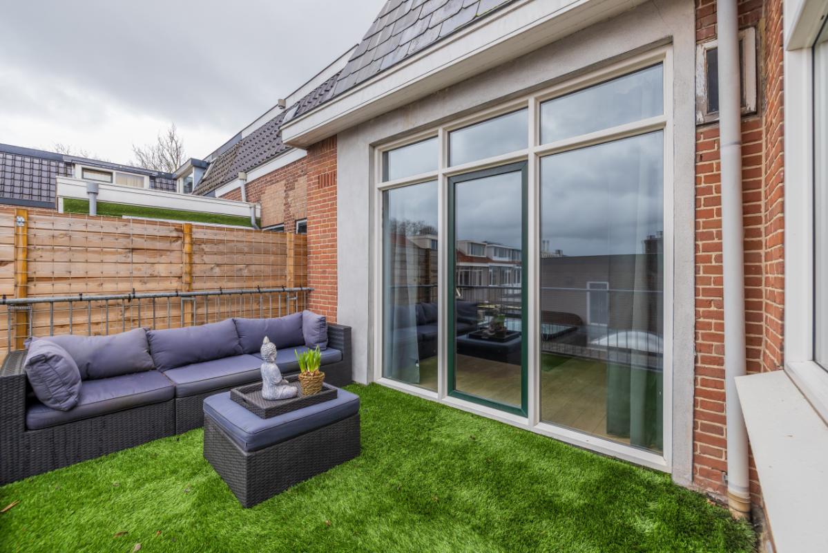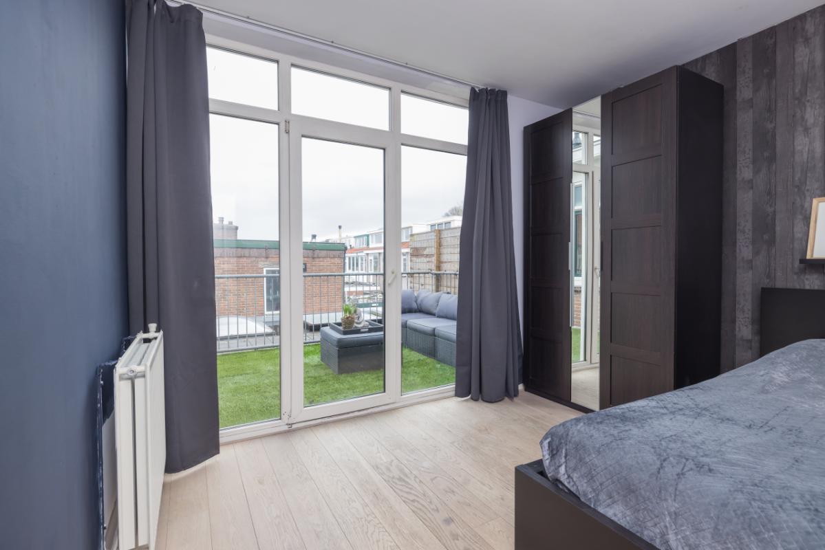 Ook de royale (ouder)slaapkamer bevindt zich aan de achterzijde en biedt toegang tot het zonnige dakterras op het zuid-oosten. Dit terras is voorzien van onderhoudsvriendelijk kunstgras en vormt een heerlijk plek om te ontspannen.