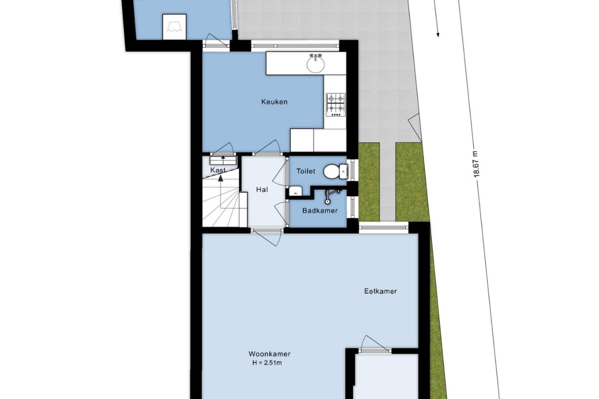 Begane grond Entree met hal voorzien van de meterkast (5 groepen en aardlekschakelaar). De lichte L-vormige woonkamer is voorzien van een erker aan de voorzijde, wat zorgt voor extra licht en ruimte. Vanuit de woonkamer kom je in de tussenhal met trapopgang naar de eerste verdieping, de badkamer met ruime inloopdouche en de aparte toiletruimte met wastafel. Aan de achterzijde bevindt zich de woonkeuken in U-opstelling, uitgevoerd in een lichte kleurstelling en voorzien van oven, gaskookplaat, afzuigkap en koel-/vriescombinatie. Aansluitend is de praktische bijkeuken bereikbaar, met aansluiting voor de wasmachine, extra bergruimte en een deur naar de achtertuin.