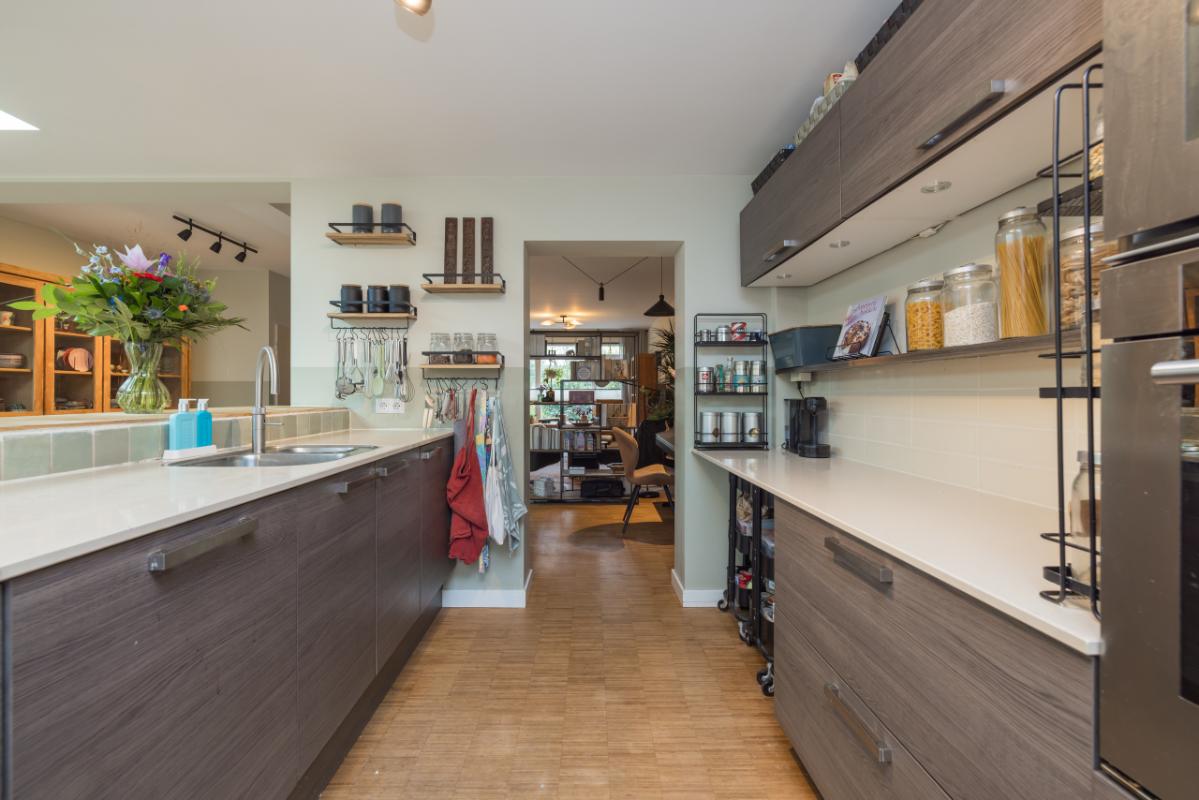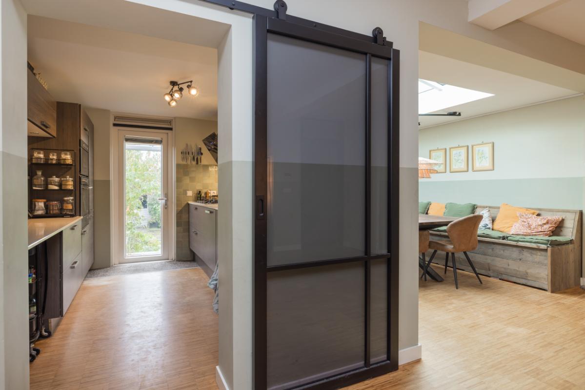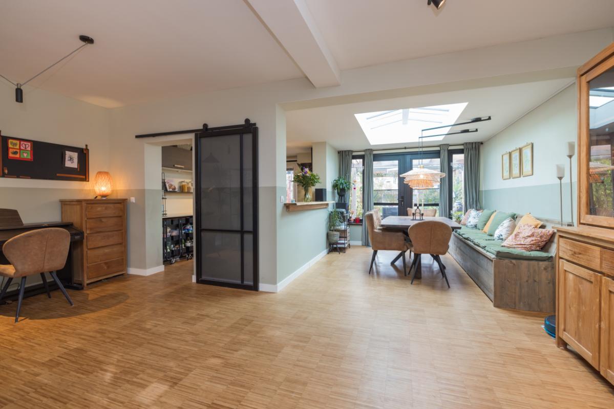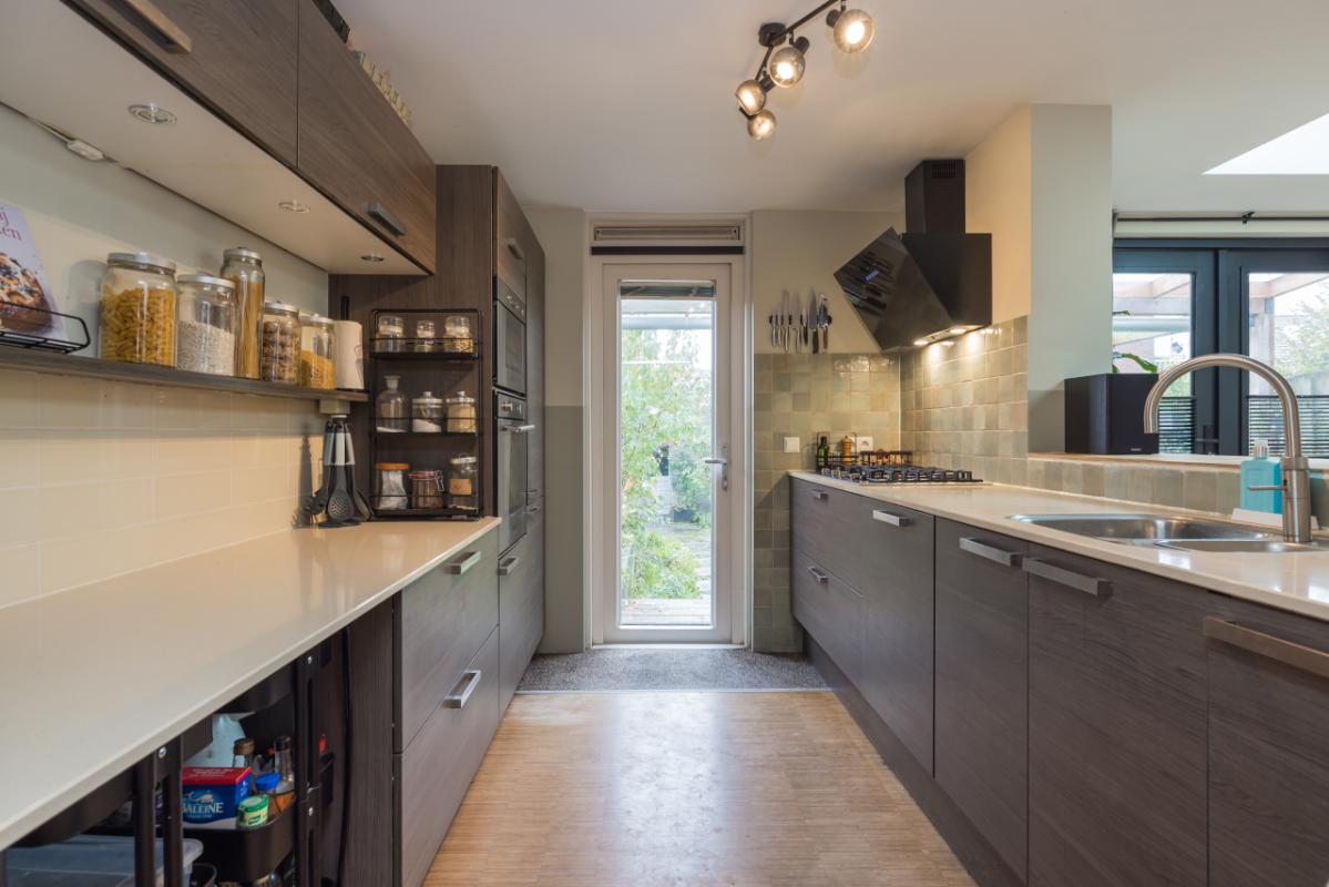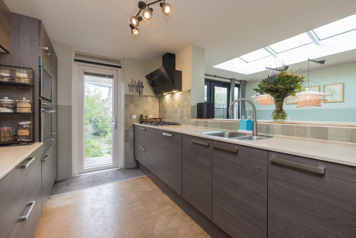 De half open keuken is bereikbaar via een fraaie schuifdeur en beschikt over houtlook kasten en lades, een licht werkblad met bar, veel bergruimte en moderne inbouwapparatuur, waaronder een 5-pitsgaskookplaat, afzuigschouw (recirculatie), combi-oven, magnetron, vaatwasser en kokendwaterkraan (Quooker). De gehele begane grond is voorzien van een bamboeparketvloer met comfortabele vloerverwarming, wat bijdraagt aan de warme en sfeervolle uitstraling van de woning.
