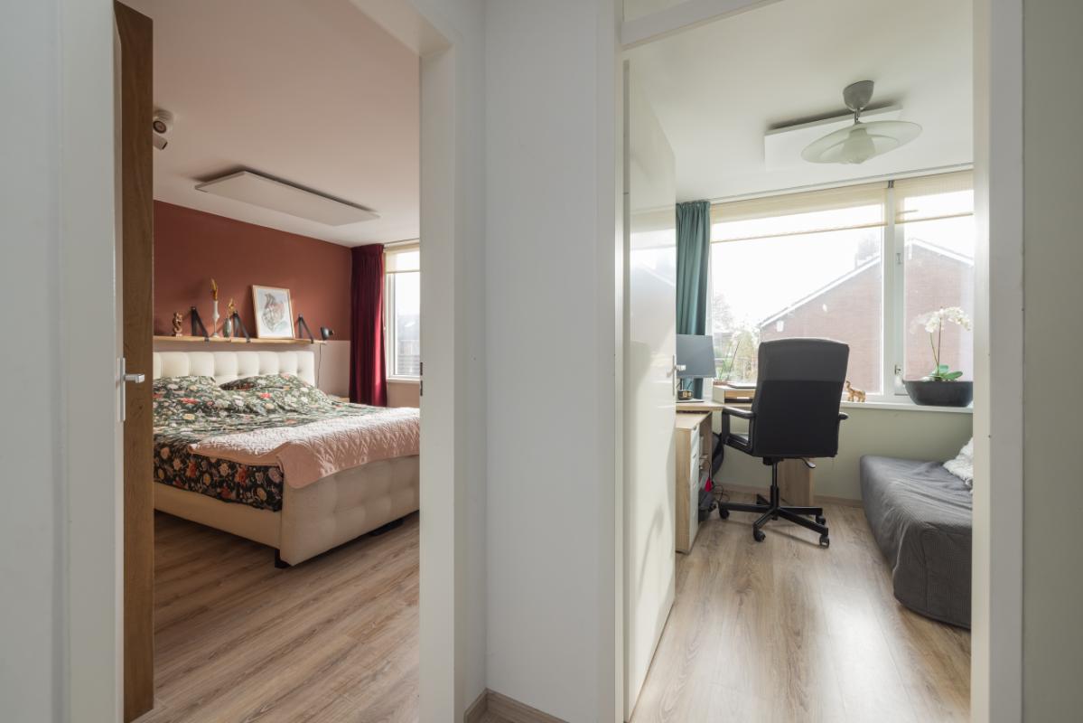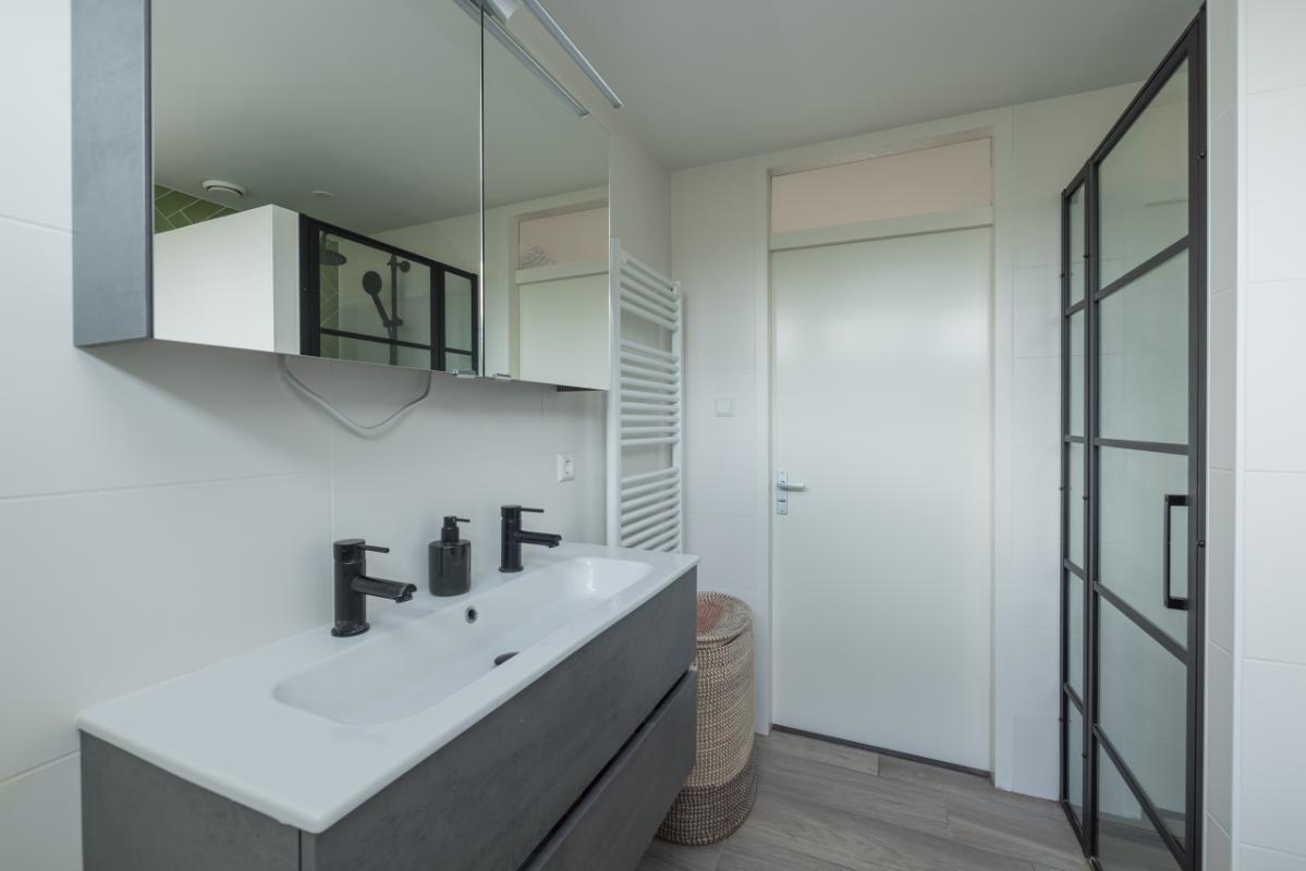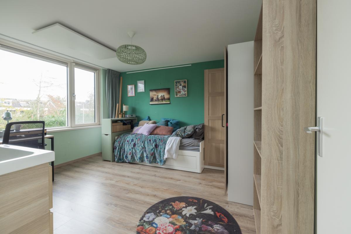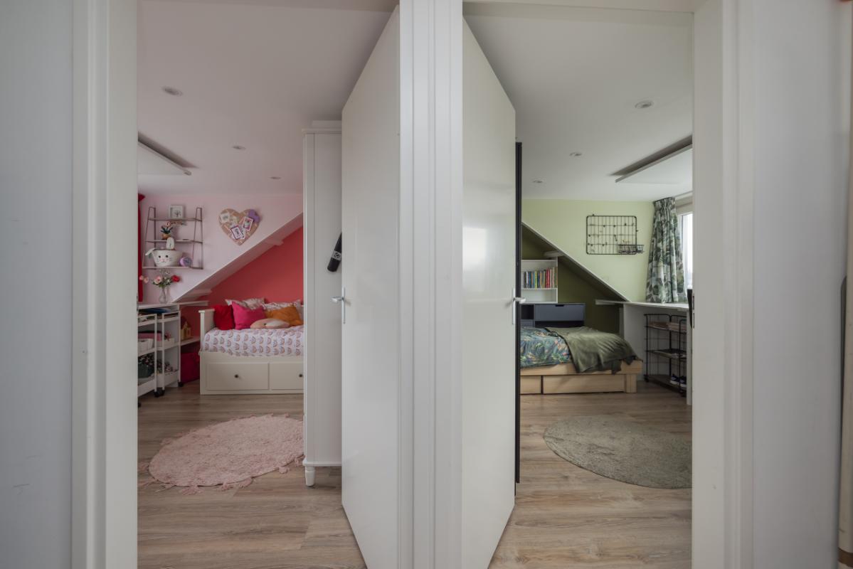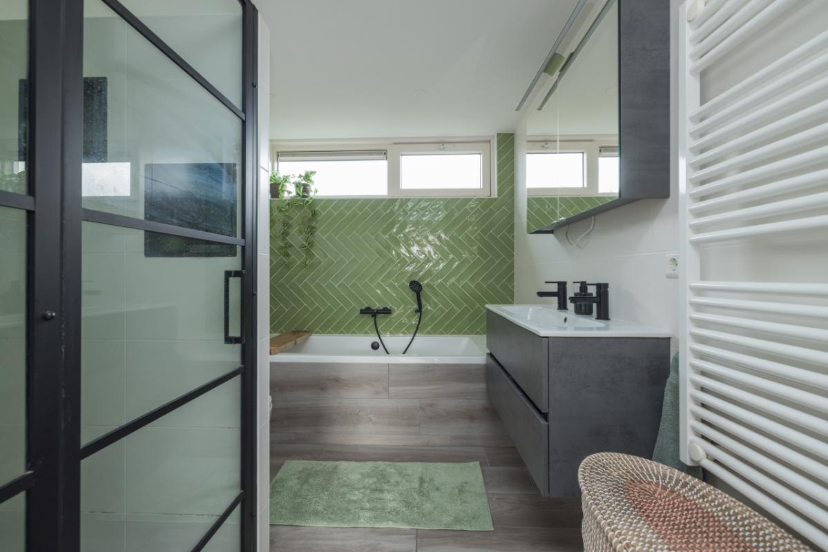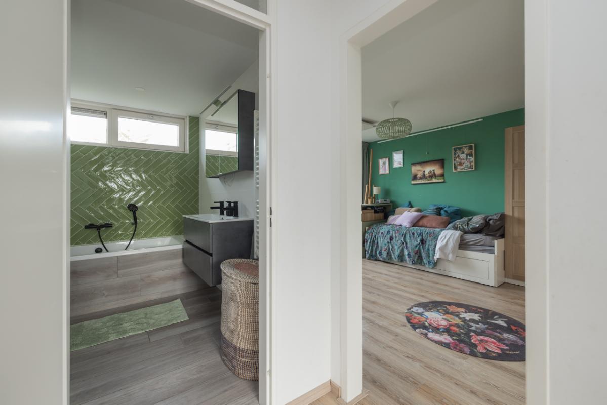 1e etage Op de overloop van deze verdieping komen drie slaapkamers uit. Aan de voorzijde ligt een ruime slaapkamer met wastafelmeubel, aan de achterzijde bevinden zich twee slaapkamers, waarvan de tweede ruime kamer toegang biedt tot het dak van de uitbouw. Alle slaapkamers zijn voorzien van plafond(infrarood)verwarming en een fraaie, drempelloze laminaatvloer. De moderne badkamer (2021) bevindt zich aan de voorzijde en is sfeervol betegeld in wit, olijfgroen en houtlook met stijlvolle zwarte accenten. De badkamer is uitgerust met een ligbad, dubbel wastafelmeubel, spiegelkast, toilet, inloopdouche en comfortabele vloerverwarming. 2e etage De ruime voorzolder biedt plaats aan de c.v.-combiketel (Remeha, 2020) en de aansluiting voor de wasapparatuur. Op deze verdieping bevinden zich de vierde en vijfde slaapkamer, beide voorzien van een dakkapel, wastafelmeubel en plafond(infrarood)verwarming, waardoor ook deze kamers licht en comfortabel zijn. Op de vloer ligt eenzelfde laminaatvloer.