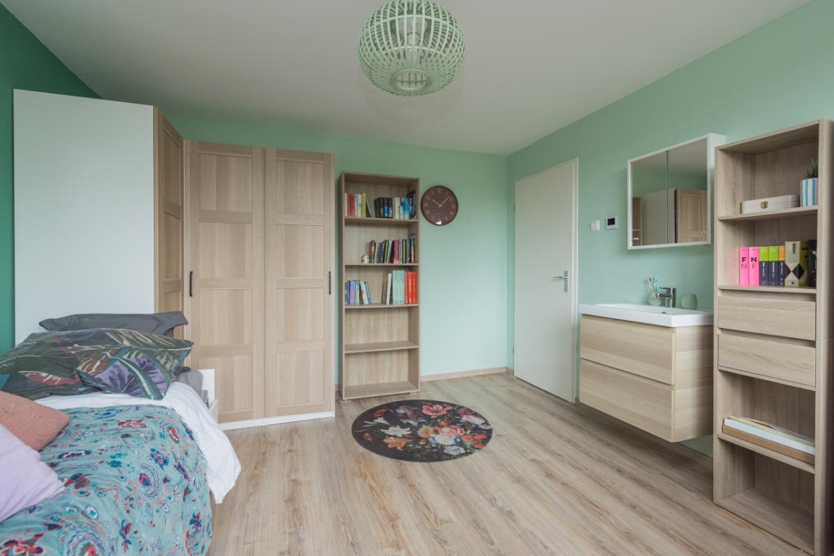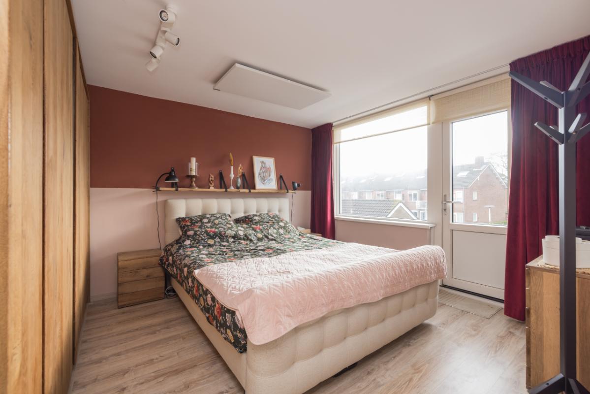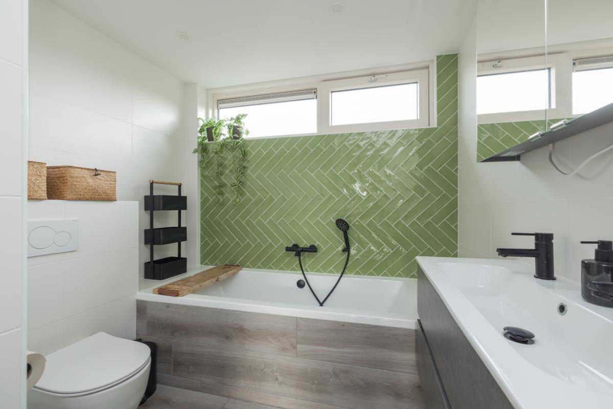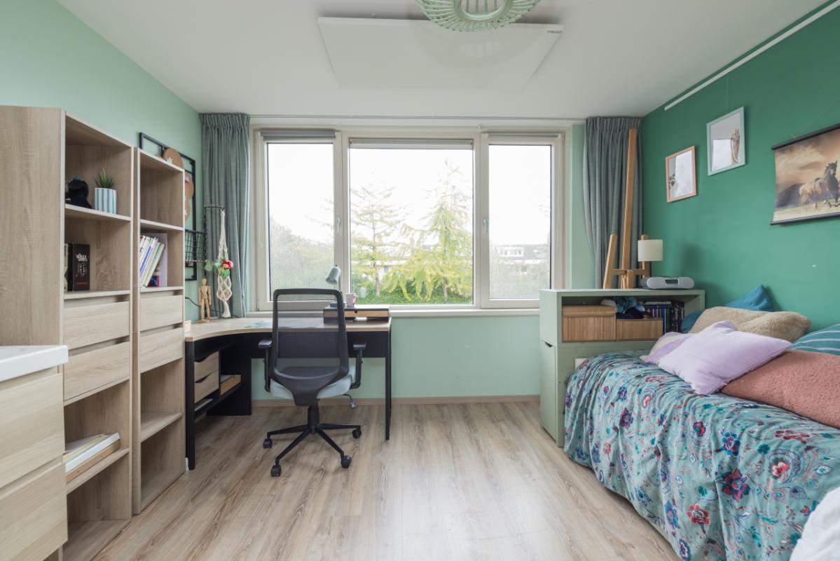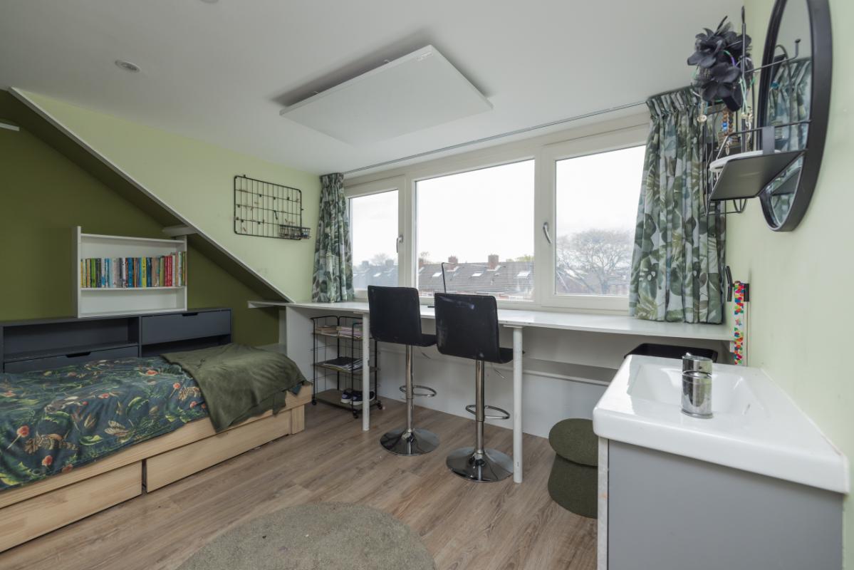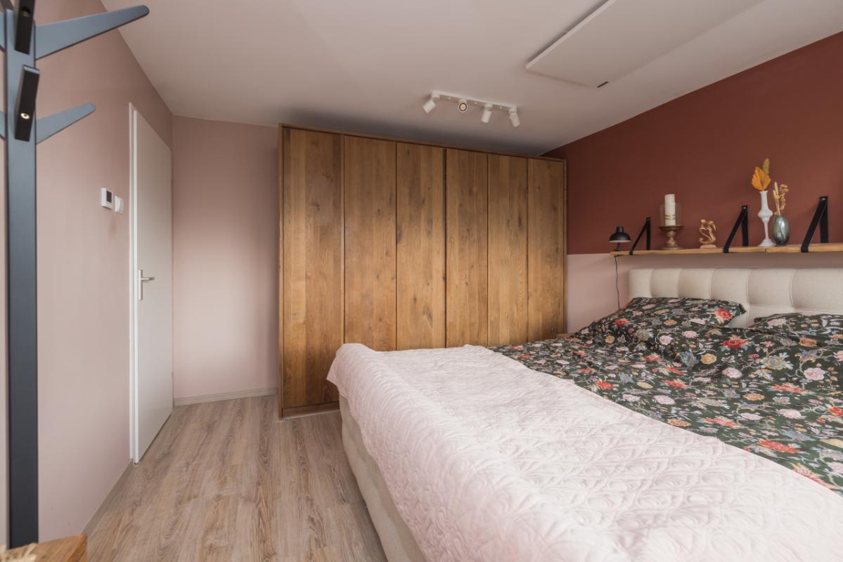 1e etage Op de overloop van deze verdieping komen drie slaapkamers uit. Aan de voorzijde ligt een ruime slaapkamer met wastafelmeubel, aan de achterzijde bevinden zich twee slaapkamers, waarvan de tweede ruime kamer toegang biedt tot het dak van de uitbouw. Alle slaapkamers zijn voorzien van plafond(infrarood)verwarming en een fraaie, drempelloze laminaatvloer. De moderne badkamer (2021) bevindt zich aan de voorzijde en is sfeervol betegeld in wit, olijfgroen en houtlook met stijlvolle zwarte accenten. De badkamer is uitgerust met een ligbad, dubbel wastafelmeubel, spiegelkast, toilet, inloopdouche en comfortabele vloerverwarming. 2e etage De ruime voorzolder biedt plaats aan de c.v.-combiketel (Remeha, 2020) en de aansluiting voor de wasapparatuur. Op deze verdieping bevinden zich de vierde en vijfde slaapkamer, beide voorzien van een dakkapel, wastafelmeubel en plafond(infrarood)verwarming, waardoor ook deze kamers licht en comfortabel zijn. Op de vloer ligt eenzelfde laminaatvloer.