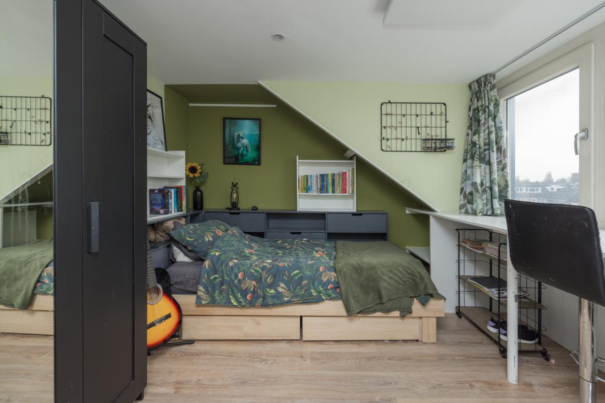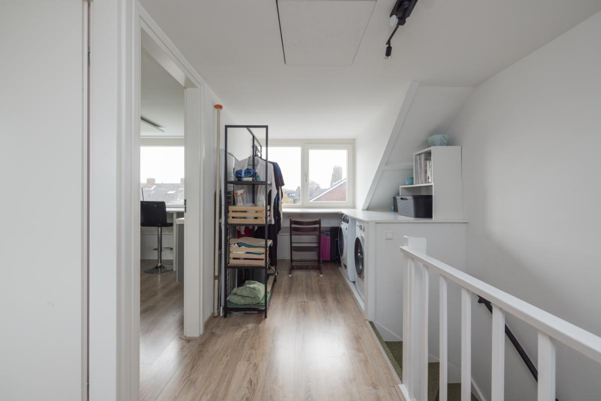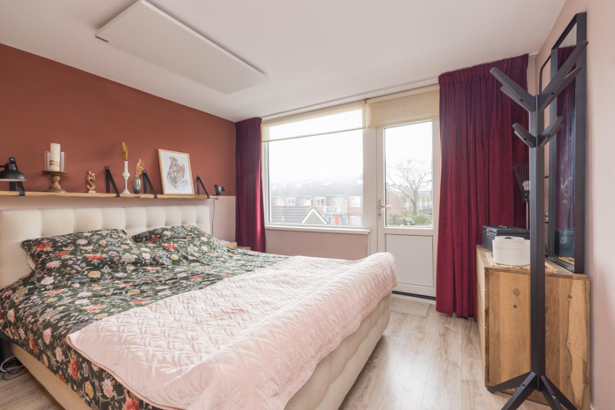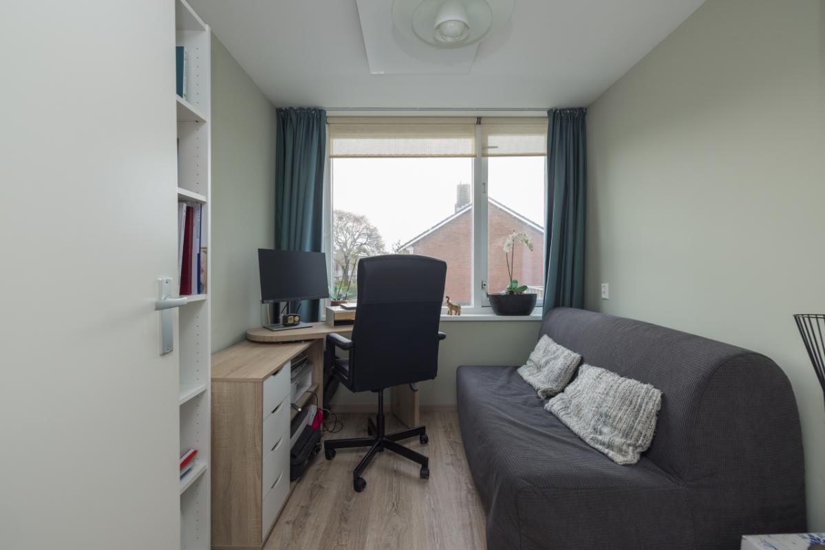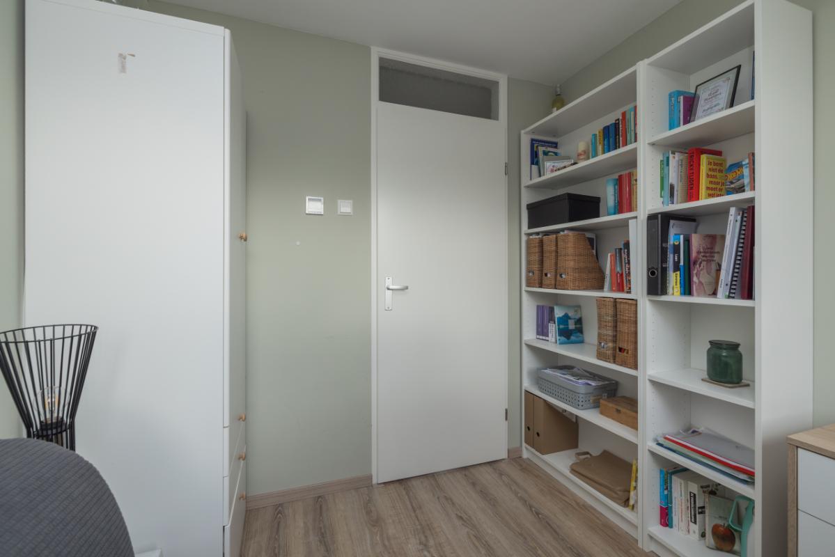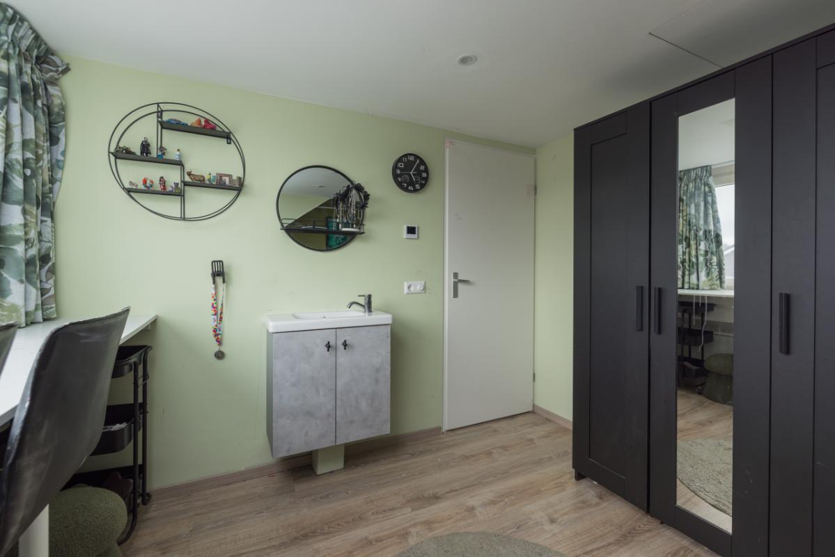 1e etage Op de overloop van deze verdieping komen drie slaapkamers uit. Aan de voorzijde ligt een ruime slaapkamer met wastafelmeubel, aan de achterzijde bevinden zich twee slaapkamers, waarvan de tweede ruime kamer toegang biedt tot het dak van de uitbouw. Alle slaapkamers zijn voorzien van plafond(infrarood)verwarming en een fraaie, drempelloze laminaatvloer. De moderne badkamer (2021) bevindt zich aan de voorzijde en is sfeervol betegeld in wit, olijfgroen en houtlook met stijlvolle zwarte accenten. De badkamer is uitgerust met een ligbad, dubbel wastafelmeubel, spiegelkast, toilet, inloopdouche en comfortabele vloerverwarming. 2e etage De ruime voorzolder biedt plaats aan de c.v.-combiketel (Remeha, 2020) en de aansluiting voor de wasapparatuur. Op deze verdieping bevinden zich de vierde en vijfde slaapkamer, beide voorzien van een dakkapel, wastafelmeubel en plafond(infrarood)verwarming, waardoor ook deze kamers licht en comfortabel zijn. Op de vloer ligt eenzelfde laminaatvloer.