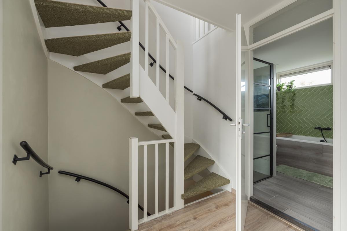 Ground Floor Through the entrance, you arrive in the hall with a modern electrical panel (14 groups), coat area, and a modern toilet with wall-mounted closet and washbasin. A stylish black glass door provides access to the spacious living room. At the front, there’s a cozy sitting area, while at the rear, the extended living area with French doors opens onto the sunny backyard. The skylight in the extension ensures wonderful natural light. A practical storage cupboard is located under the stairs. The semi-open kitchen, accessible via a beautiful sliding door, features wood-look cabinets and drawers, a light countertop with breakfast bar, ample storage space, and modern built-in appliances, including a 5-burner gas hob, recirculation extractor hood, combination oven, microwave, dishwasher, and boiling-water tap (Quooker). The entire ground floor has a bamboo parquet floor with underfloor heating, contributing to the home’s warm and inviting atmosphere.