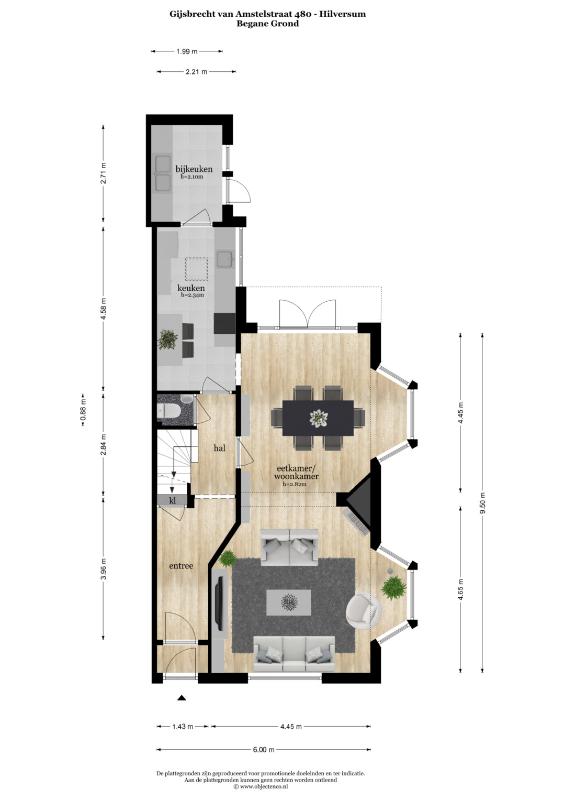 Indeling: Begane grond: entree, hal met toilet en toegang tot souterrain, ruime en lichte woon/eetkamer voorzien van parketvloer met twee grote erkers en openslaande deuren naar de tuin, keuken met aansluitend de bijkeuken.