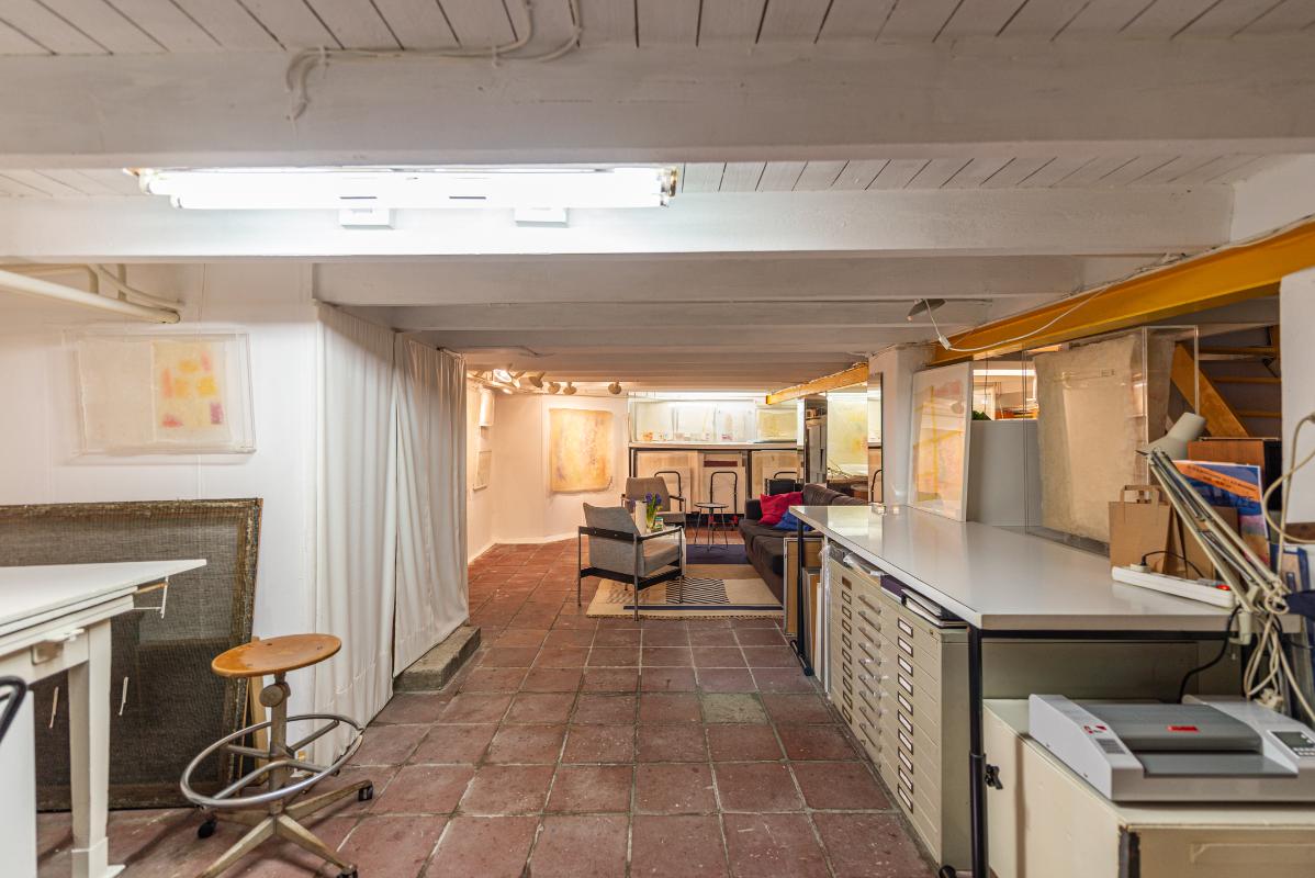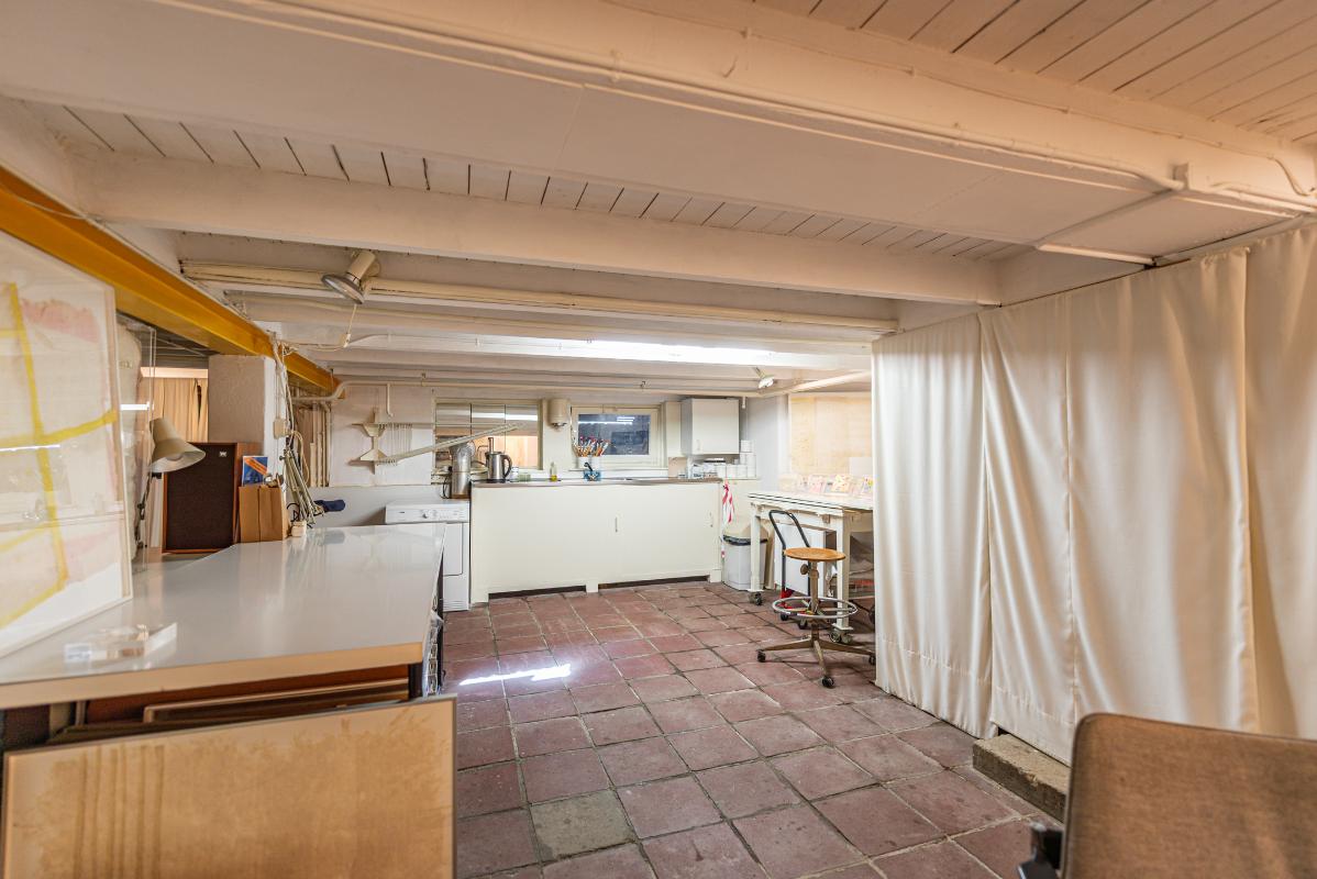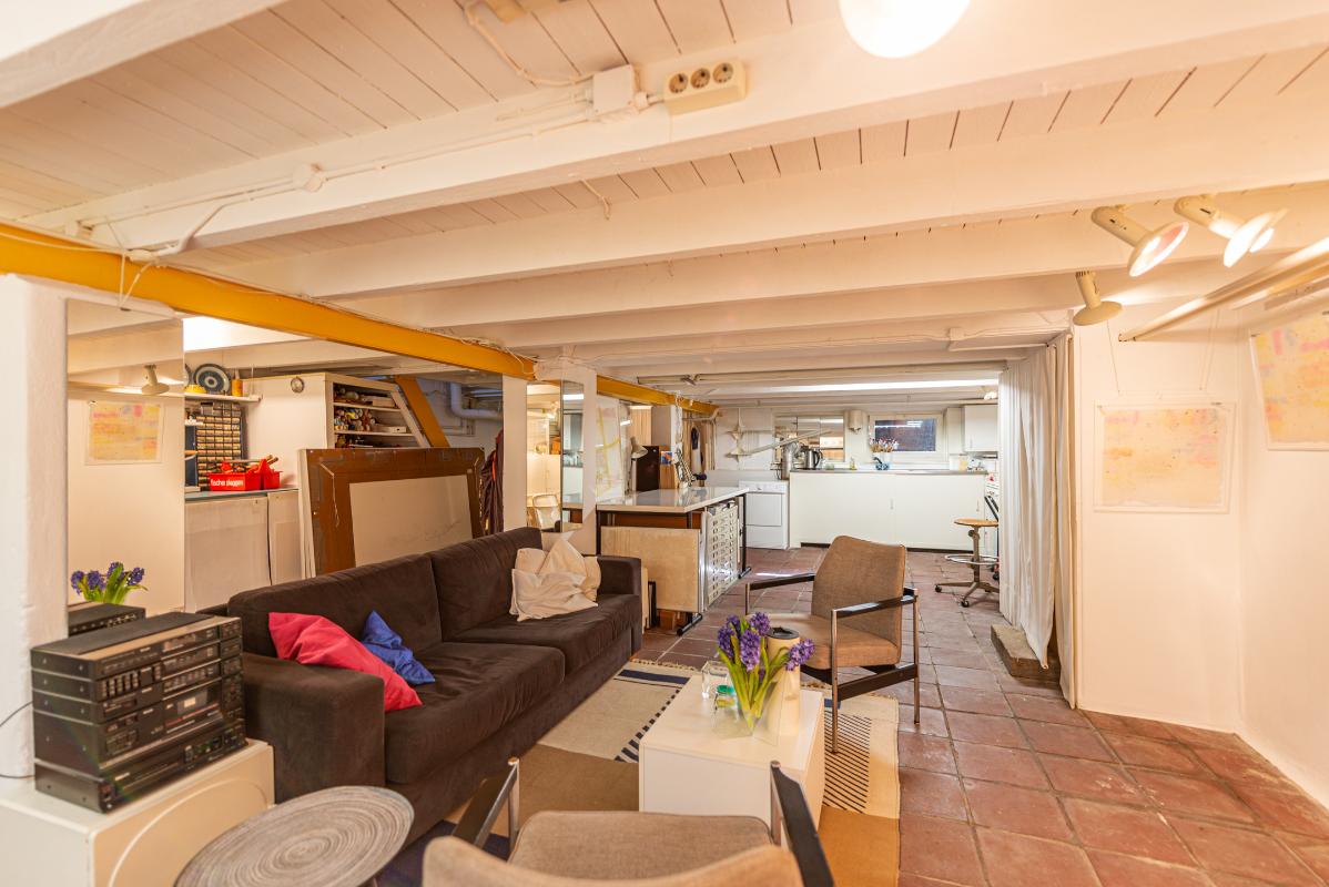 Souterrain: multifunctionele ruimte van bijna 60 m2 voorzien van keukenblok, de ruimte is in gebruik geweest als atelier, maar ook bijzonder geschikt als hobbyruimte of speel/recreatie ruimte voor bijvoorbeeld een groot gezin.