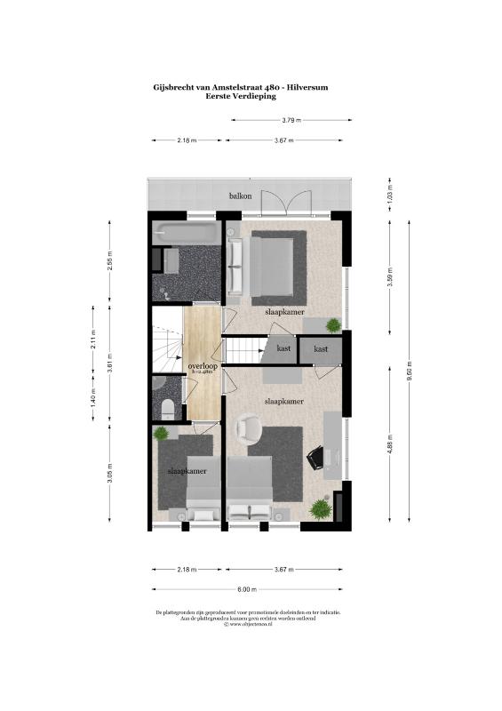 1e verdieping: overloop met separaat toilet, grote slaapkamer aan achterzijde met openslaande deuren naar balkon en inbouwkast, 2e grote slaapkamer met inbouwkast, kleinere 3e slaapkamer, badkamer voorzien van ligbad, vaste wastafel en separate douche.