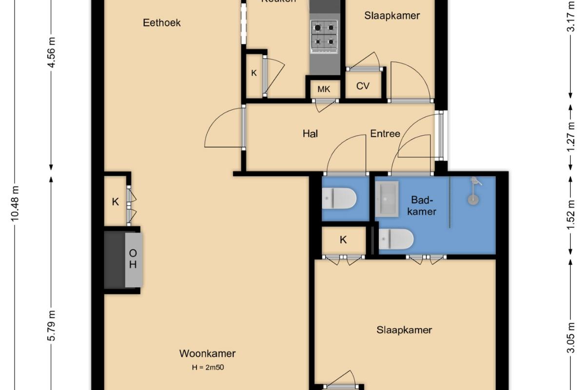 1e Verdieping: entree, hal met separaat gastentoilet, moderne meterkast met automaten. De hal geeft verder toegang tot een kleine kamer, welke ingericht is als wasruimte en aparte kast met c.v.-ketel (2010) en een vergrote badkamer (2017) met inloopdouche, toilet en wastafel, separaat gastentoilet. Via de badkamer is er een tweede slaapkamer te bereiken, met twee inbouwkasten en openslaande deuren naar een balkon, gelegen op het oosten.