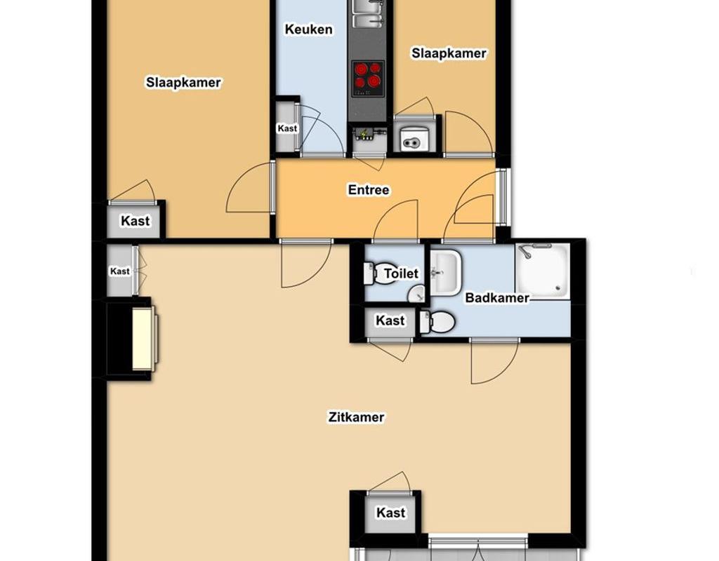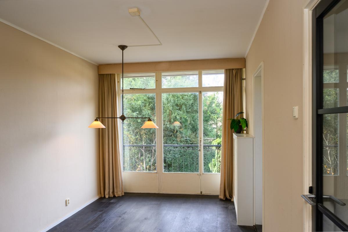 Een ruime kamer en suite; aan de achterzijde een woonkmaer met een verouderde visgraat pvc-vloer, schouw met gaskachel en een deur naar het balkon (oost). Aan de voorzijde de woon-eetkamer welke toegang geeft middels openslaande deuren naar en 2e balkon en een gesloten keuken met ook een deur naar het balkon. Enkele elektrische zonweringen en rolluiken.