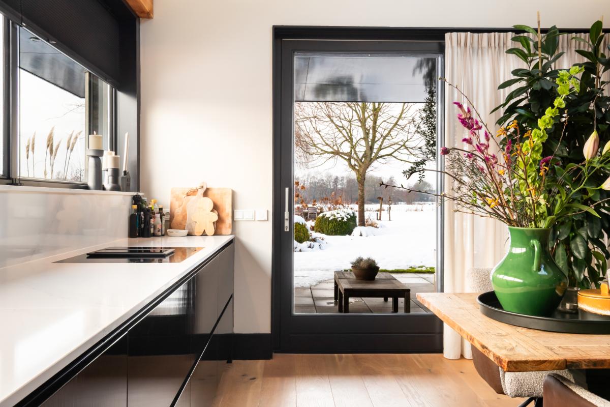 De royale woonkeuken vormt het hart van de woning en is een echte eyecatcher. Dankzij het hoge plafond en de grote raampartijen is dit een bijzonder lichte en ruimtelijke plek. De luxe keuken is voorzien van onder andere een inductiekookplaat, Quooker, vaatwasser en stoomoven. Een ideale ruimte voor koken, uitgebreid tafelen en samenzijn. Via de schuifpui is er directe toegang tot de veranda.
