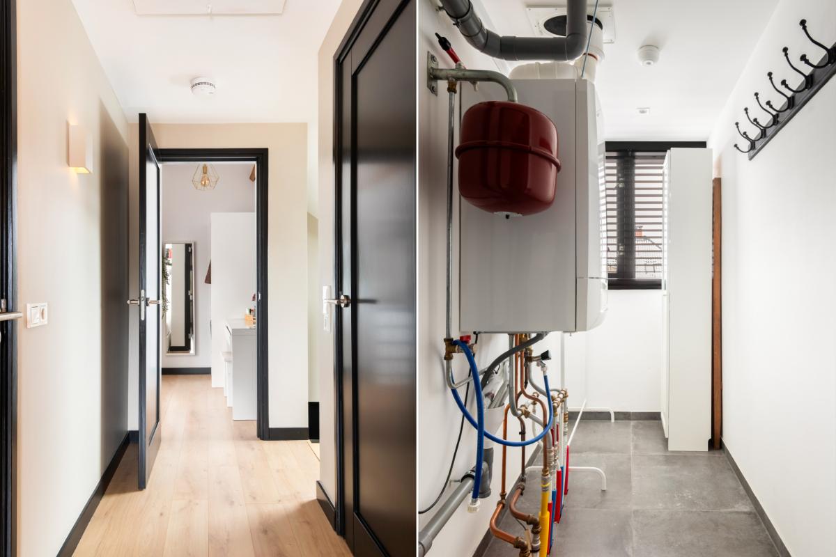 De luxe badkamer op de begane grond beschikt over een wastafelmeubel, inloopdouche, wandcloset, inbouwkasten en vloerverwarming. Vloerverwarming is tevens aanwezig in de woonkamer, keuken, bijkeuken, werkkamer, hal en toiletruimte, wat zorgt voor een aangename en gelijkmatige warmte. In de hal bevindt zich een separate toiletruimte met wandcloset en fonteintje. De bijkeuken is praktisch ingericht met vaste kasten, een wasbak en aansluitingen voor wasmachine, droger en de mechanische ventilatie.
