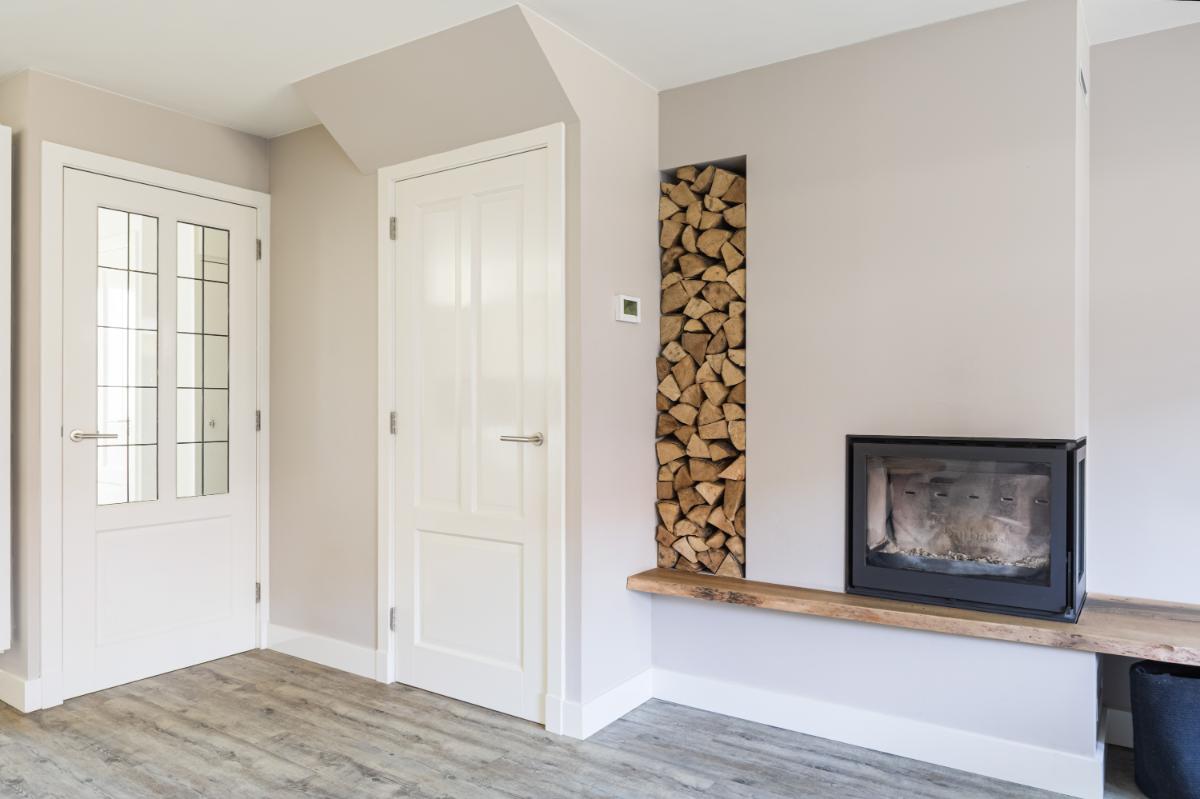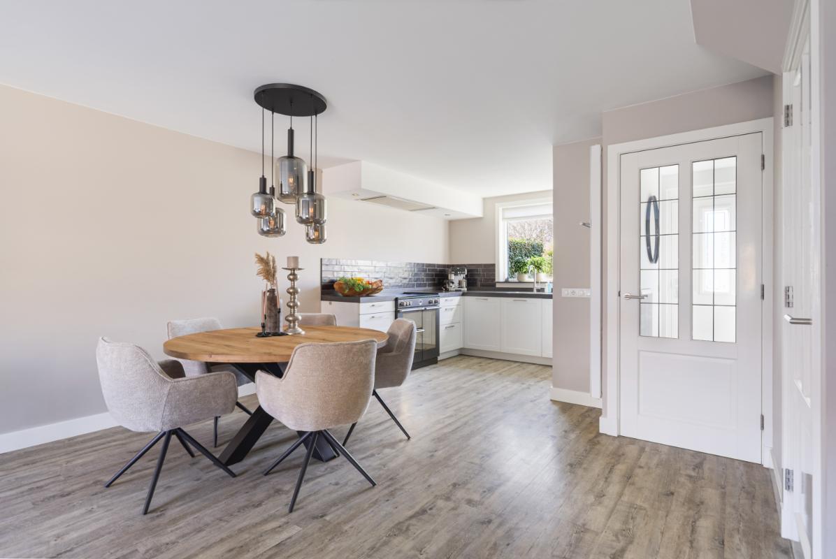 INDELING Begane grond: je komt binnen in een verzorgde hal met meterkast, toilet en trapopgang. Vanuit hier stap je de woonkamer in, waar direct de ruimte en het licht opvallen. Dankzij de uitbouw aan de achterzijde is een royale leefruimte ontstaan, met voldoende plek voor een gezellige zithoek en een ruime eethoek. De houtkachel zorgt hier voor extra sfeer en warmte, terwijl de openslaande deuren een mooie verbinding maken met de tuin.