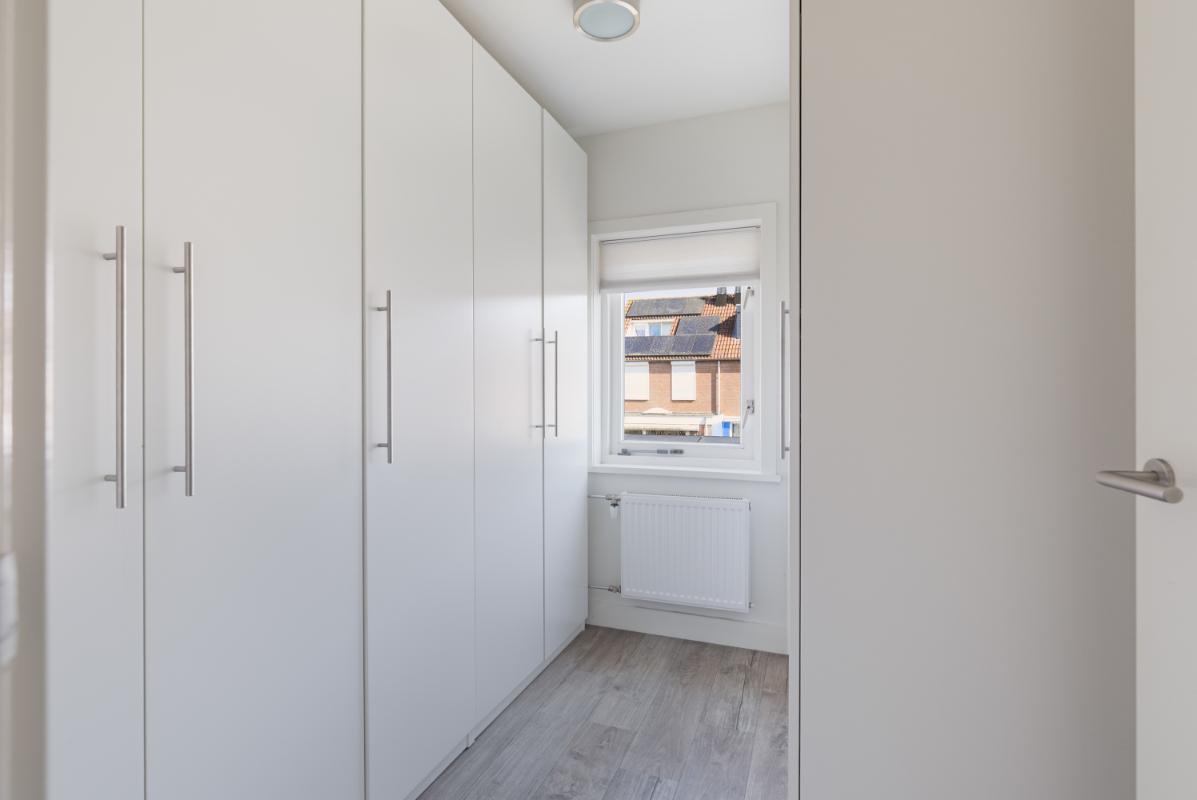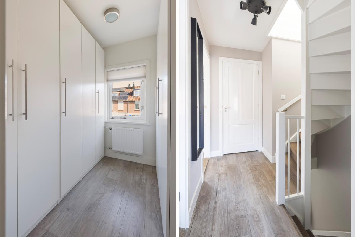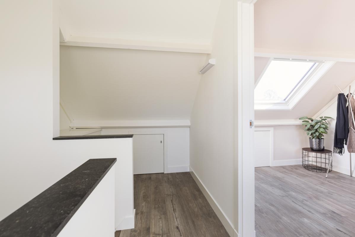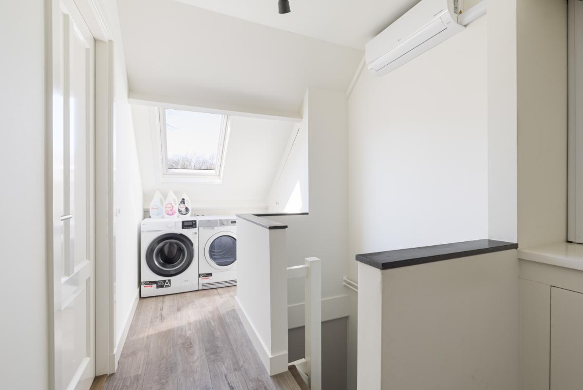 Tweede verdieping: op de tweede verdieping vind je de voorzolder met de cv-opstelling (Remeha, 2017), aansluitingen voor wasapparatuur en een airco-unit. Daarnaast is hier een volwaardige vierde slaapkamer gerealiseerd, voorzien van dakramen met buitenzonwering aan beide zijden, een laminaatvloer en strakke wandafwerking. Achter de knieschotten is praktische bergruimte aanwezig.