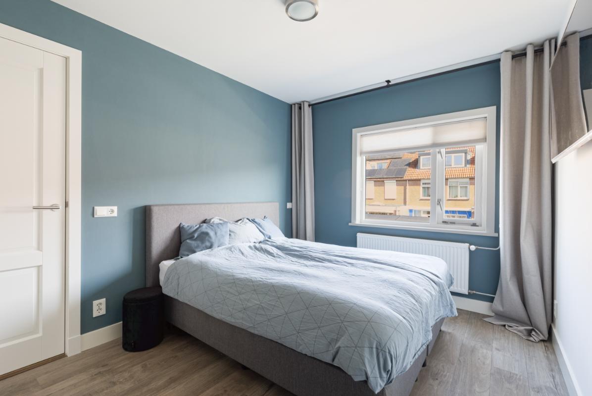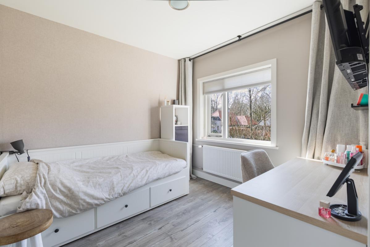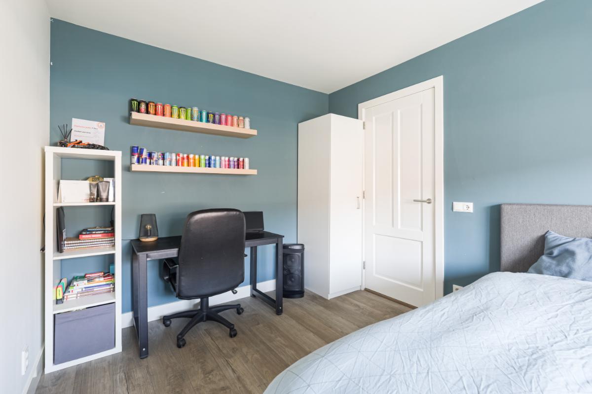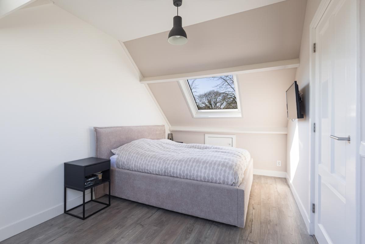 Tweede verdieping: op de tweede verdieping vind je de voorzolder met de cv-opstelling (Remeha, 2017), aansluitingen voor wasapparatuur en een airco-unit. Daarnaast is hier een volwaardige vierde slaapkamer gerealiseerd, voorzien van dakramen met buitenzonwering aan beide zijden, een laminaatvloer en strakke wandafwerking. Achter de knieschotten is praktische bergruimte aanwezig.
