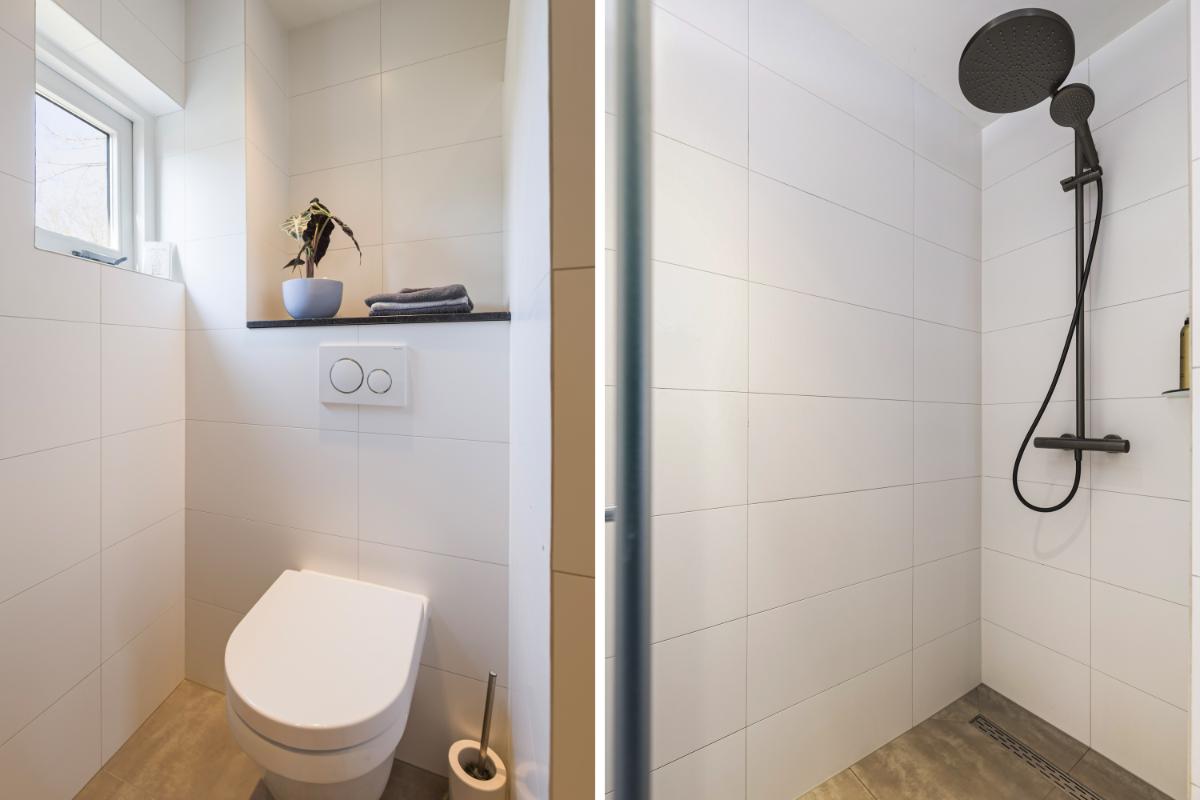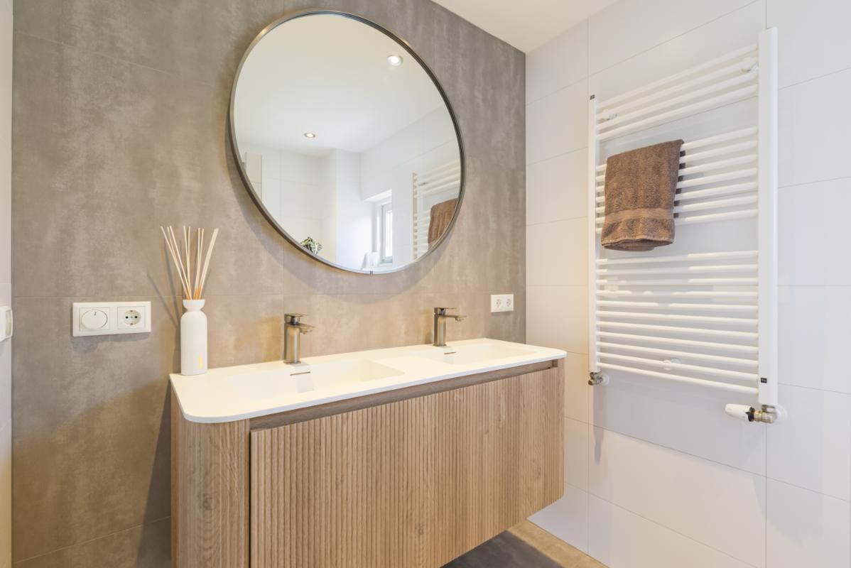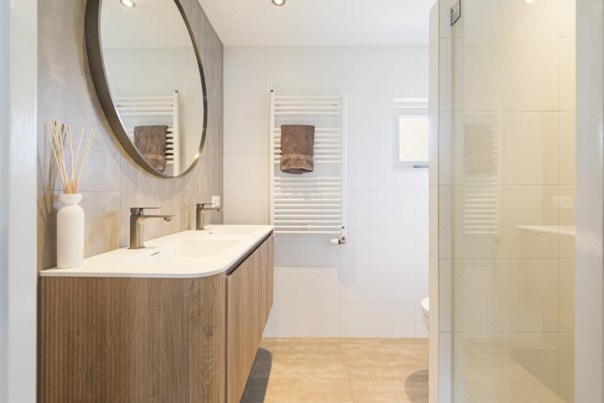 De badkamer is modern en sfeervol uitgevoerd in warme tinten en voorzien van een dubbele wastafel met meubel, een wandcloset en een ruime inloopdouche. Dankzij het aanwezige raam is er prettig daglicht en natuurlijke ventilatie.