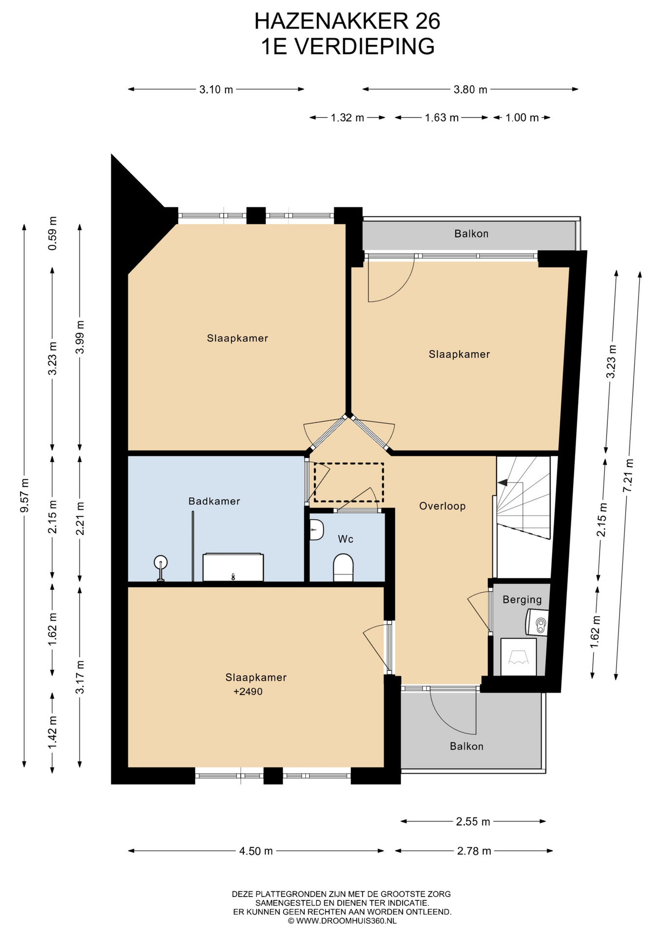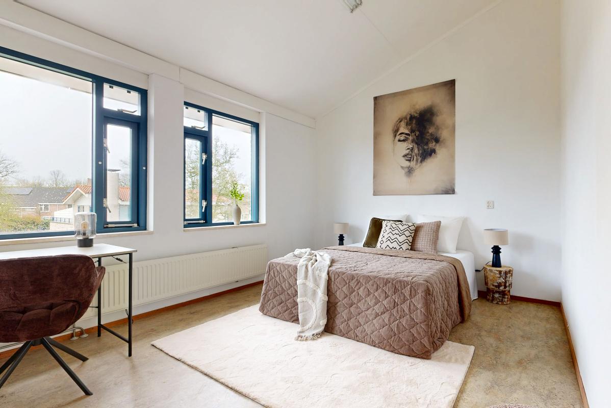 Op de eerste verdieping vind je een ruime overloop met toegang tot de moderne badkamer, drie slaapkamers, separaat toilet en een handige berg-/stookruimte met wasmachine-aansluiting. Aan de voorzijde ligt een ruime slaapkamer en heb je toegang tot een balkonnetje op het zuiden. Aan de achterzijde twee royale slaapkamers met uitzicht op de groenstrook en sloot, waarvan één met eigen balkonnetje. De badkamer is zeer ruim en modern (2021), voorzien van wastafelmeubel, inloopdouche en designradiator; klaar voor jarenlang woonplezier. Via de overloop bereik je tevens de vliering voor extra bergruimte; hier bevindt zich ook de omvormer van de zonnepanelen.