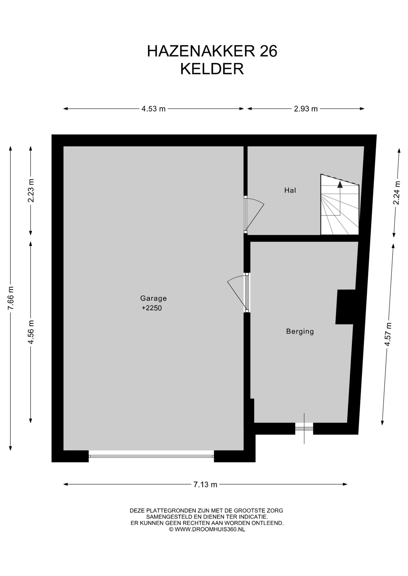 Vanuit de hal bereik je via de trap de zeer royale garage (ca. 35m²), geschikt voor één auto en/of meerdere tweewielers. Deze is ideaal in te richten naar eigen wens (mogelijkheid om een extra kamer te creëren), voorzien van een elektrisch bedienbare garagedeur, elektra en wateraansluiting. Hiernaast heb je vanuit de garage ook nog toegang tot een ruime berging; ideaal voor het opbergen van je spullen.