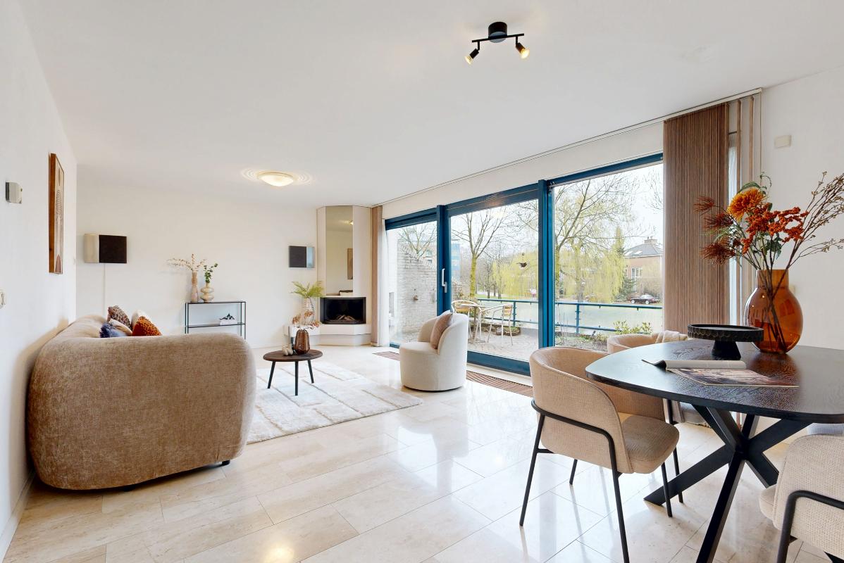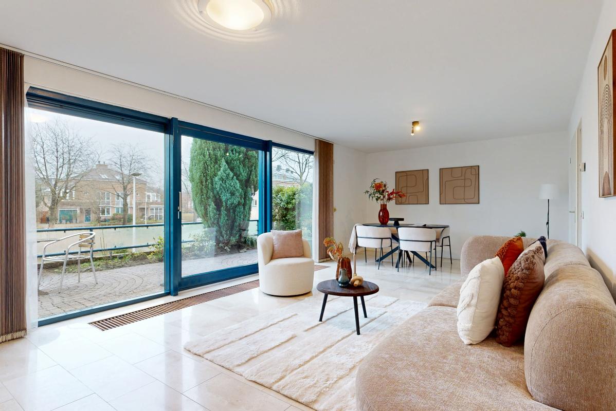 Stap binnen via de ruime voortuin in deze bijzondere drive-in woning. Je komt binnen in een royale hal met toilet, trapopgang, garderobe en extra bergruimte. Loop rechtdoor en je betreedt de zeer ruime woonkamer met plek voor een gezellige zithoek, open haard en eethoek. Grote raampartijen en een schuifpui geven toegang tot het zonnedek, met een fraai en rustig uitzicht over de groenstrook en sloot, direct gelegen aan het Kooikerspark. Aan de voorzijde van de woning ligt de lichte woonkeuken, een fijne plek om samen te koken en te dineren. De U-vormige keuken is compleet uitgerust met alle gewenste inbouwapparatuur. Ook hier heb je toegang tot een heerlijk terras op het zuiden, met recht een zonneterras te noemen, inclusief elektrisch zonnescherm en ruimte voor een gezellige zithoek.