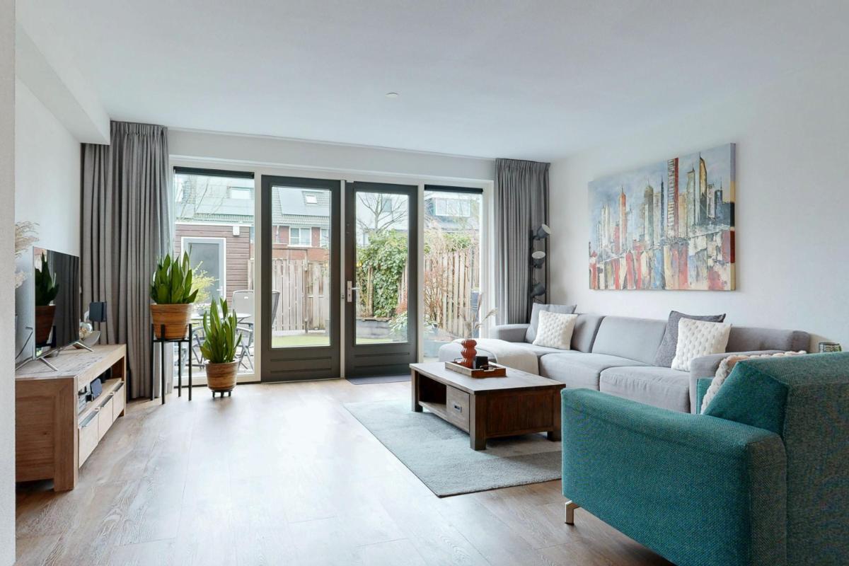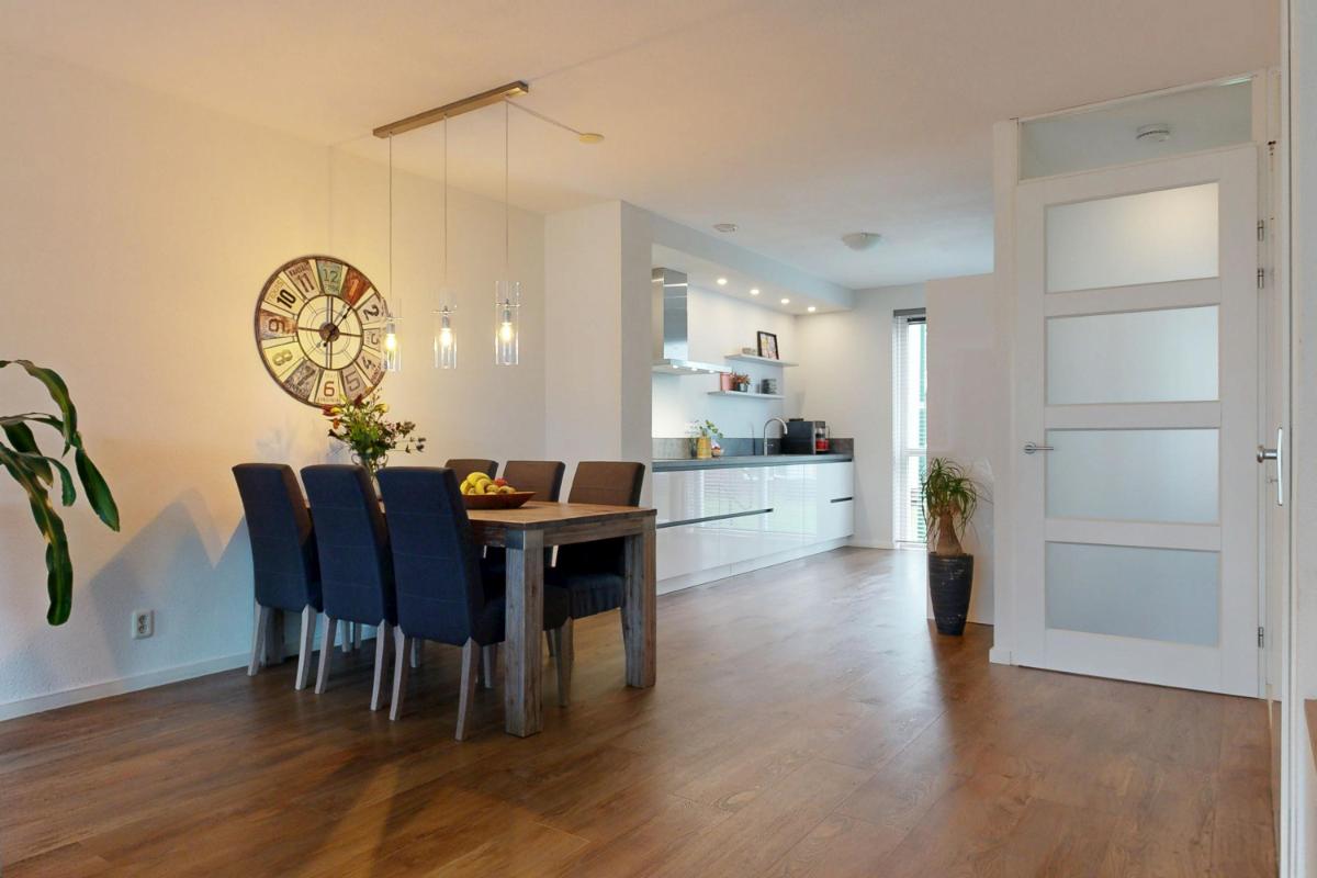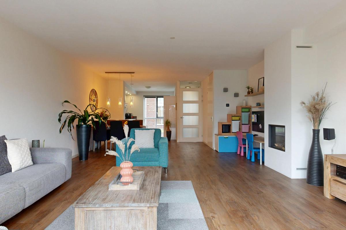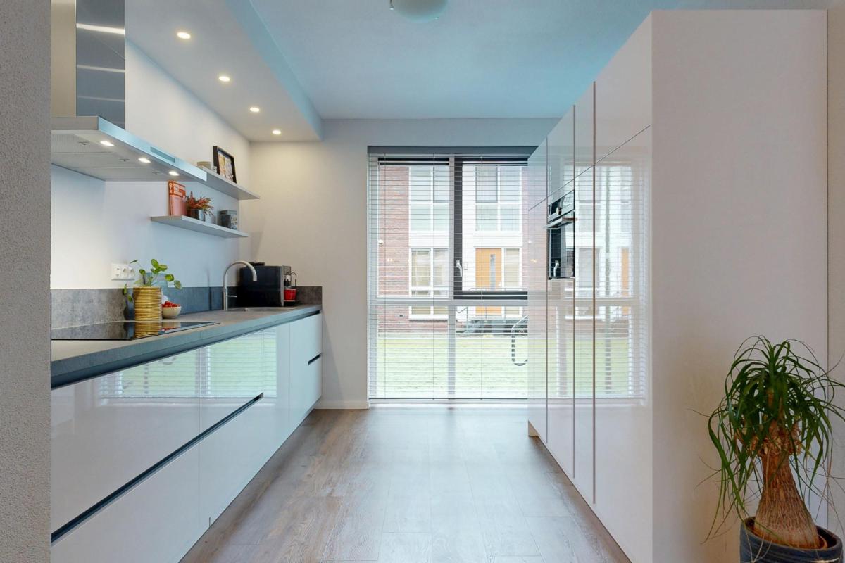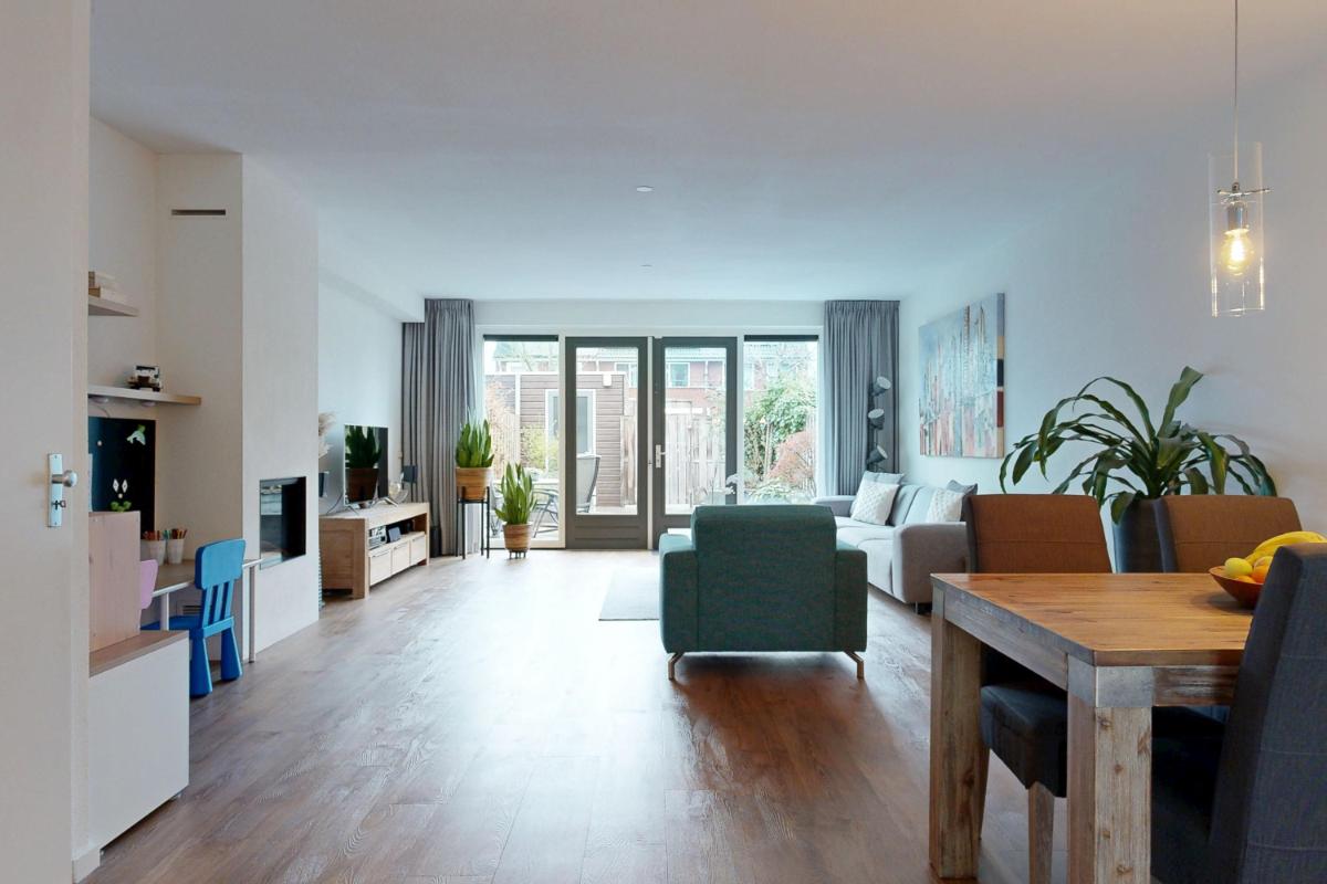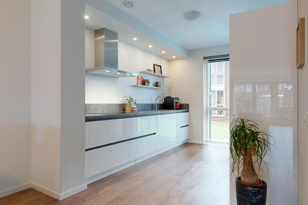 Via een trappetje bereik je de entree van de woning, gelegen aan een autovrije groenstrook voor extra rust en vrijheid. Je komt binnen in een ruime hal met voldoende plek voor jassen en het toilet, van waaruit je direct toegang hebt tot de woonkamer en keuken. De ruime woonkamer biedt volop plek voor een gezellige zithoek, compleet met een nette gashaard voor sfeervolle avonden. Er is een handige provisiekast en ruimte voor een apart eetgedeelte, ideaal voor diners met familie of vrienden. Dankzij de vloerverwarming en openslaande deuren naar de tuin voelt de ruimte altijd warm en verbonden met buiten. De open keuken (2021) aan de voorzijde heeft een groot raam voor veel natuurlijk licht en is voorzien van een wandopstelling met combioven, koel- en vrieskast. Aan de andere kant vind je het kook- en spoeldeel, voorzien van een Quooker (kokend-waterkraan). De open verbinding met de woonkamer zorgt ervoor dat je altijd in contact blijft met elkaar, terwijl de keuken een eigen, praktische ruimte vormt.