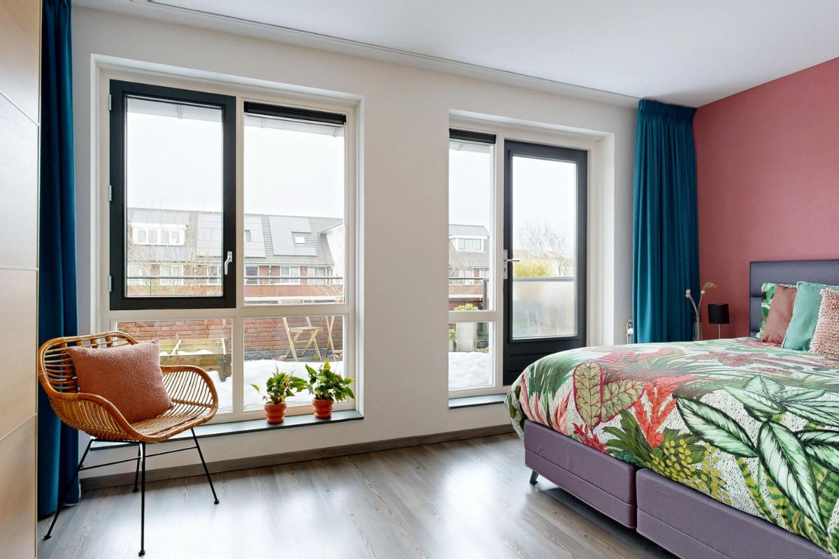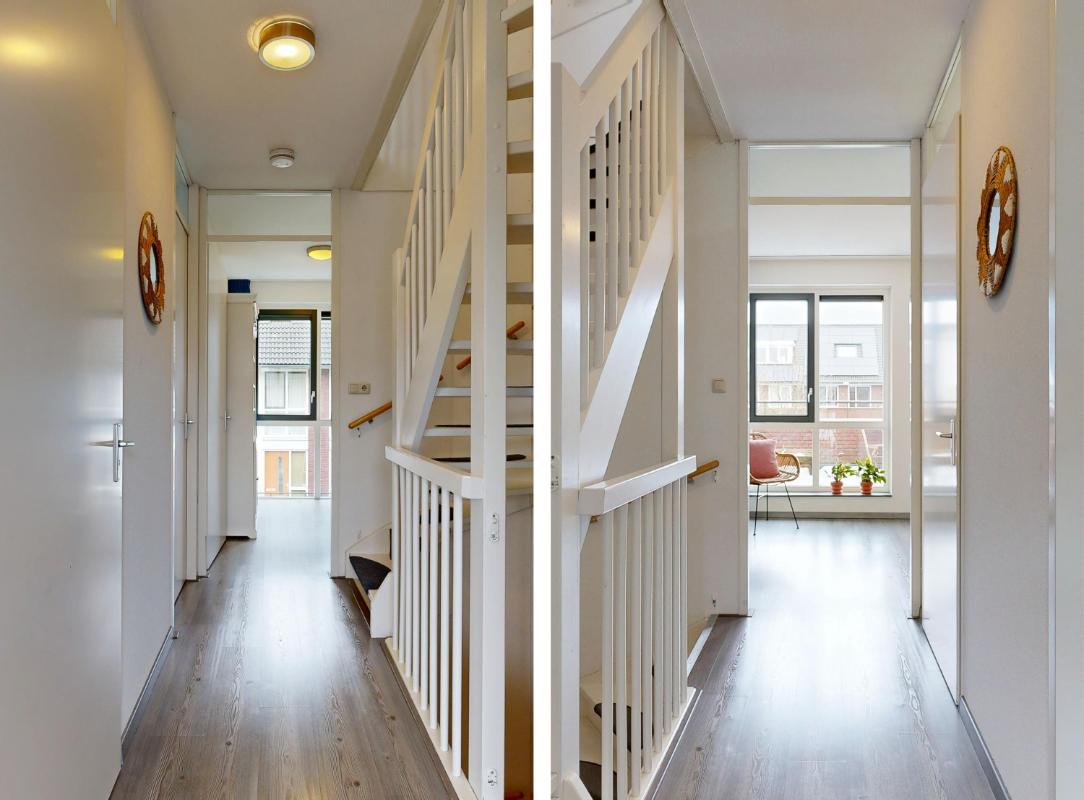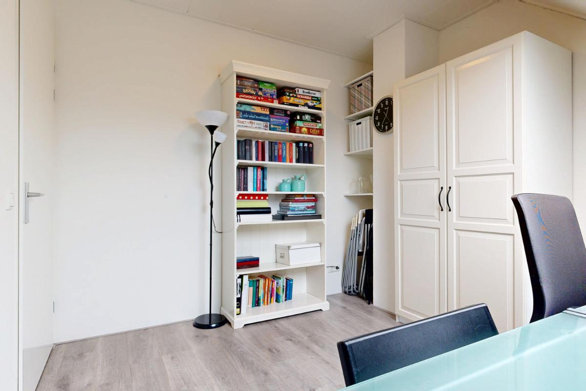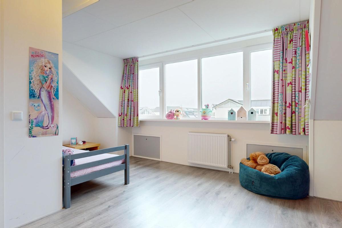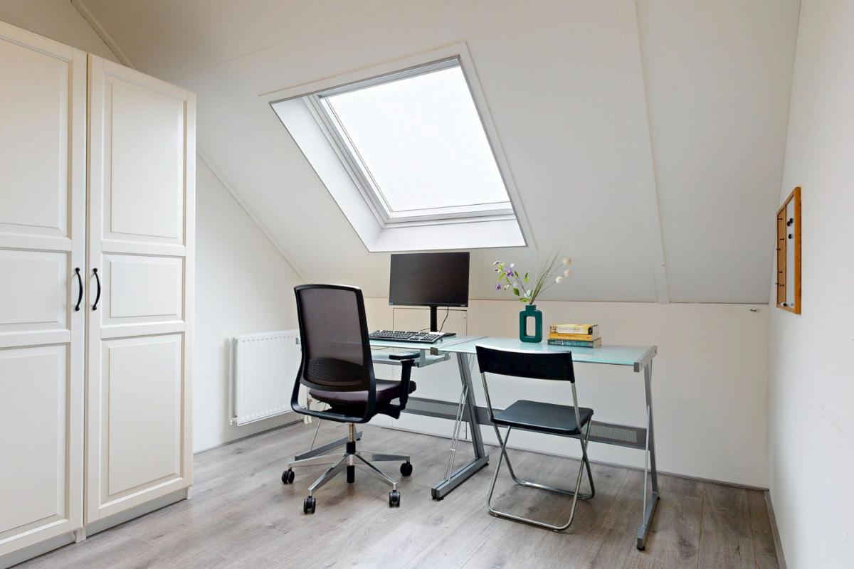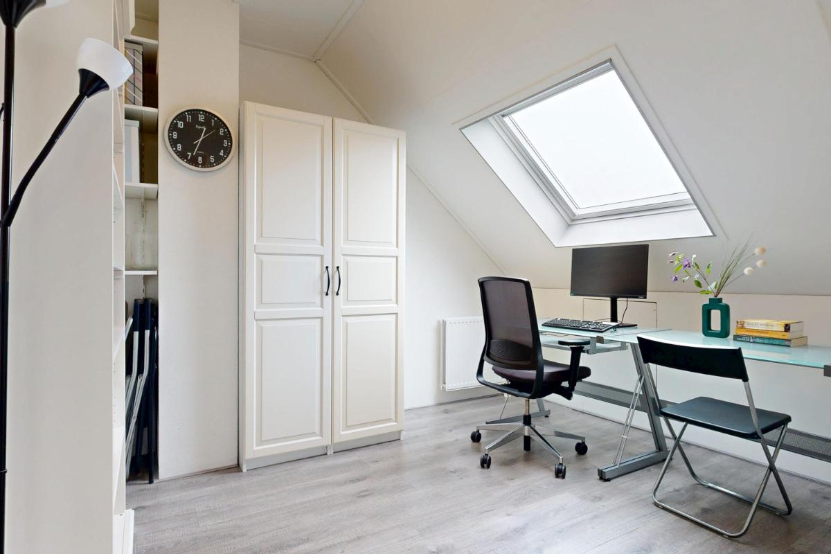 Op de eerste verdieping vind je aan de achterzijde een ruime slaapkamer met grote raampartijen en toegang tot het royale dakterras, waar je een gezellig zitje kunt creëren en kunt genieten van de ochtendzon. Aan de voorzijde liggen twee slaapkamers met elektrische screens op het westen, ideaal te gebruiken als werk- of slaapkamers. De badkamer op de eerste verdieping is compleet ingericht met een ligbad, dubbele wastafel met meubel, toilet, douche en designradiator, perfect voor ontspanning en dagelijks gebruik. De tweede verdieping biedt twee slaapkamers. Zo vind je aan de achterzijde de ruime en lichte kamer met dakkapel en knieschotten voor extra opbergruimte. Aan de voorzijde vind je een kamer met dakraam en schotten, welke ideaal is als werk- of slaapkamer. Op deze verdieping vind je ook de aansluiting voor wasmachine en droger, plus de CV-opstelling met een extra dakraam voor licht en ventilatie. Daarnaast biedt de vliering extra bergruimte, ideaal voor het opbergen van diverse spullen.