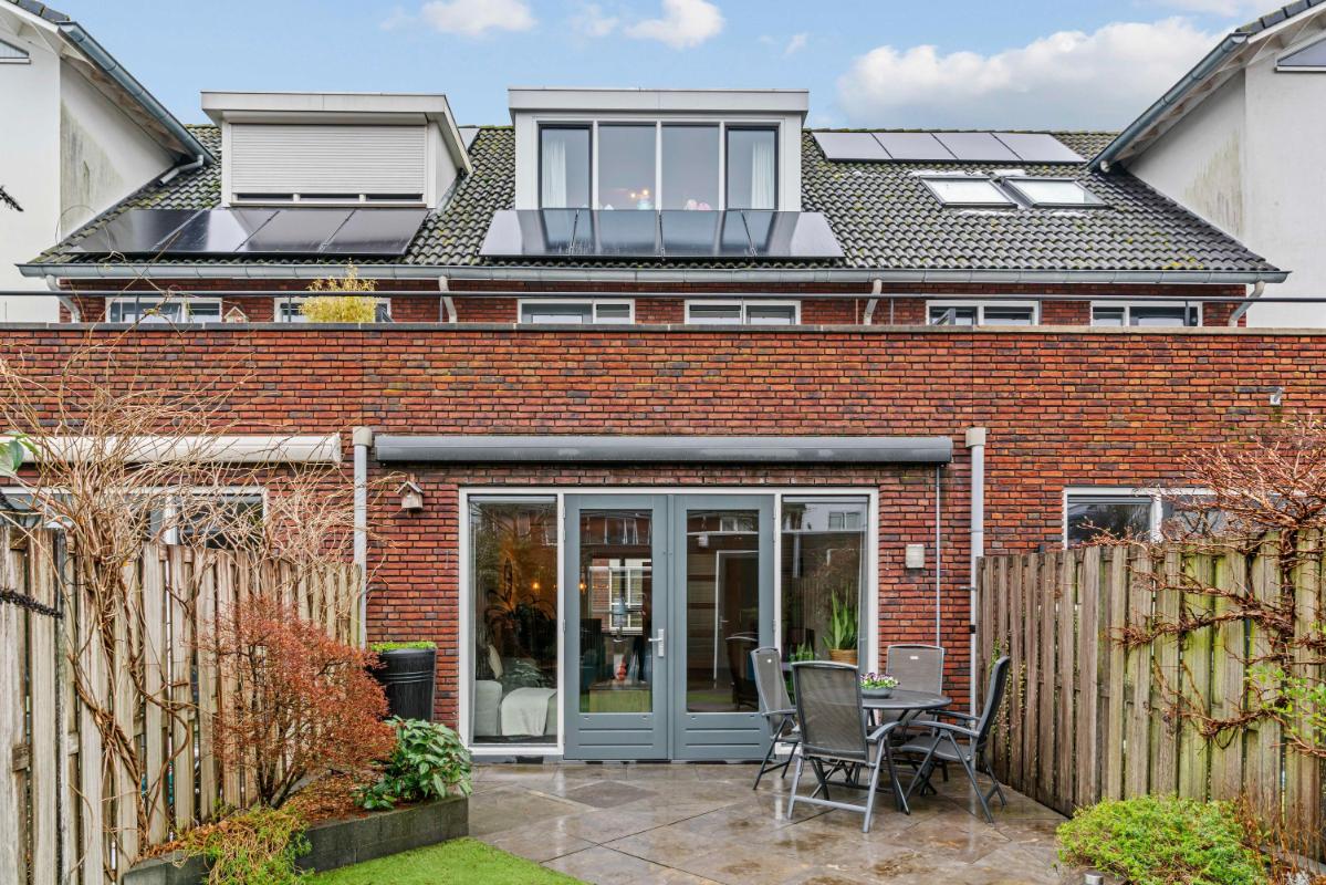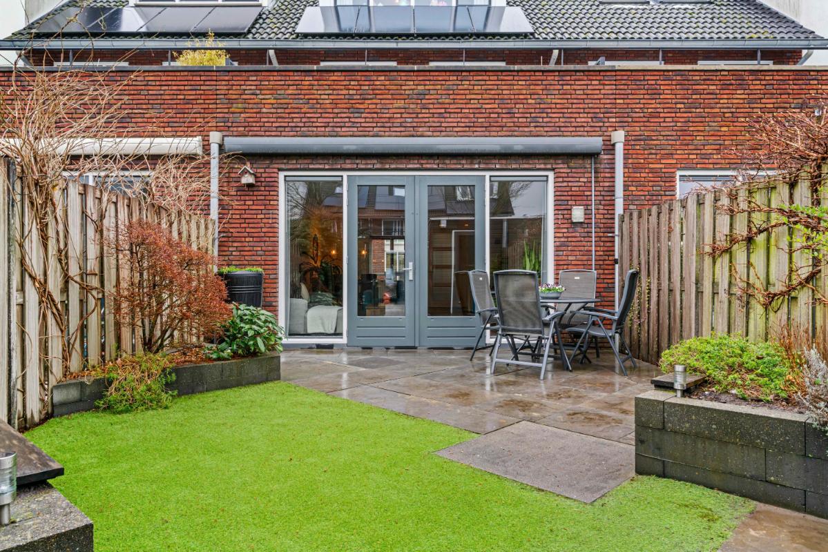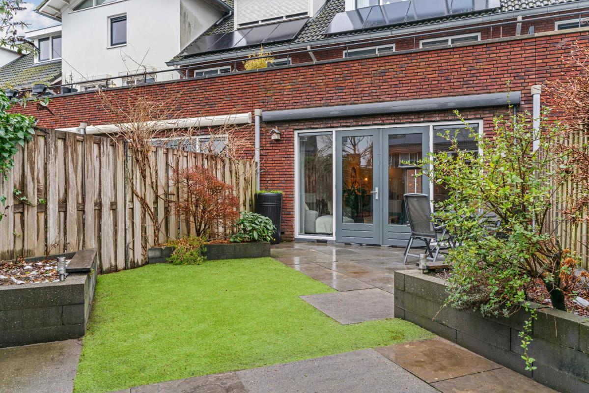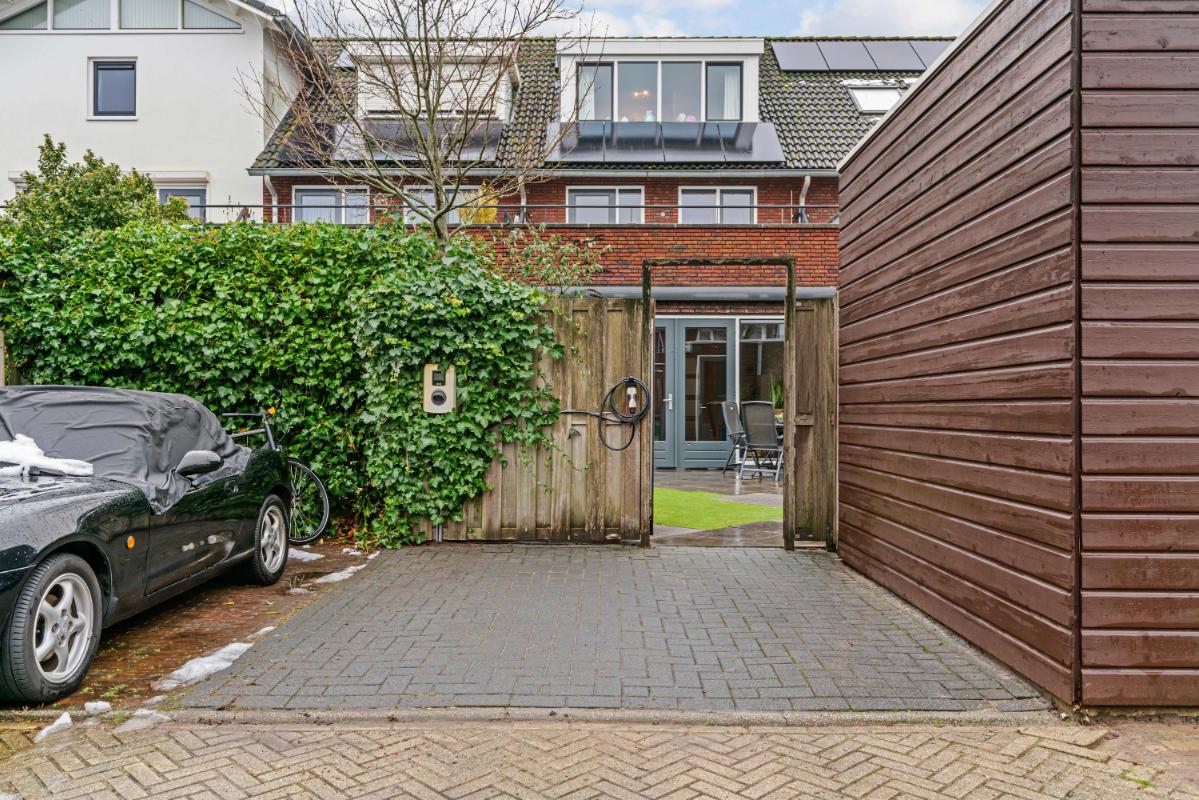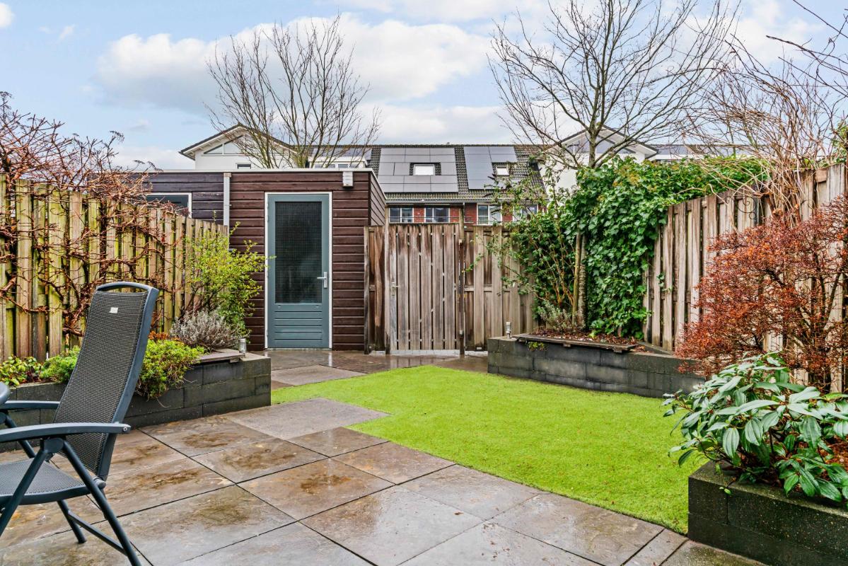 Via de openslaande deuren aan de achterzijde (met elektrisch zonnescherm daarboven) stap je vanuit de woonkamer zo de tuin in. De tuin op het oosten is verzorgd, voorzien van onderhoudsarm groen en biedt ruimte voor een gezellige zithoek. In de zomer kun je hier vanaf de ochtend tot einde middag heerlijk genieten van het zonnetje! Achterin de tuin is ook een vrijstaande houten berging aanwezig. Ten slotte bereik je vanuit de tuin gemakkelijk je direct aangrenzende, eigen parkeerplaats met laadpunt voor een elektrische auto.