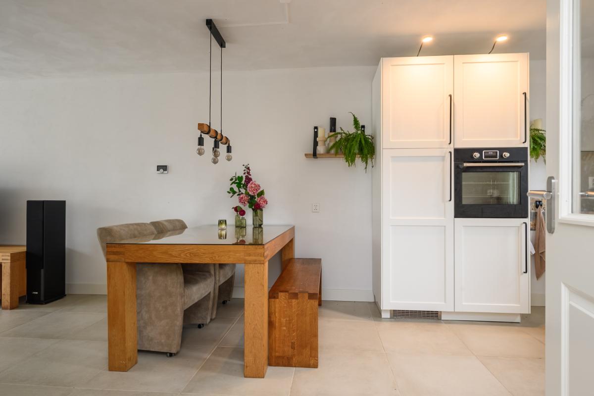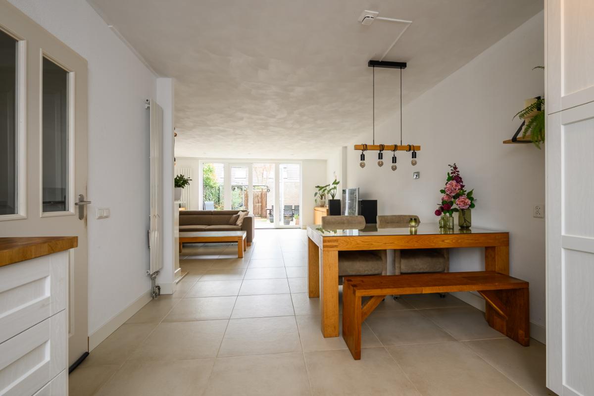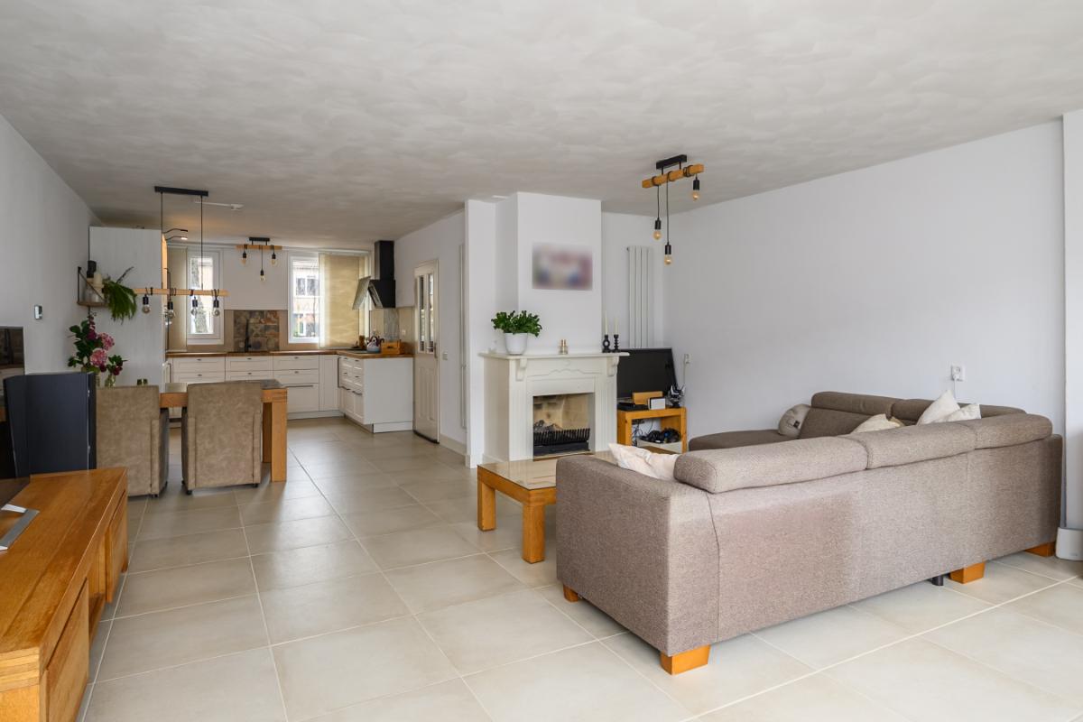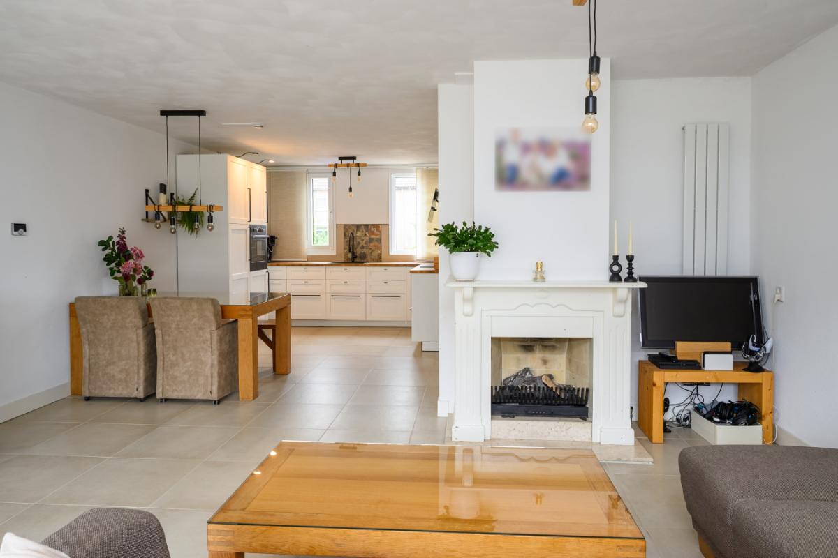 Indeling: Entree, hal met een moderne toiletruimte met fontein en een ruime trapkast. Uitgebouwde woonkamer met lichte tegelvloer, openhaard en aan de voorzijde een moderne keuken (2025) in hoekopstelling en voorzien van diverse inbouwapparatuur;