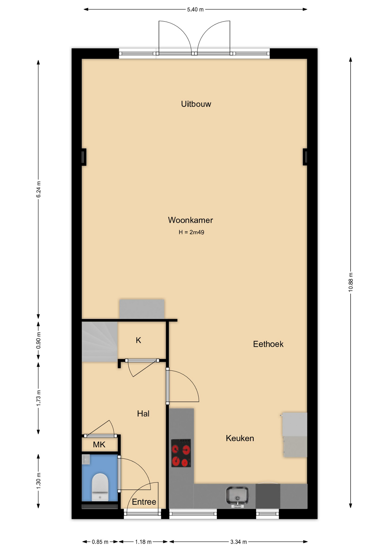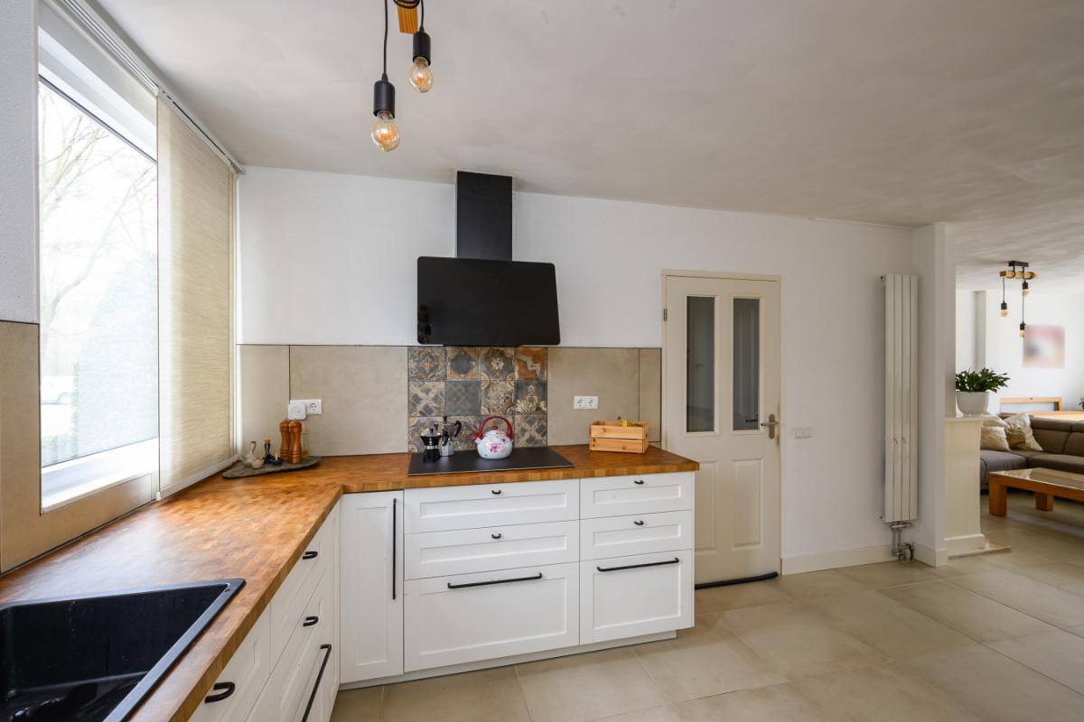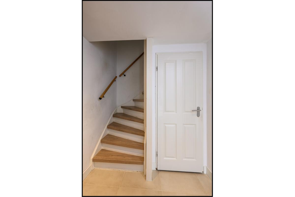 Indeling: Entree, hal met een moderne toiletruimte met fontein en een ruime trapkast. Uitgebouwde woonkamer met lichte tegelvloer, openhaard en aan de voorzijde een moderne keuken (2025) in hoekopstelling en voorzien van diverse inbouwapparatuur;