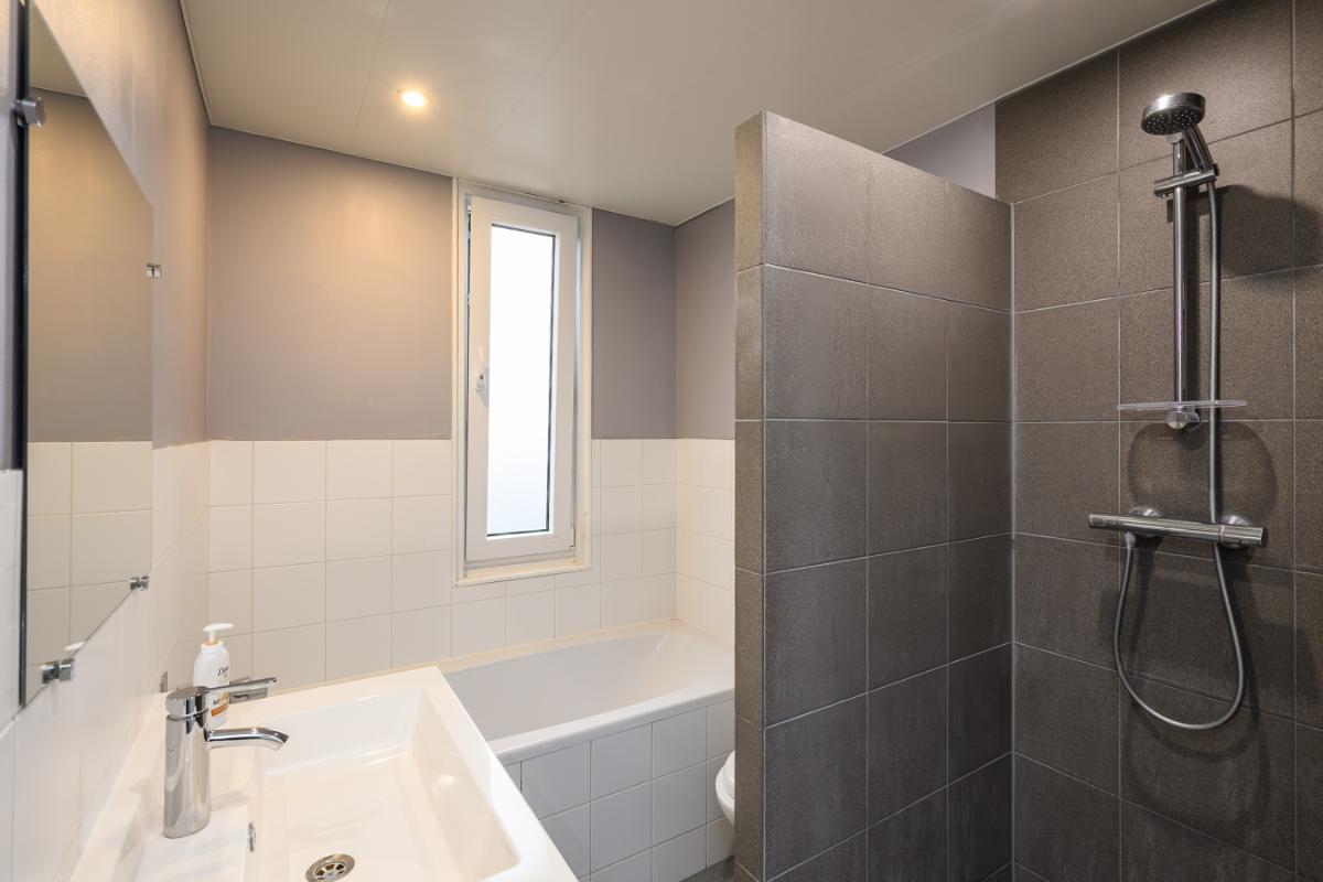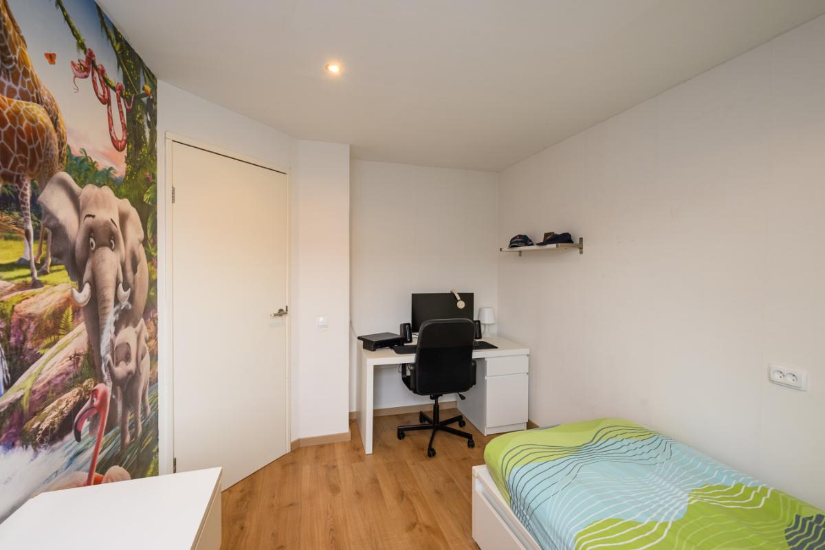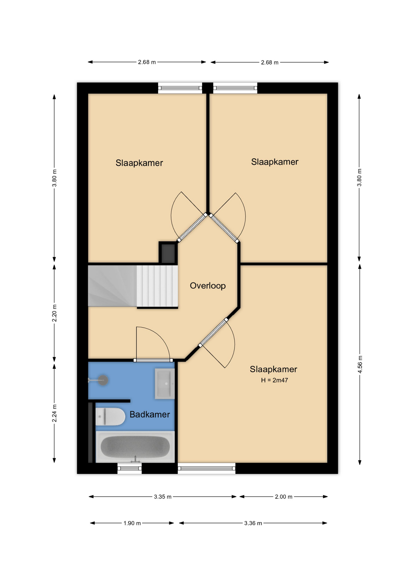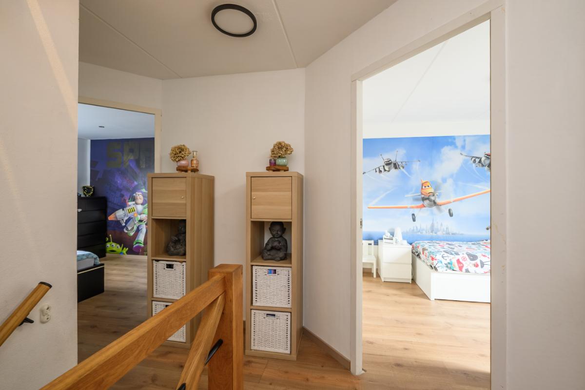 Eerste verdieping: Overloop, drie, in grootte variƫrende slaapkamers en een moderne badkamer met vaste wastafel, inloopdouche (2014) en zwevend toilet;