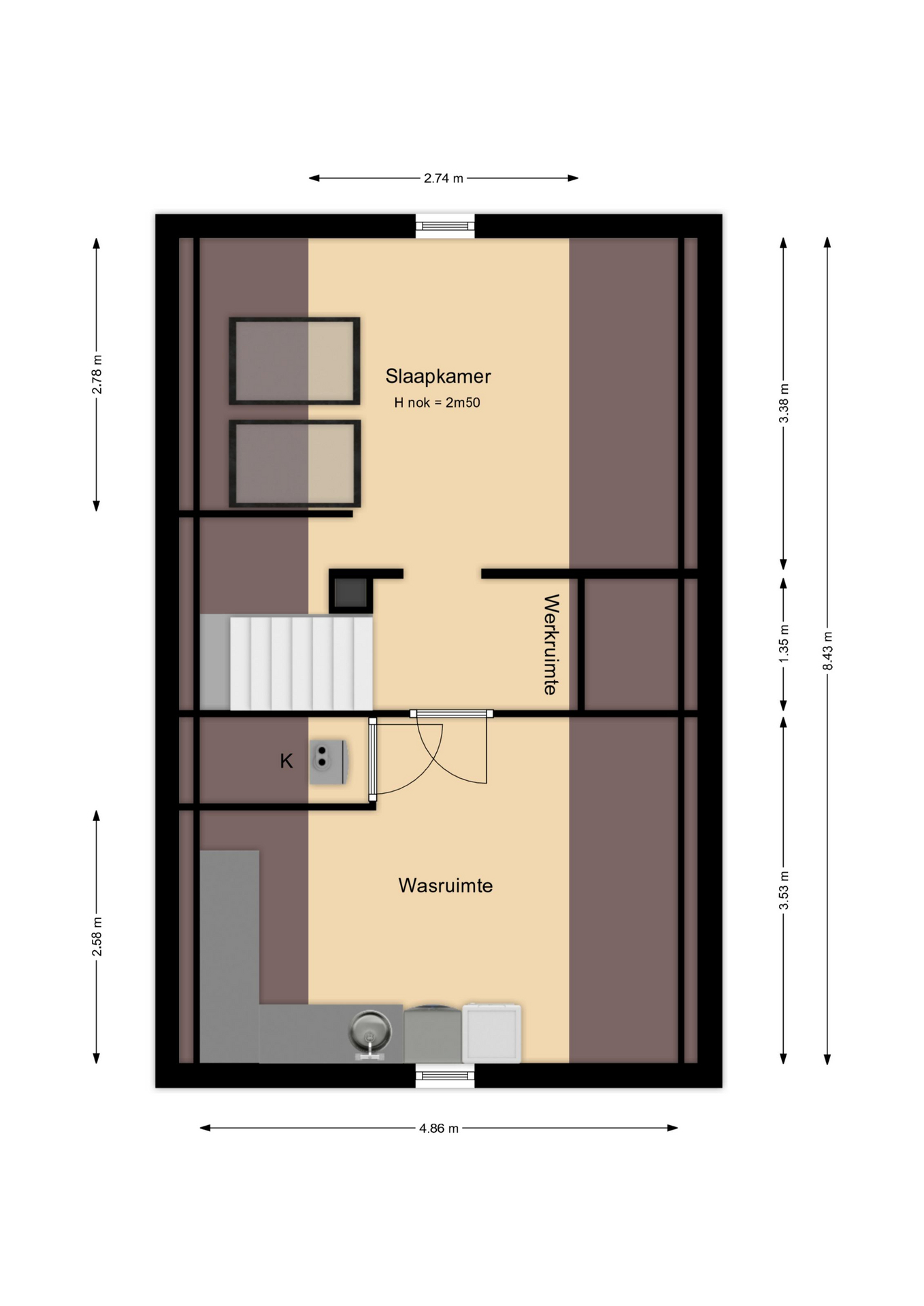 Tweede verdieping: Voorzolder met c.v. (2021) en wasmachine- en drogeraansluitingen, aan de voorzijde van het woonhuis een kamer, ingeroicht als wasruimte en aan de achterzijde een slaapkamer met twee dakvensetrs;