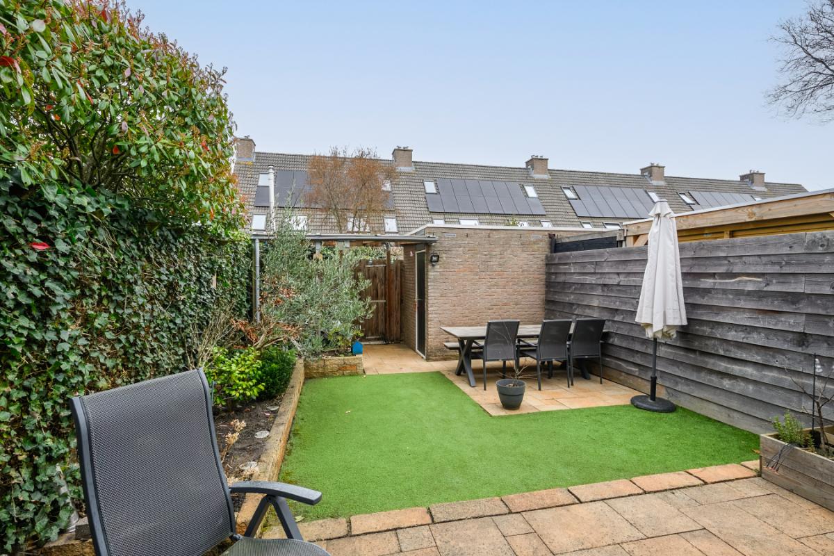 Tuin: In de zonnige, aangelegde, achtertuin met achterom, bevindt zich een vrijstaande stenen berging voorzien van elektra;