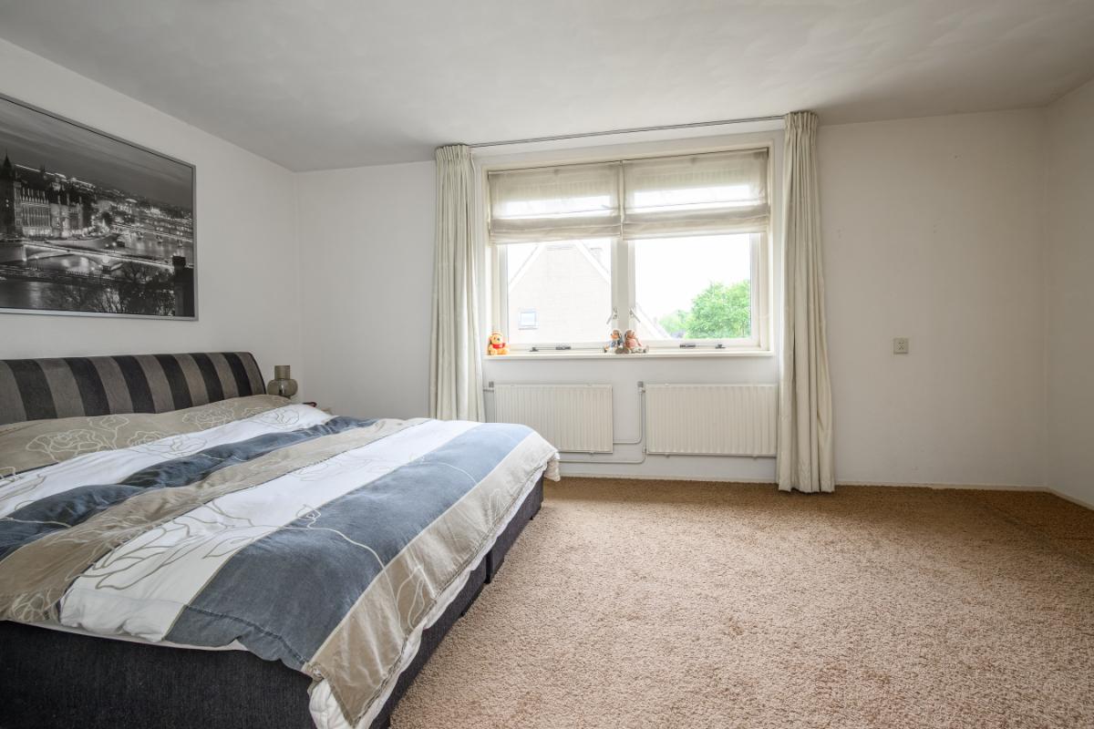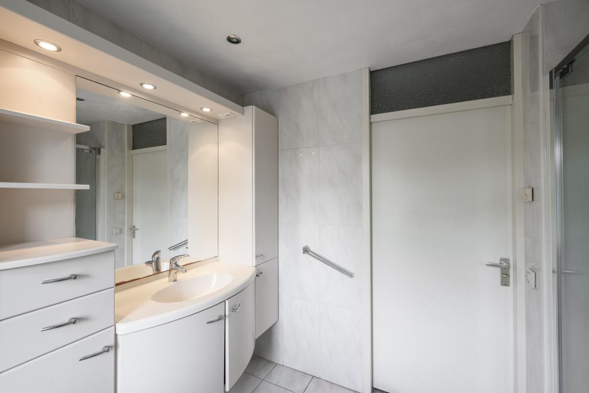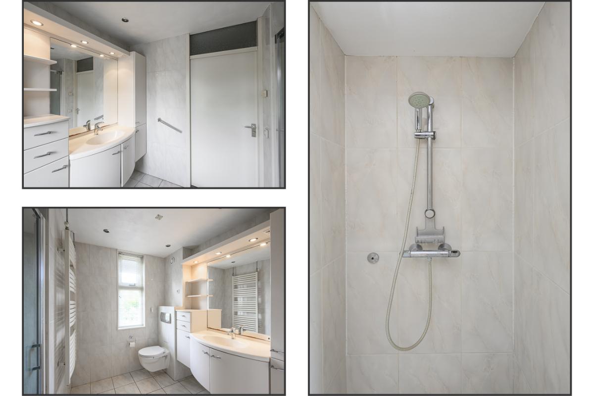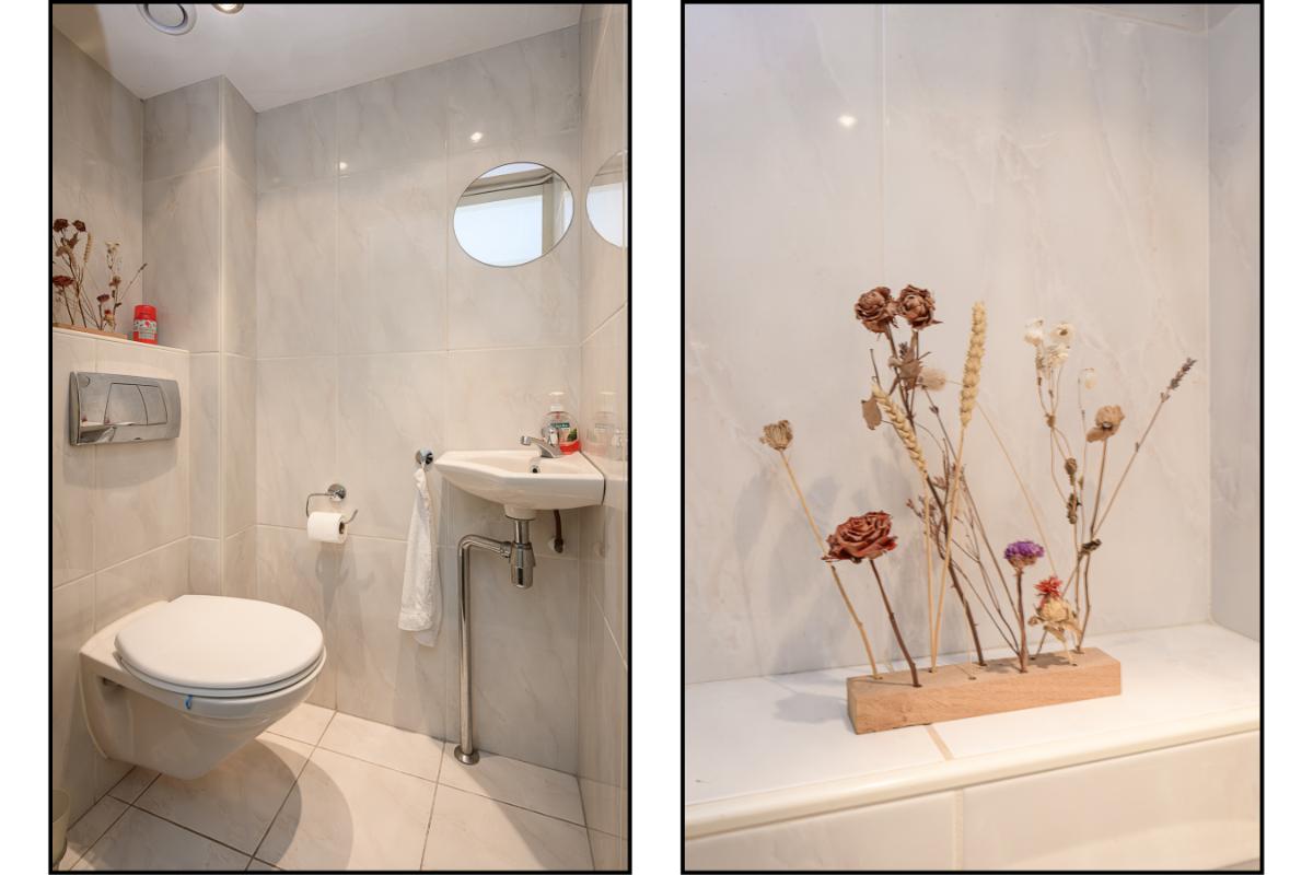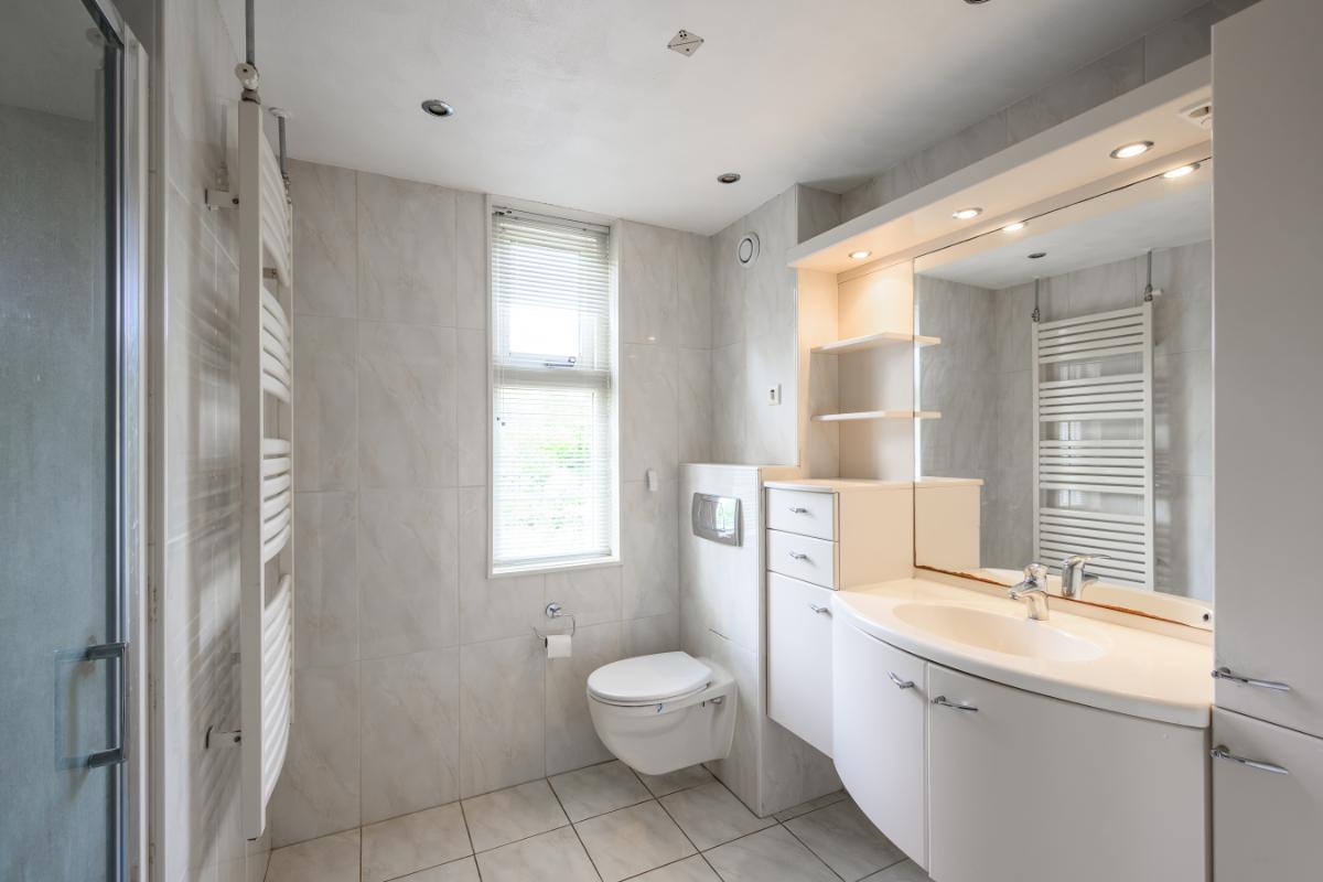 Eerste verdieping: overloop met toegang tot de aan de achterzijde gelegen ouderslaapkamer (v/h 2 kamers) en een tweede slaapkamer met wastafel aan de voorzijde van het woonhuis gelegen. De badkamer is voorzien van een douchecabine, hangend toilet, wastafelmeubel en mechanische afzuiging en design radiator;