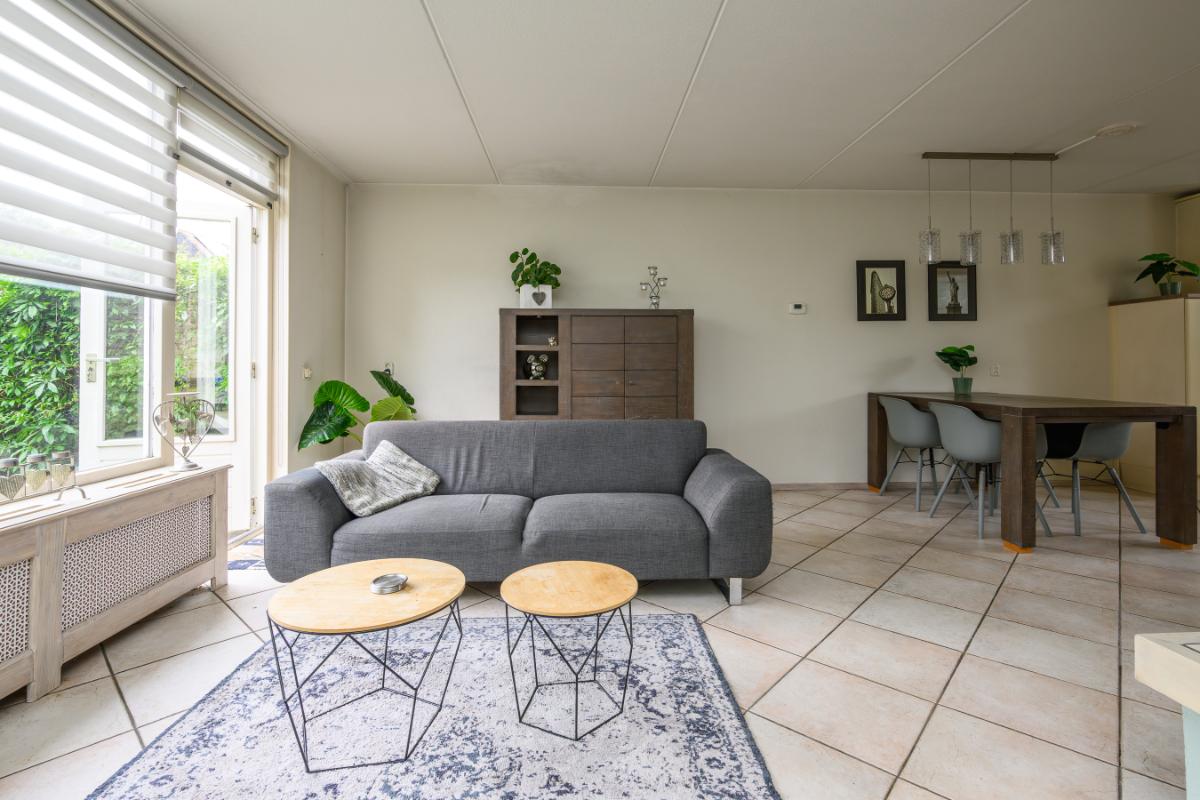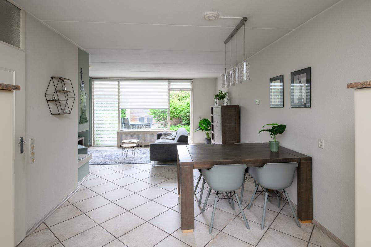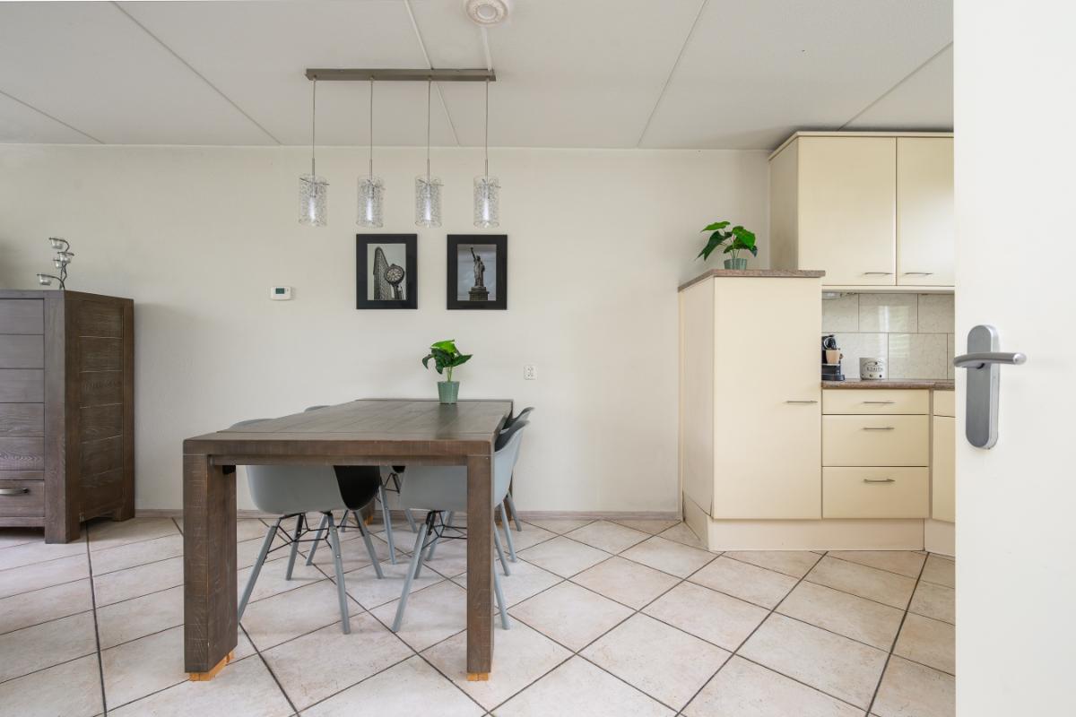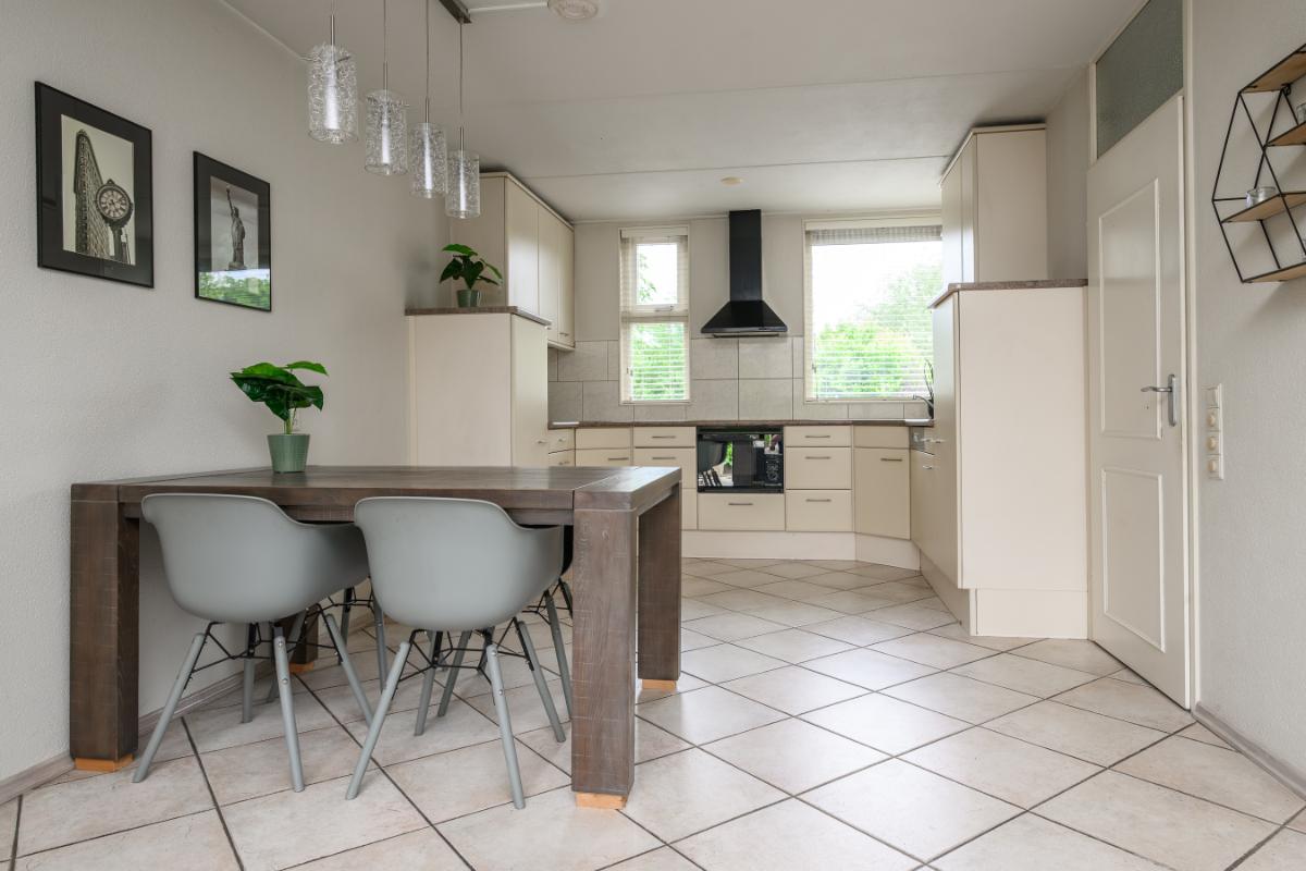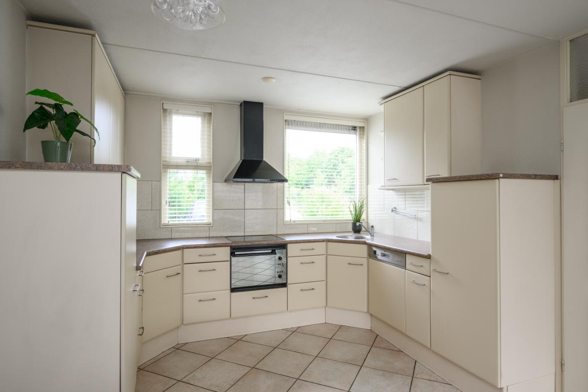 Aan de voorzijde van het woonhuis een open keuken, in U-opstelling en voorzien van diverse inbouwapparatuur w.o. een vaatwasmachine, keramische kookplaat, afzuigkap, elektrische oven en koelkast. Vanuit de woonkamer heeft men middels een tuindeur toegang tot de achtertuin, alwaar een stenen berging achterin de tuin is gesitueerd en een achterom;