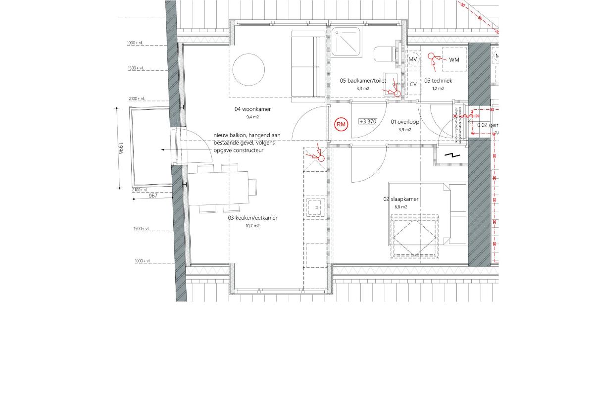 1e Verdieping: Entree, hal met meterkast en welke toegang geeft tot c.v.-wasruimte, badkamer met dakkapel, wastafel, toilet en douche en een slaapkamer met dakraam. Woonkamer met dakkapel, een open keuken (zelf te regelen) en een deur naar een balkon;