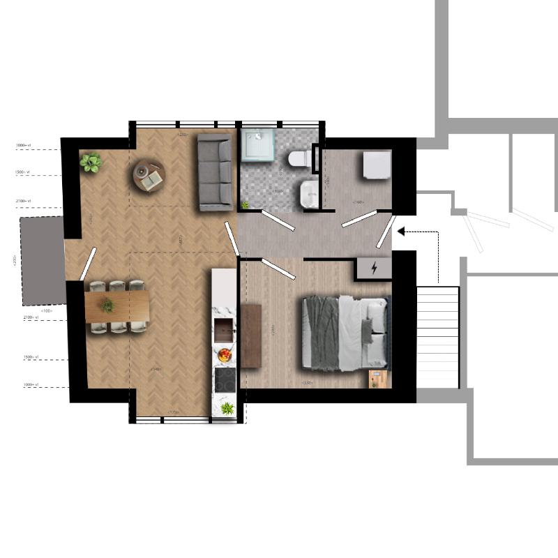 Op de eerste verdieping (links-boven) gelegen twee-kamer appartement met een woonoppervlakte (GBO) van 36,2 m2, een balkon op het westen gelegen en een parkeerplaats.