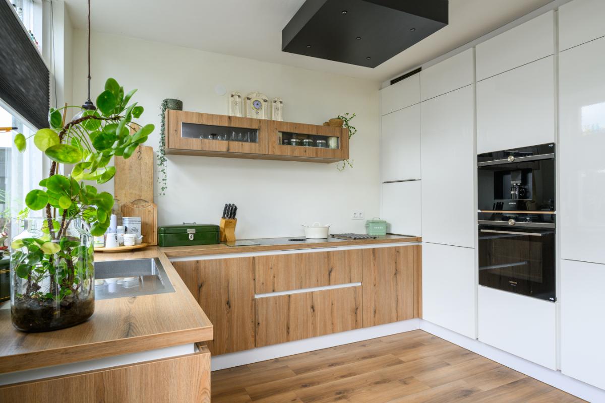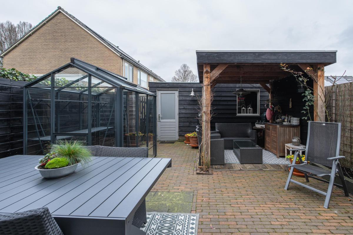 Begane grond: Entree, hal met moderne meterkast, modern vrijdragend toilet en trapkast. Sfeervolle woonkamer met vloerverwarming, een moderne open keuken, v.v. diverse luxe inbouwapparatuur (2022), w.o. een drinkwater zuiveringsinstallatie. Openslaande deuren naar de besloten en gezellige tuin met achterom, veranda, kas en een ruime stenen berging;