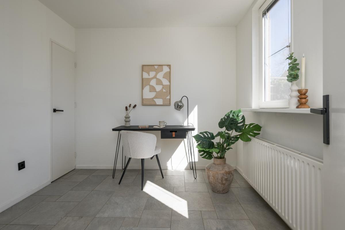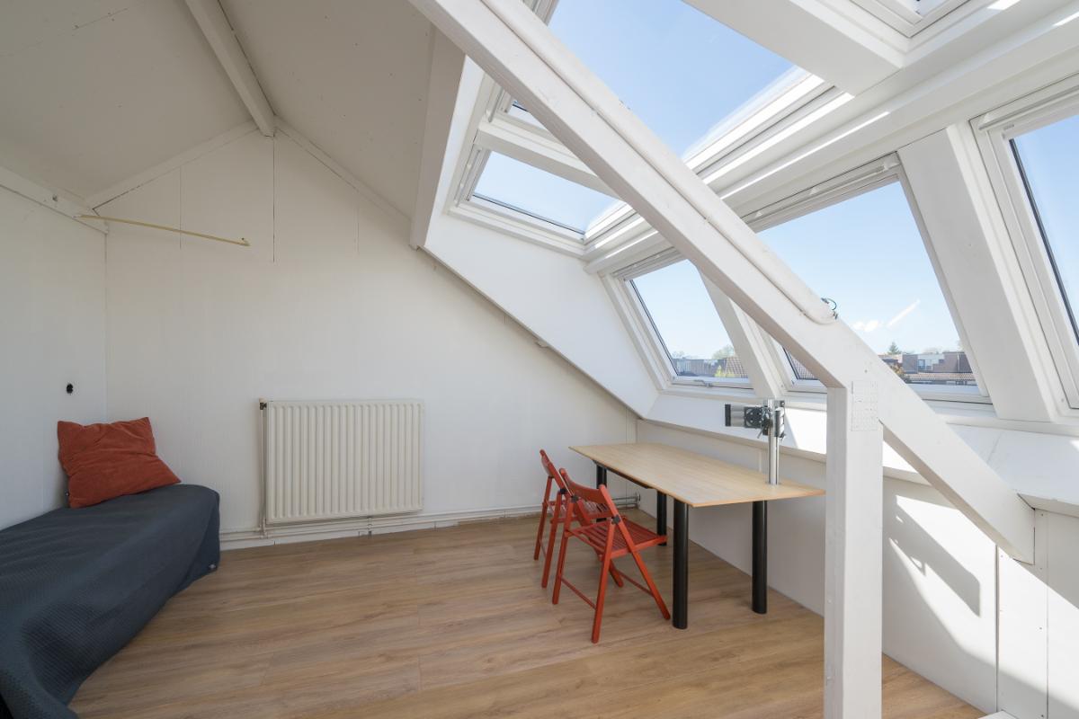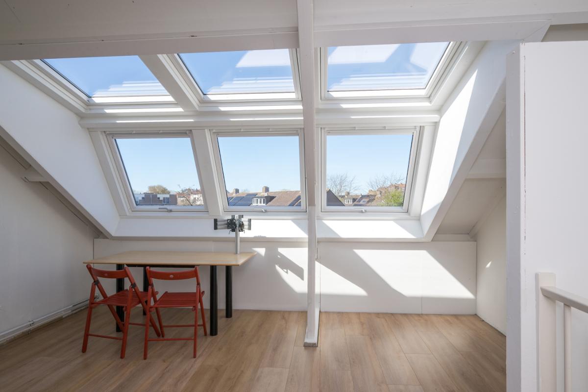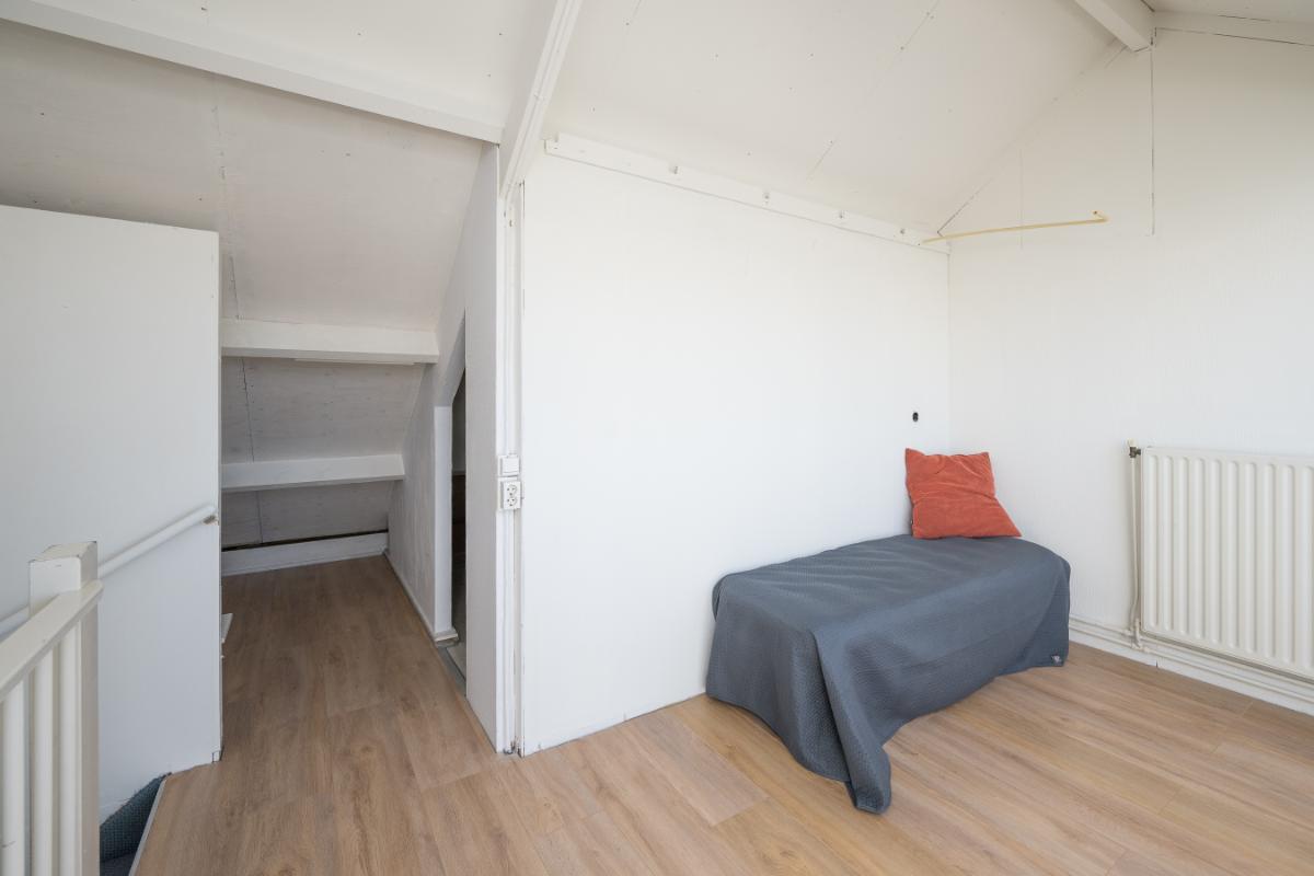 Tweede verdieping: Via vaste trap komt men in een grote openruimte met zeer fraaie dakkapel (2023) te gebruiken als kantoor of slaapkamer. Deze ruimte moet nog wel gestuukt en geschilderd worden. Verder is er een wasruimte en hier bevindt zich de opstelling c.v. ketel (2023) en aansluiting voor was-apparatuur. Verder voldoende bergruimte achter de knieschotten;